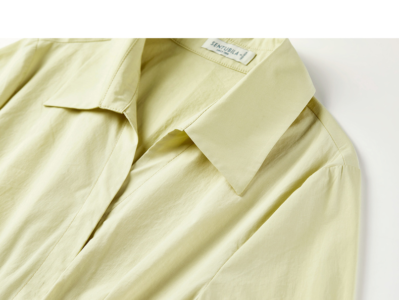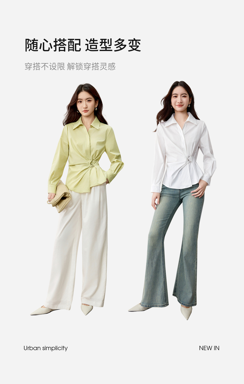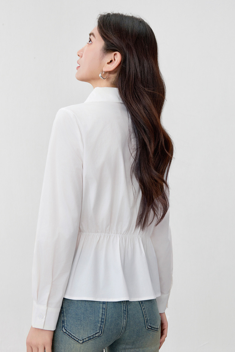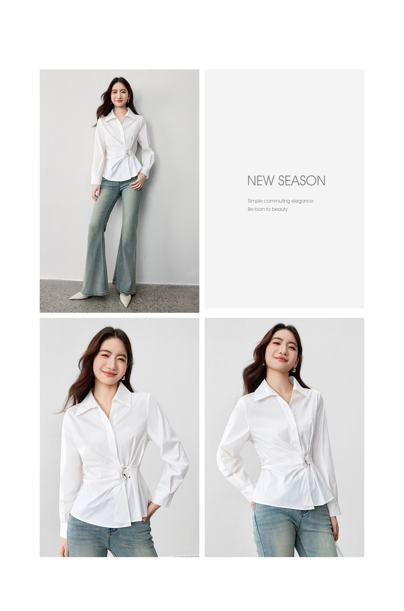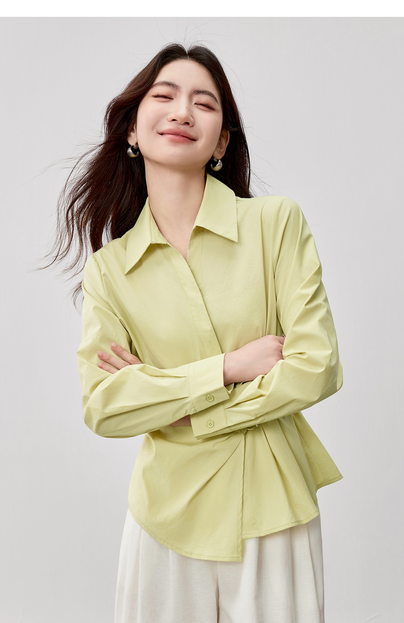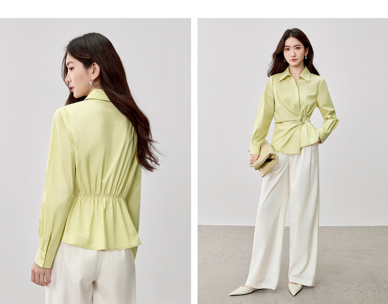 【内购】【收腰显瘦】通勤设计感翻领不对称收褶环扣设计后腰松紧长袖衬衫-W53CA2861