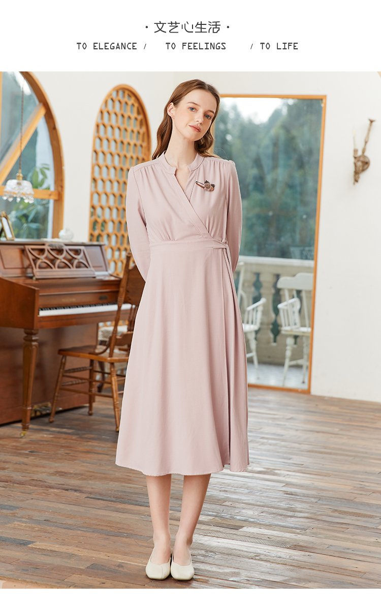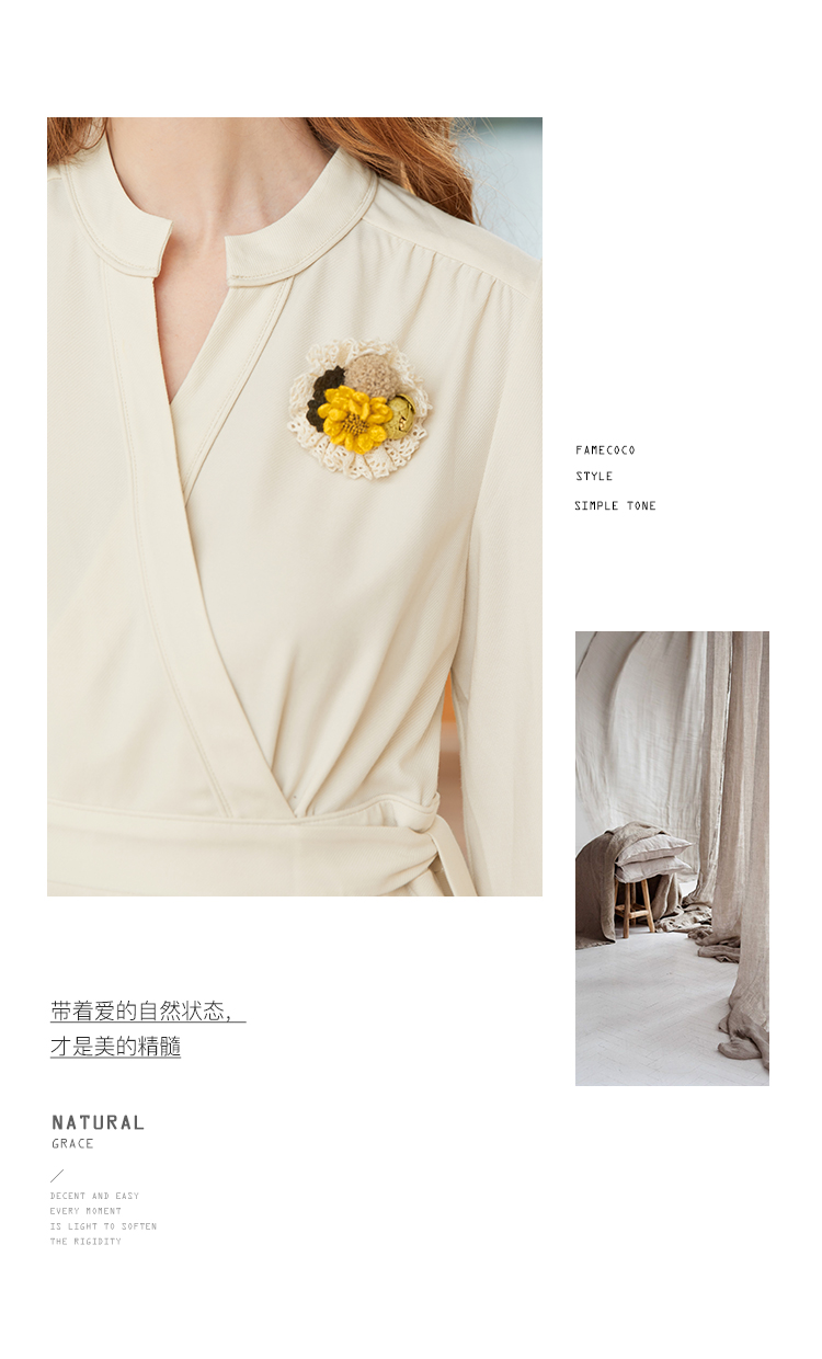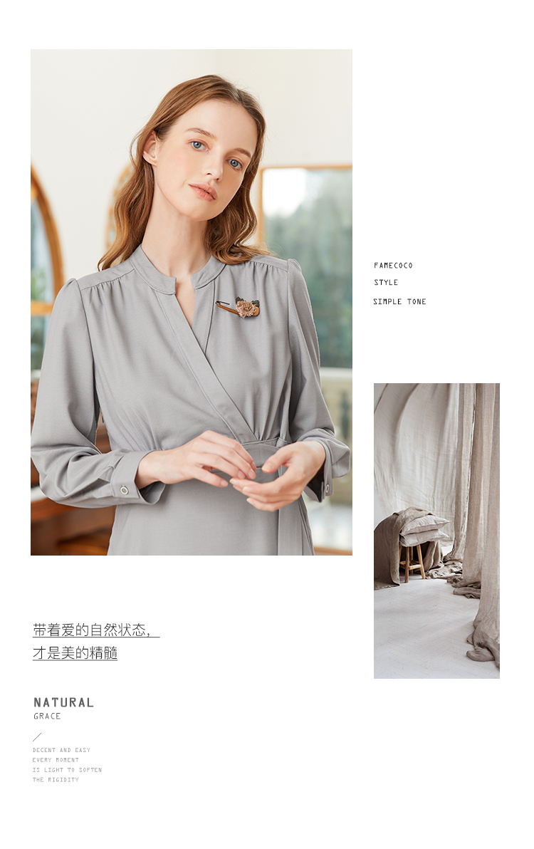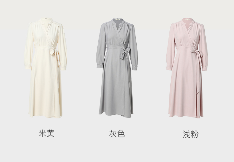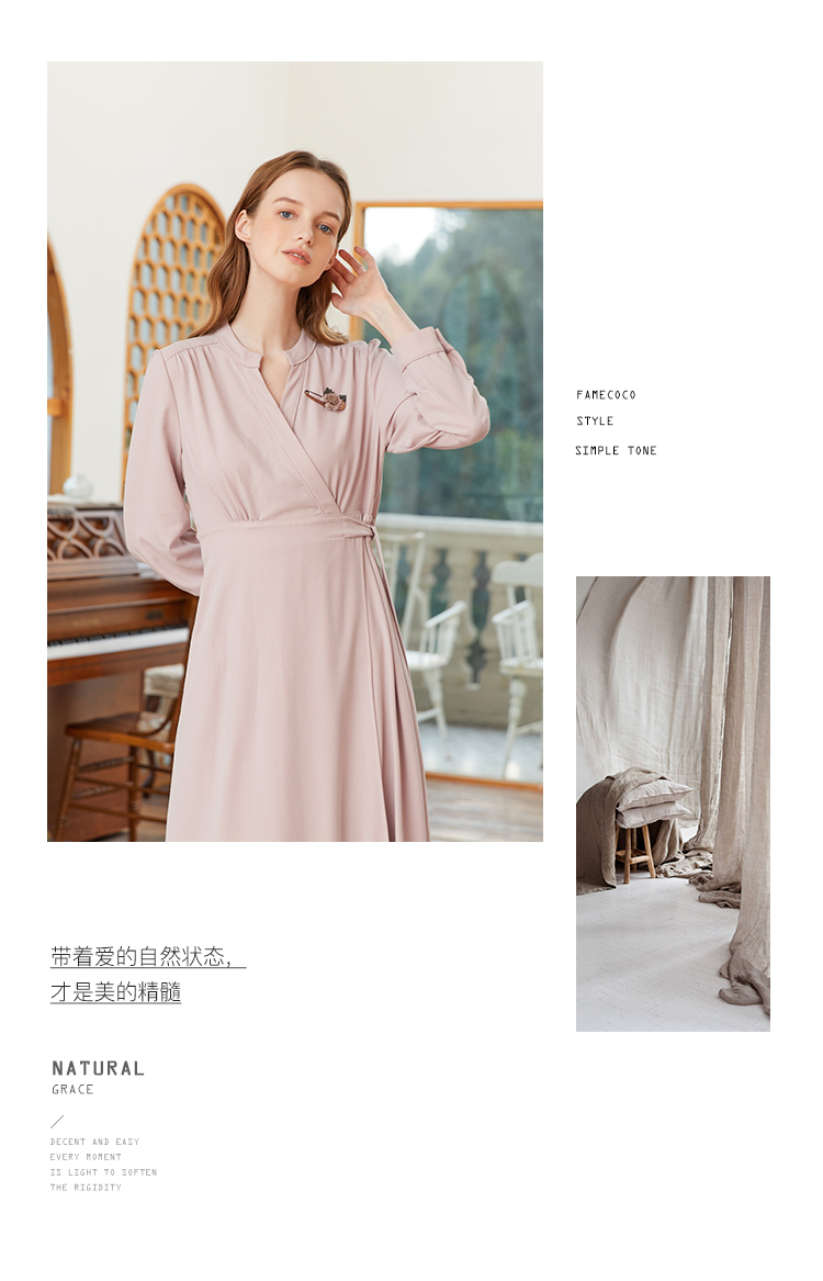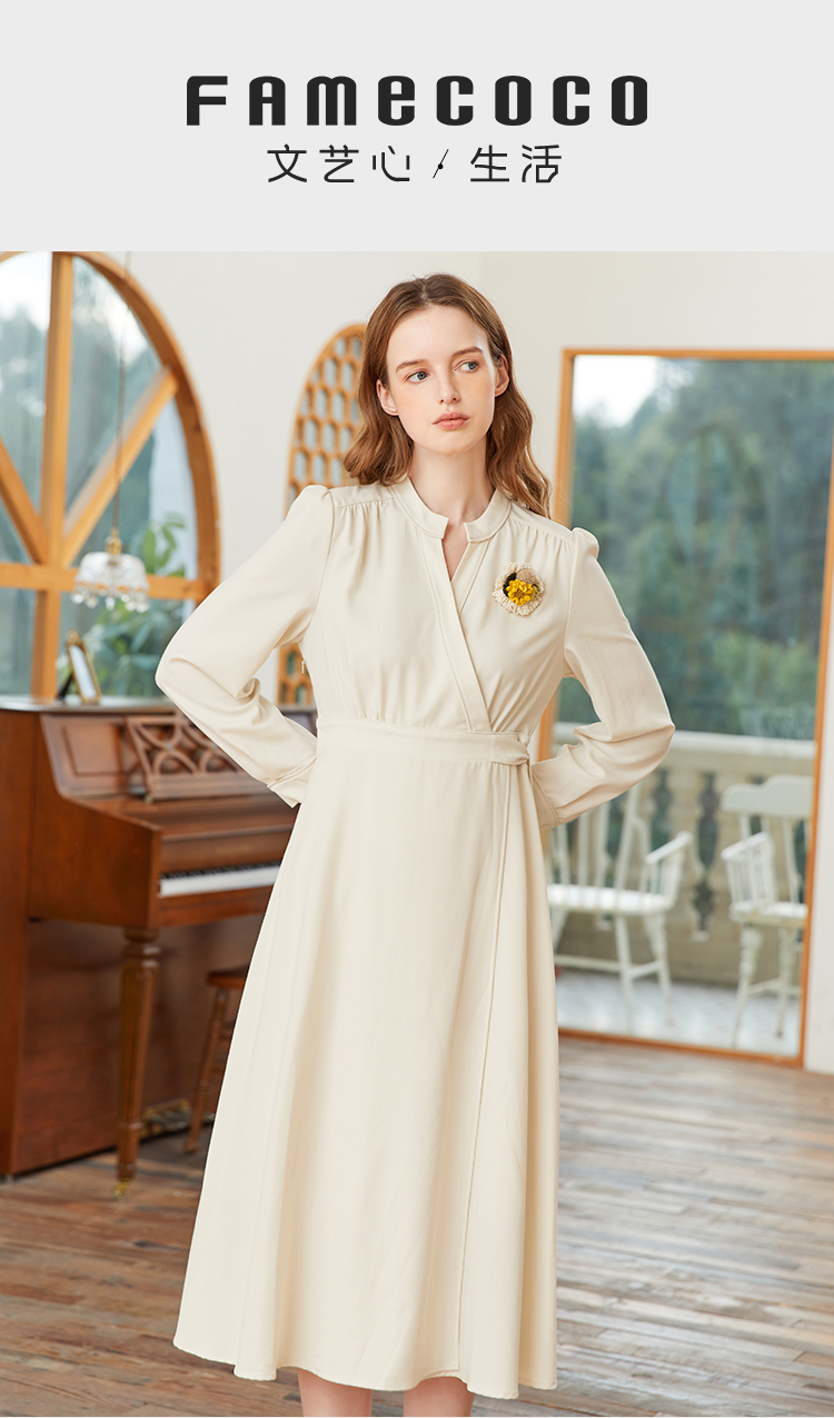 famecoco范可儿交叉v领连衣裙女春季一片式系带收腰长裙FAB1FA017