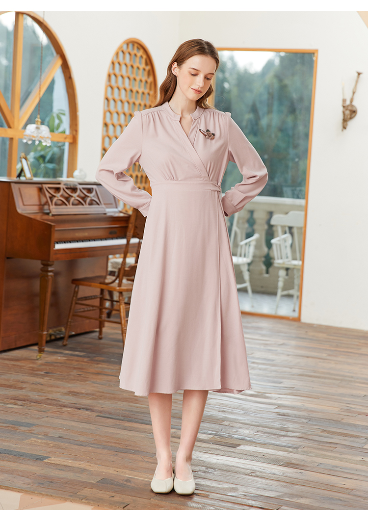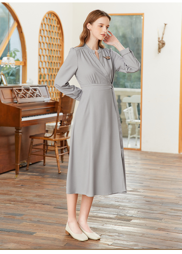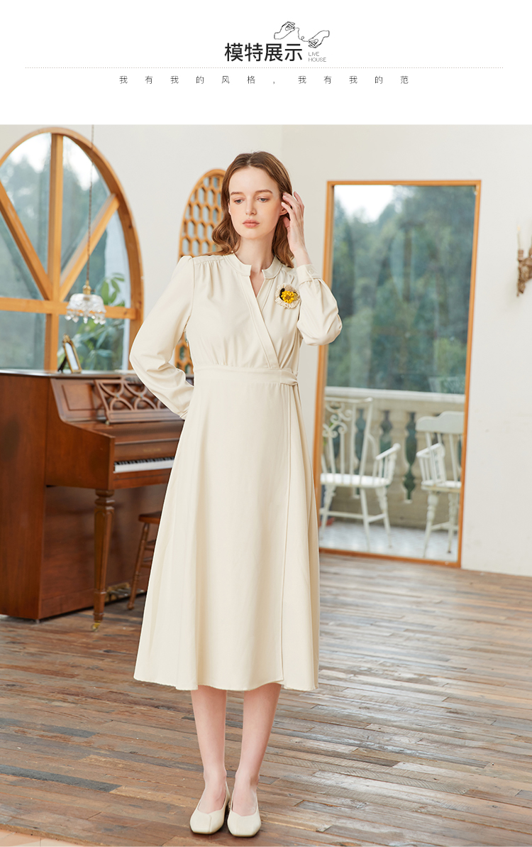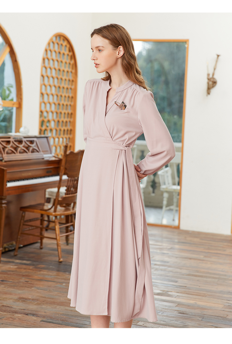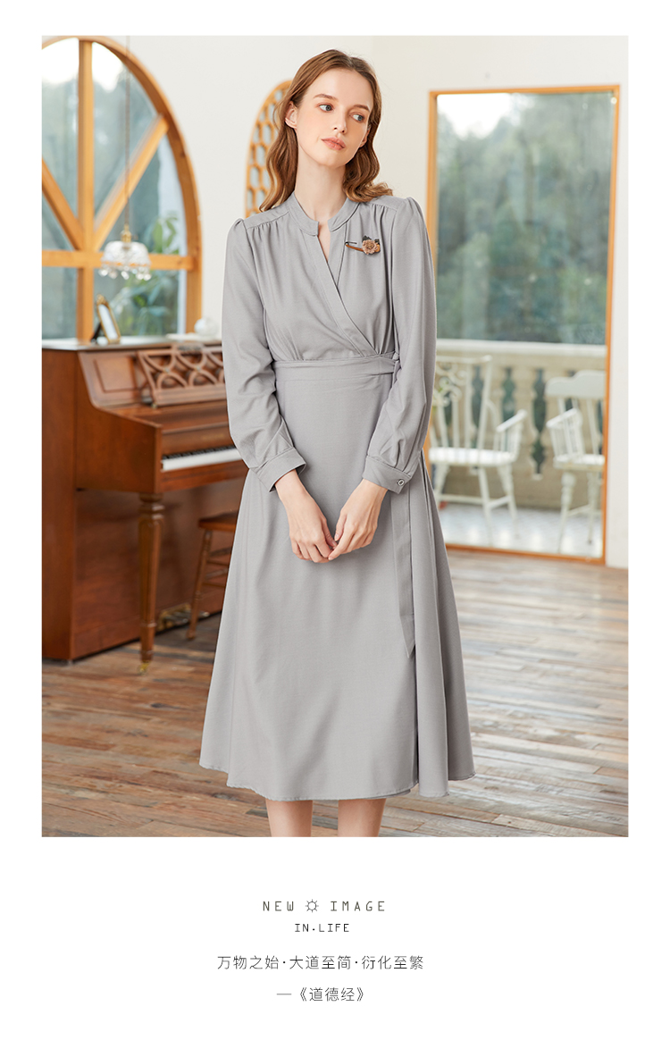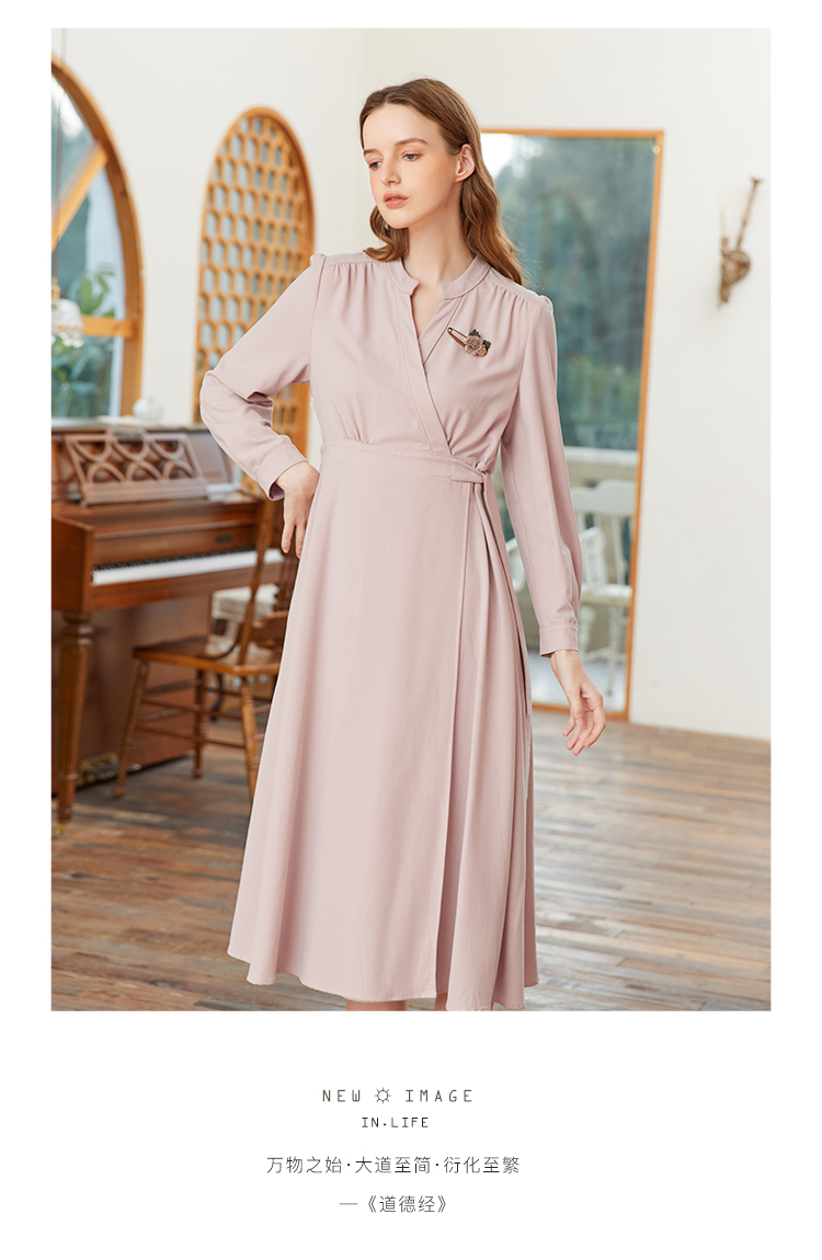famecoco范可儿交叉v领连衣裙女春季一片式系带收腰长裙FAB1FA017