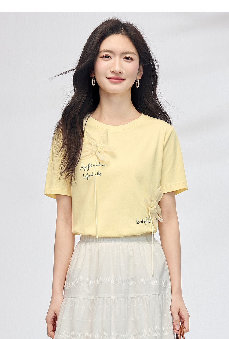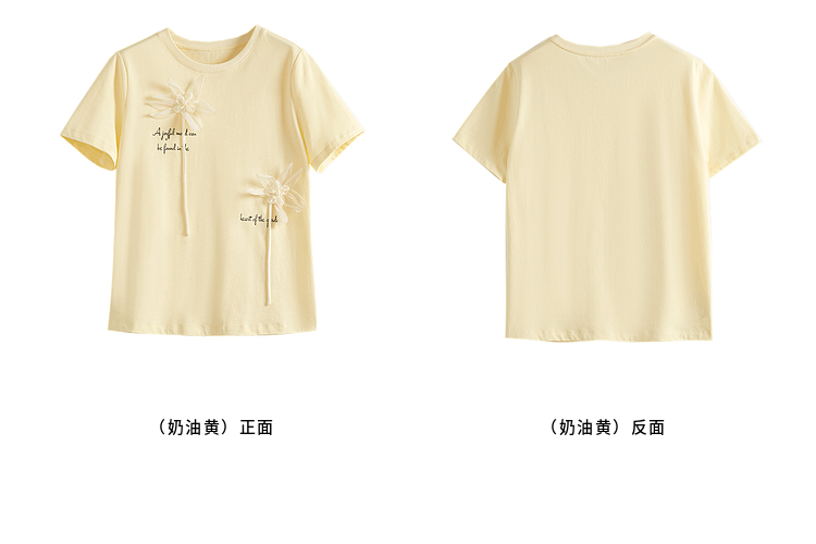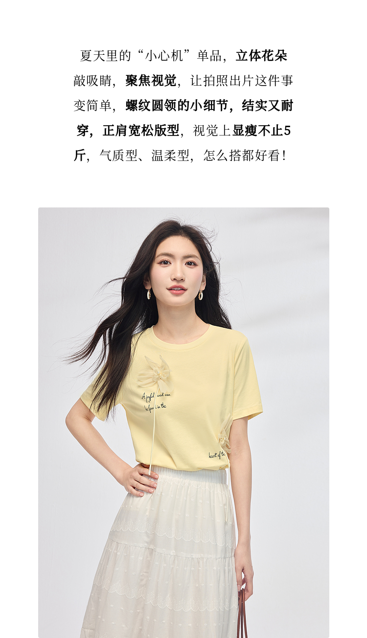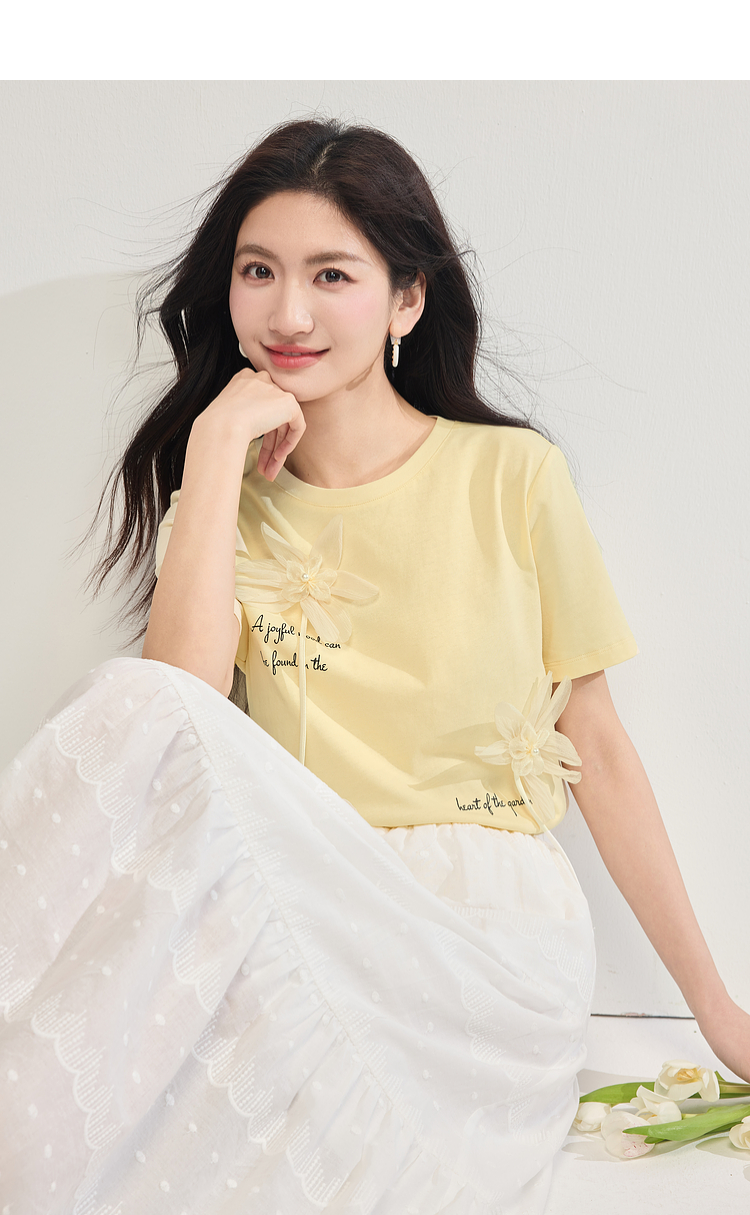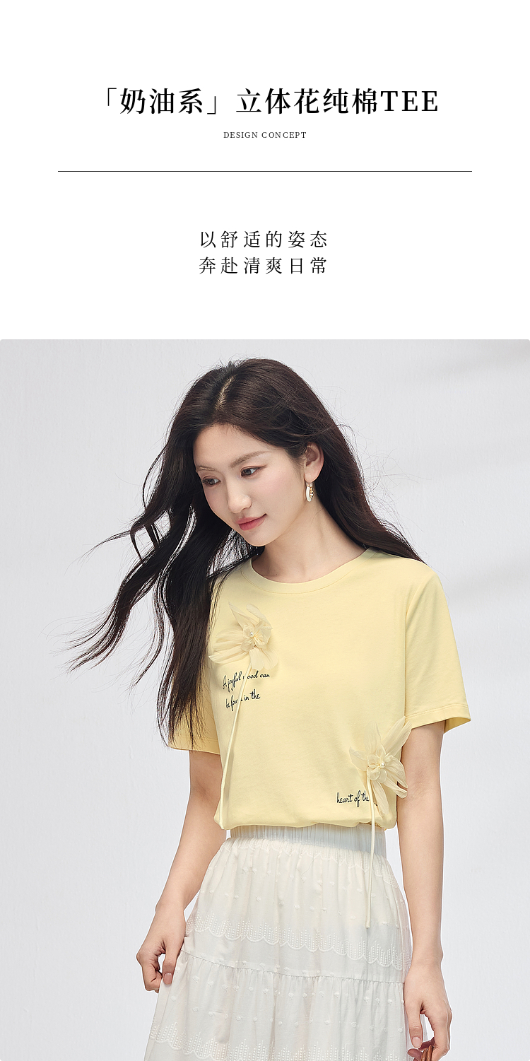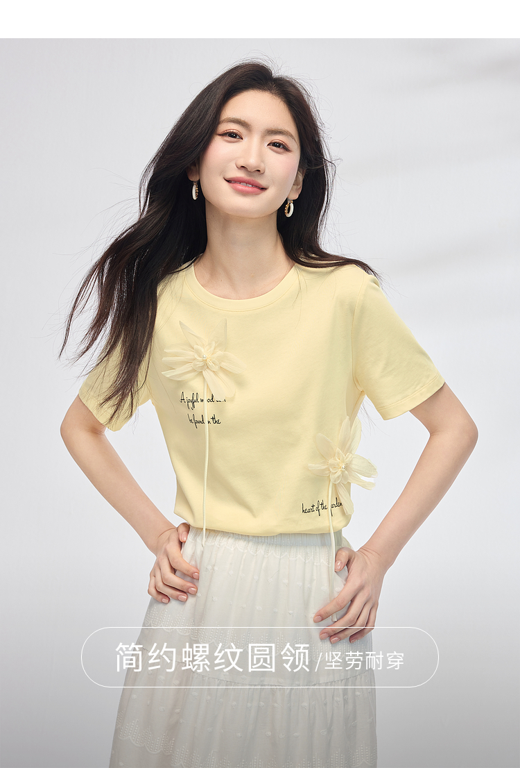 【专属特价】熙世界设计感立体花朵正肩T恤短袖休闲圆领纯棉上衣女2025夏新款