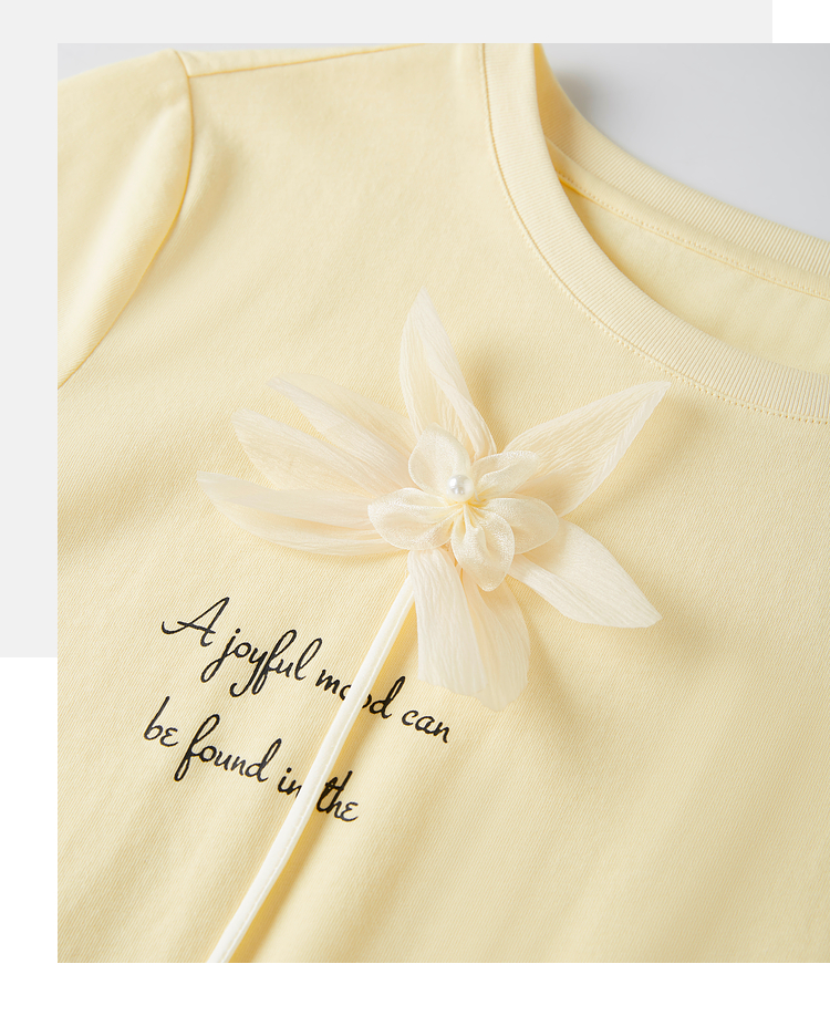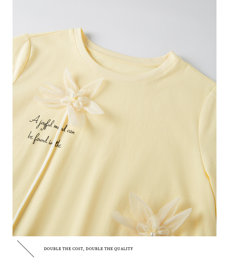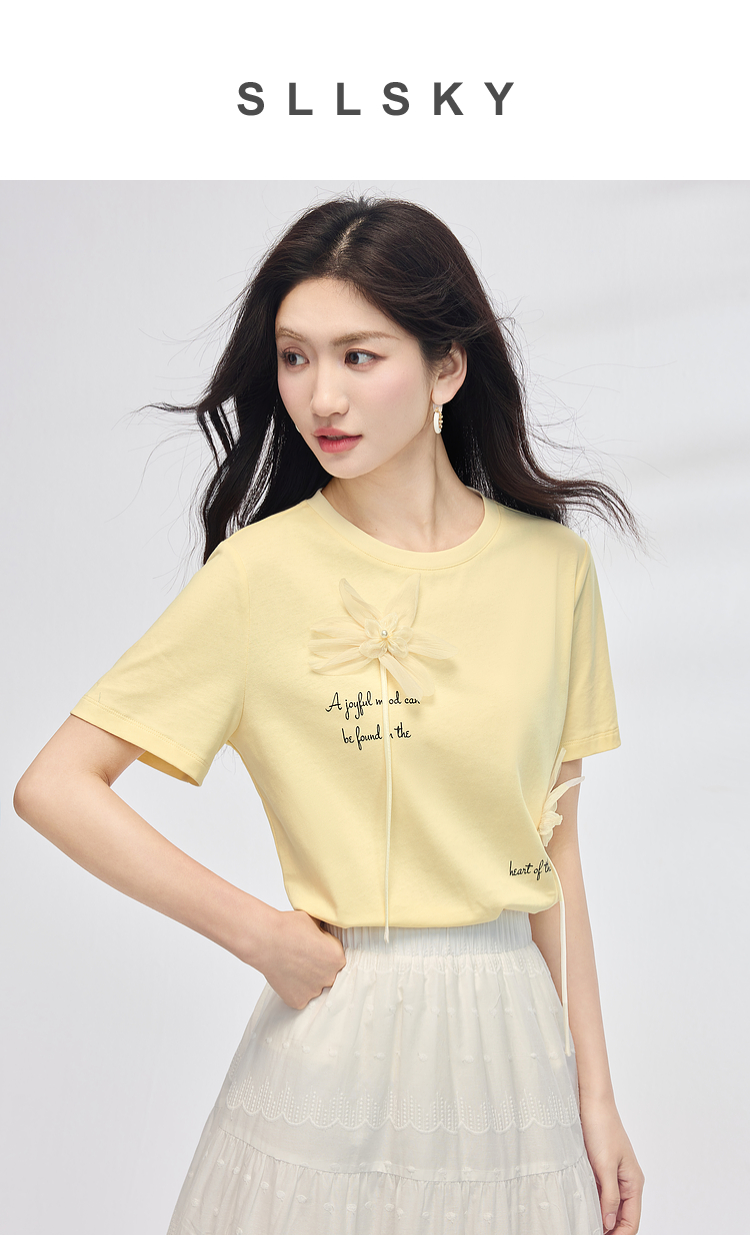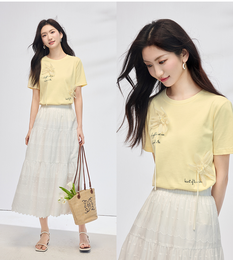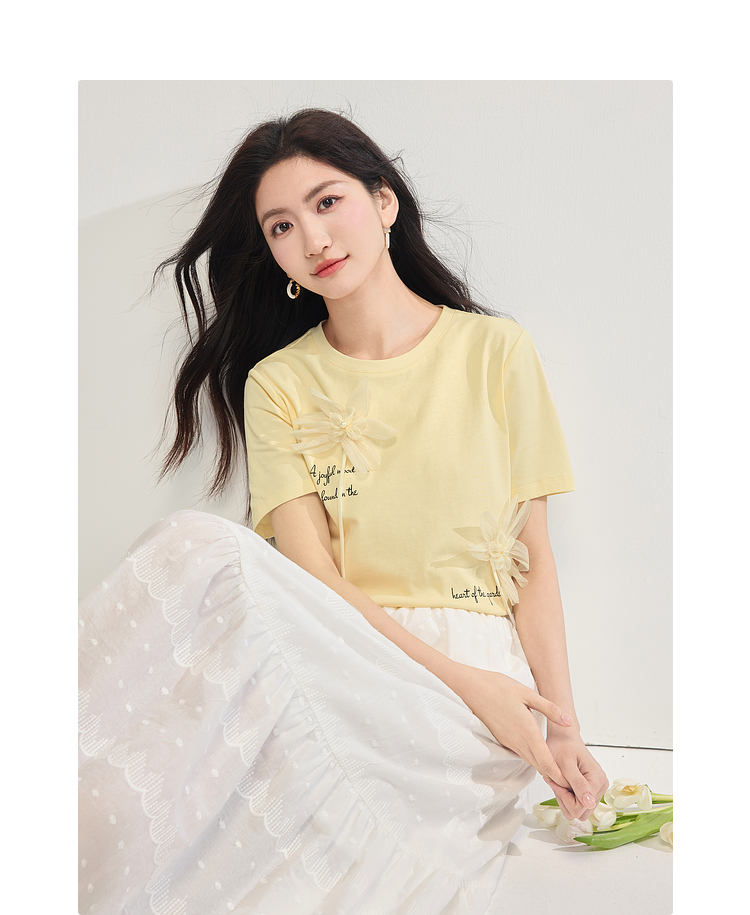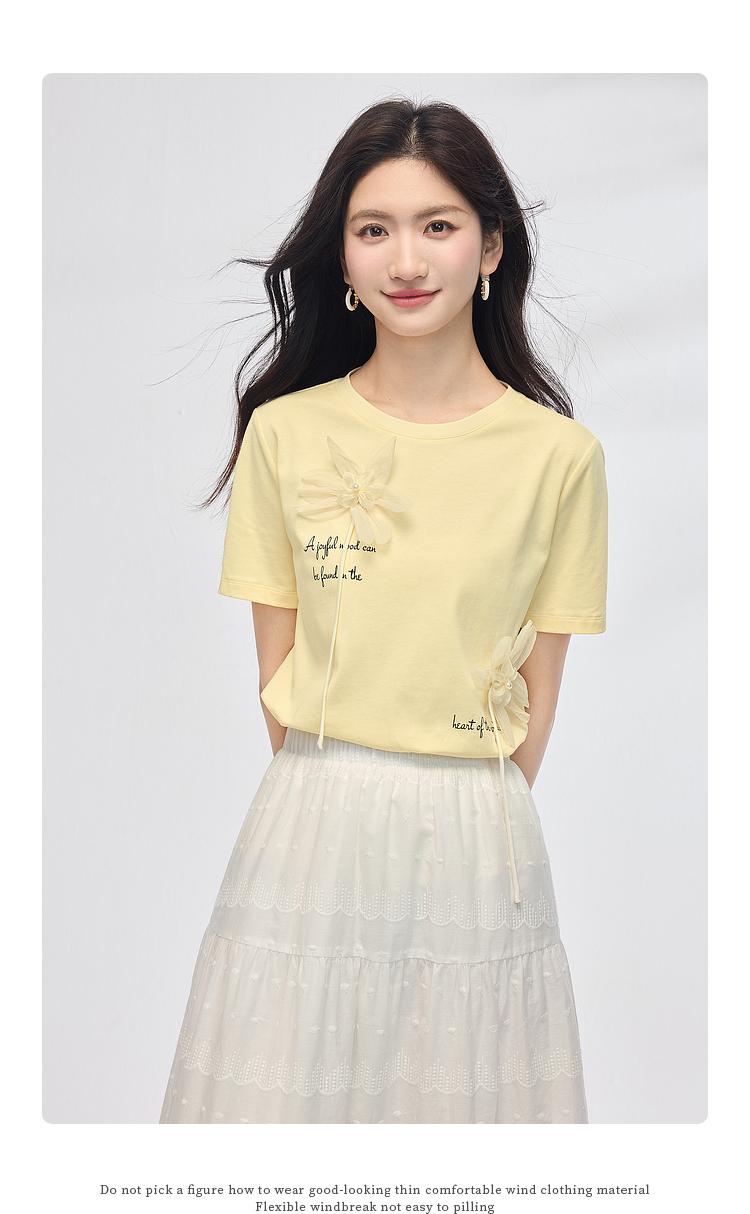 【专属特价】熙世界设计感立体花朵正肩T恤短袖休闲圆领纯棉上衣女2025夏新款