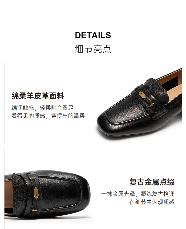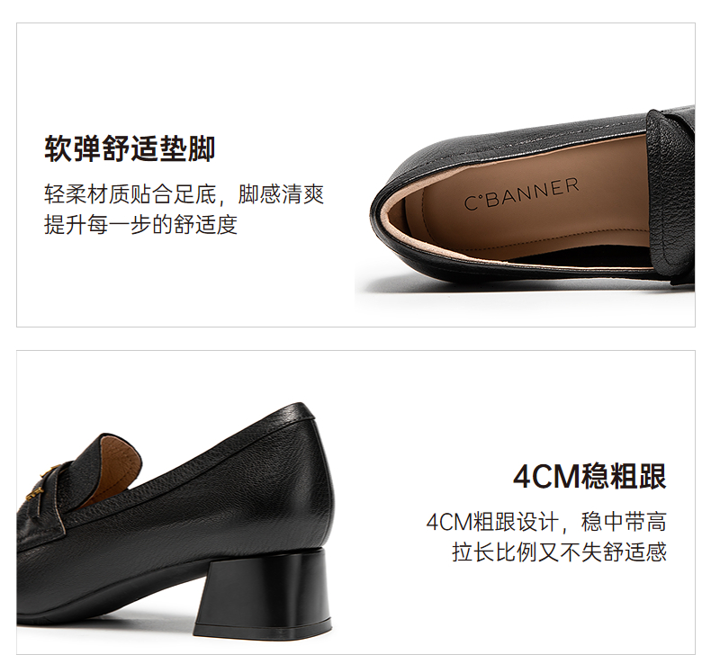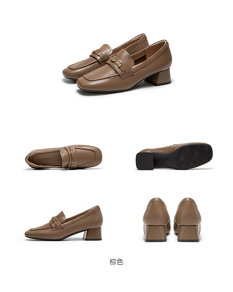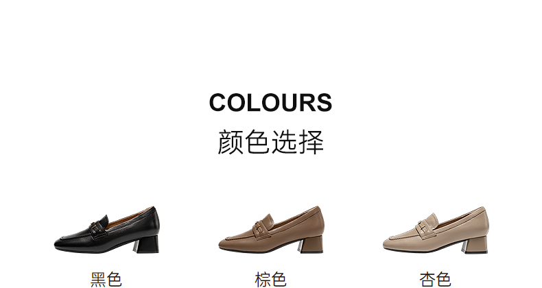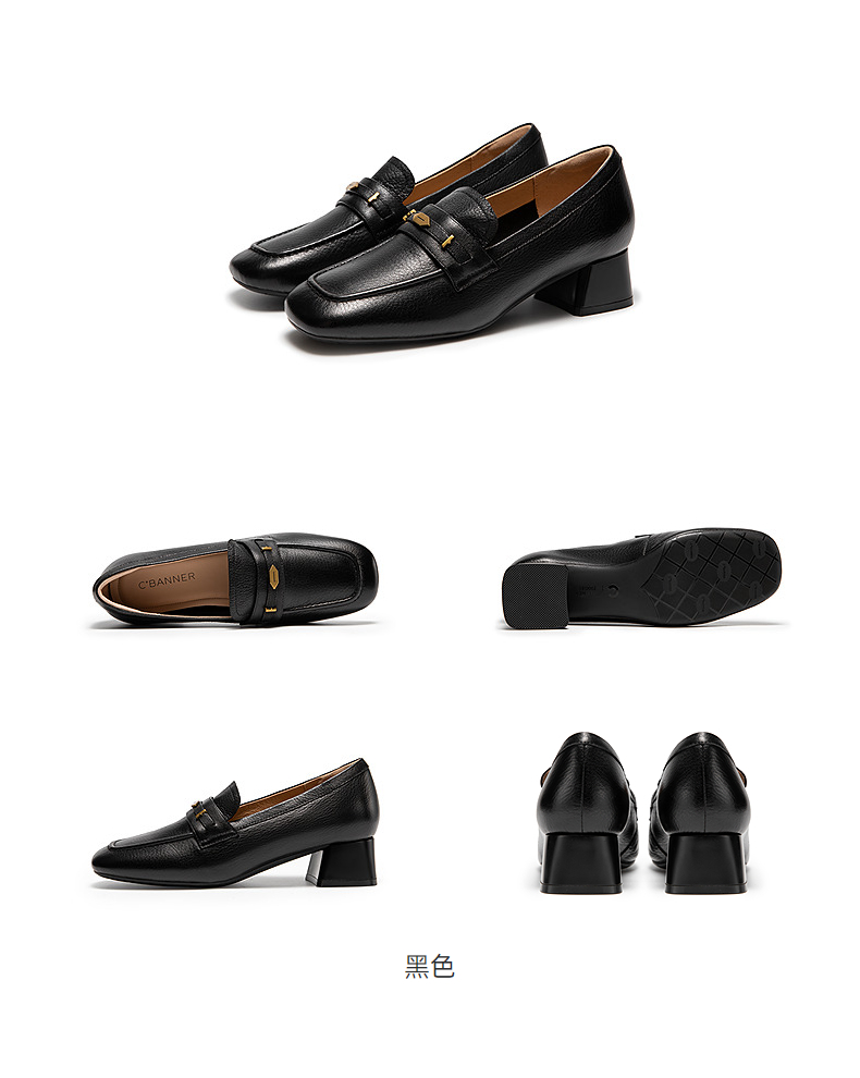 千百度羊皮粗跟乐福鞋女通勤高跟鞋舒适单鞋A25480804