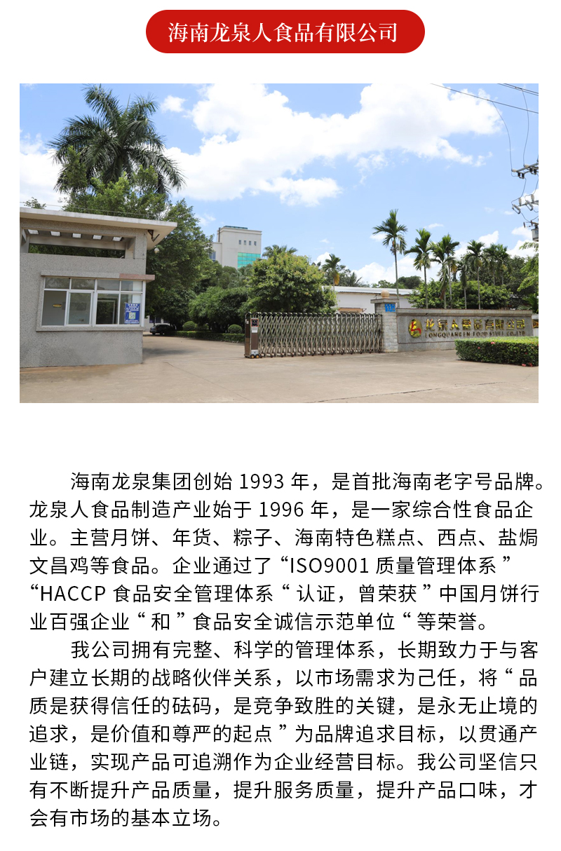 龙泉人始创于1993年,是首批海南老字号品牌。龙泉人食品制造产业始于1996年,隶属于海南龙泉集团有限公司,是一家综合性食品企业,公司占地33亩,主营月饼、年货、粽子、盐焗文昌鸡、海南伴手礼等食品。
