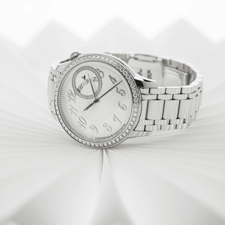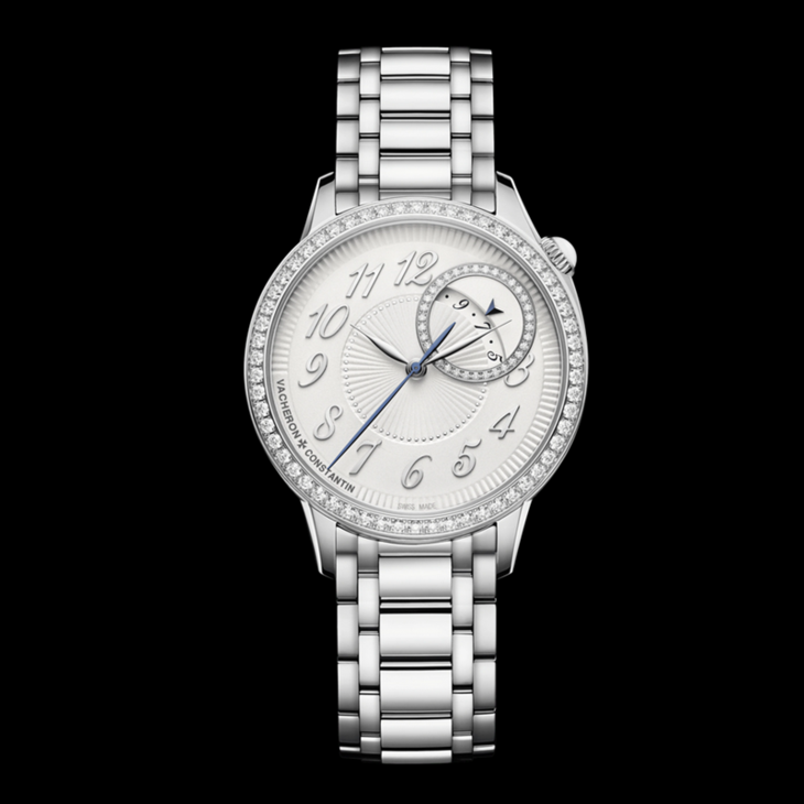 镜面材质 | 蓝宝石水晶玻璃 | 表盘 | 精钢表壳 精钢表圈镶嵌58颗圆形切割钻石和一颗弧形切割月光石,1点与2点间的日期显示盘的圆环外圈缀有34颗圆形切割钻石 表冠镶嵌一颗月光石 白色表盘 小时, 分钟,中央秒针 停秒装置, 日期显示 |