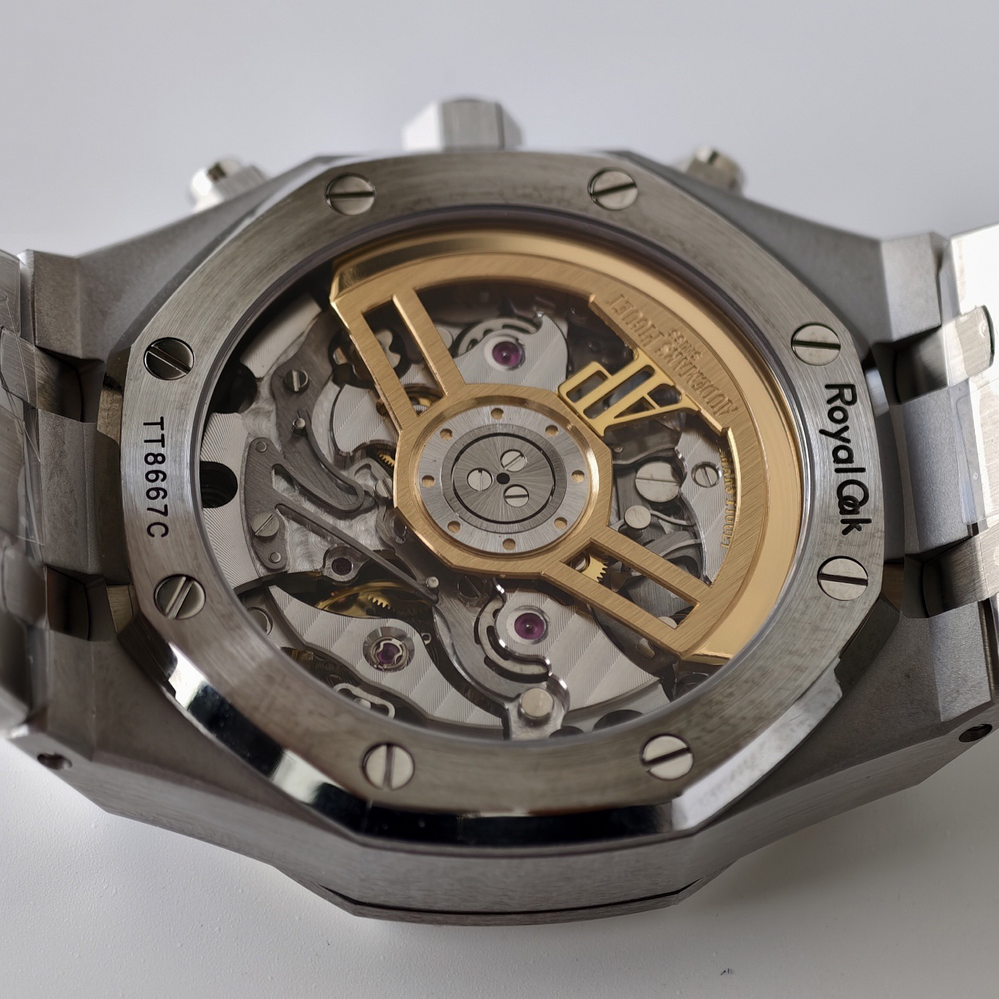 [Case] The 41MM golden ratio case inherits the iconic octagonal contour of the Royal Oak tree, and is alternately polished with satin brushed and polished, creating a three-dimensional texture with a combination of matte and glossy surfaces. Paired with anti glare sapphire crystal and transparent design, with a screw in crown. The collision between classic and modern is evident between the edges and corners.