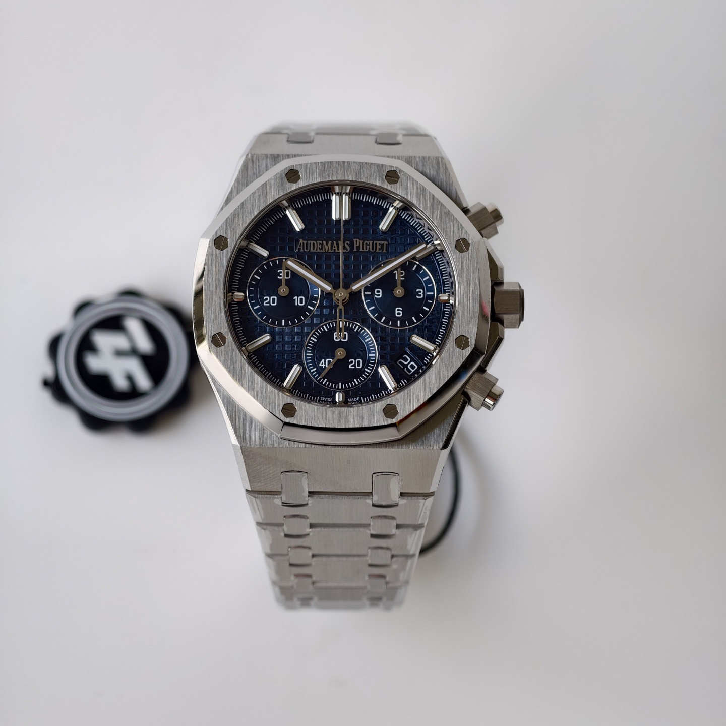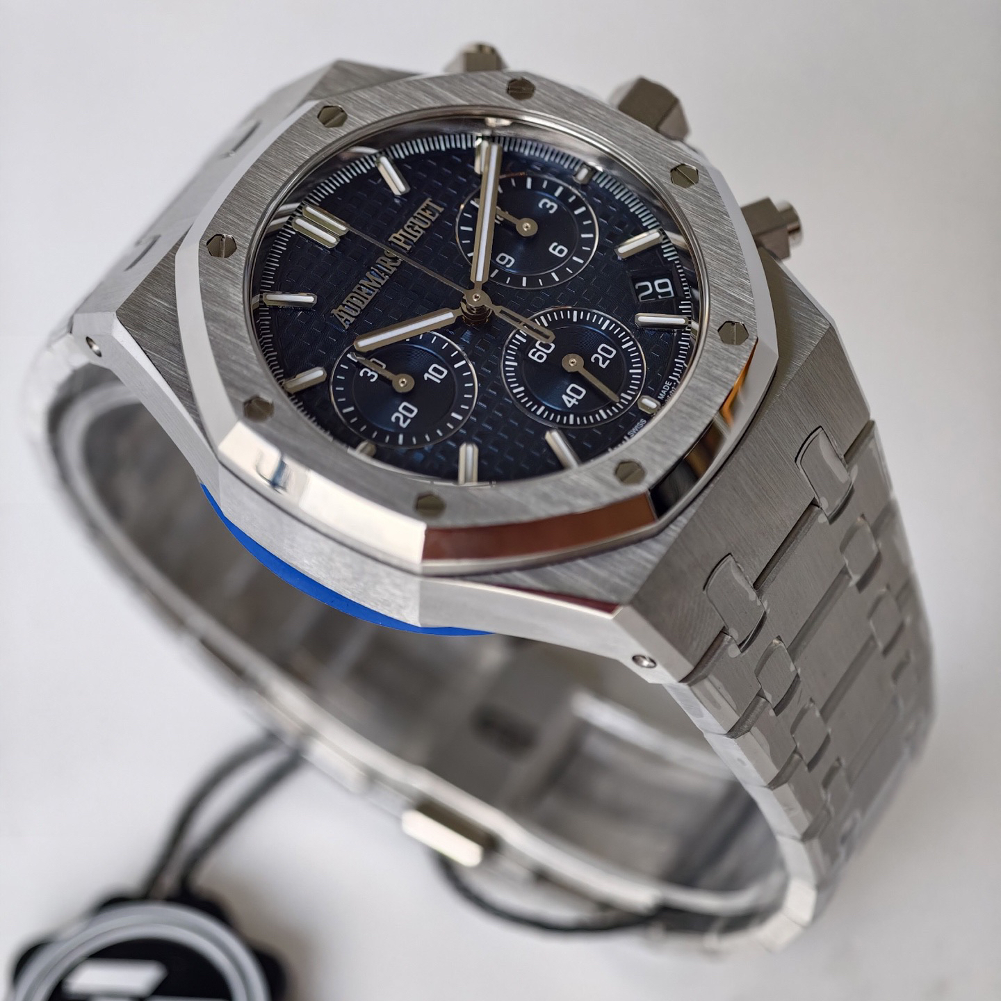 【表盘】标志性“Grande Tapisserie”大格纹如深海波纹立体铺展,特别是夜色蓝的深邃底色在光影下流转渐变光泽。(ZF匠心制作的蓝盘是全市场唯一一家与正品无色差的)其中3、6、9点对称布局的阶梯式下沉副盘,立体荧光时标与皇家橡树指针填充夜光物料,防眩光蓝宝石表镜下,白昼黑夜皆能精准读时。