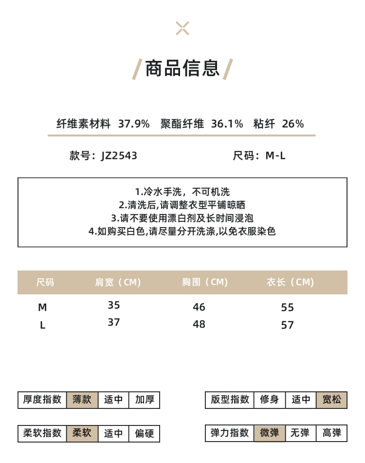面料成分:纤维素材料37.9%、聚酯纤维36.1%、粘纤26%