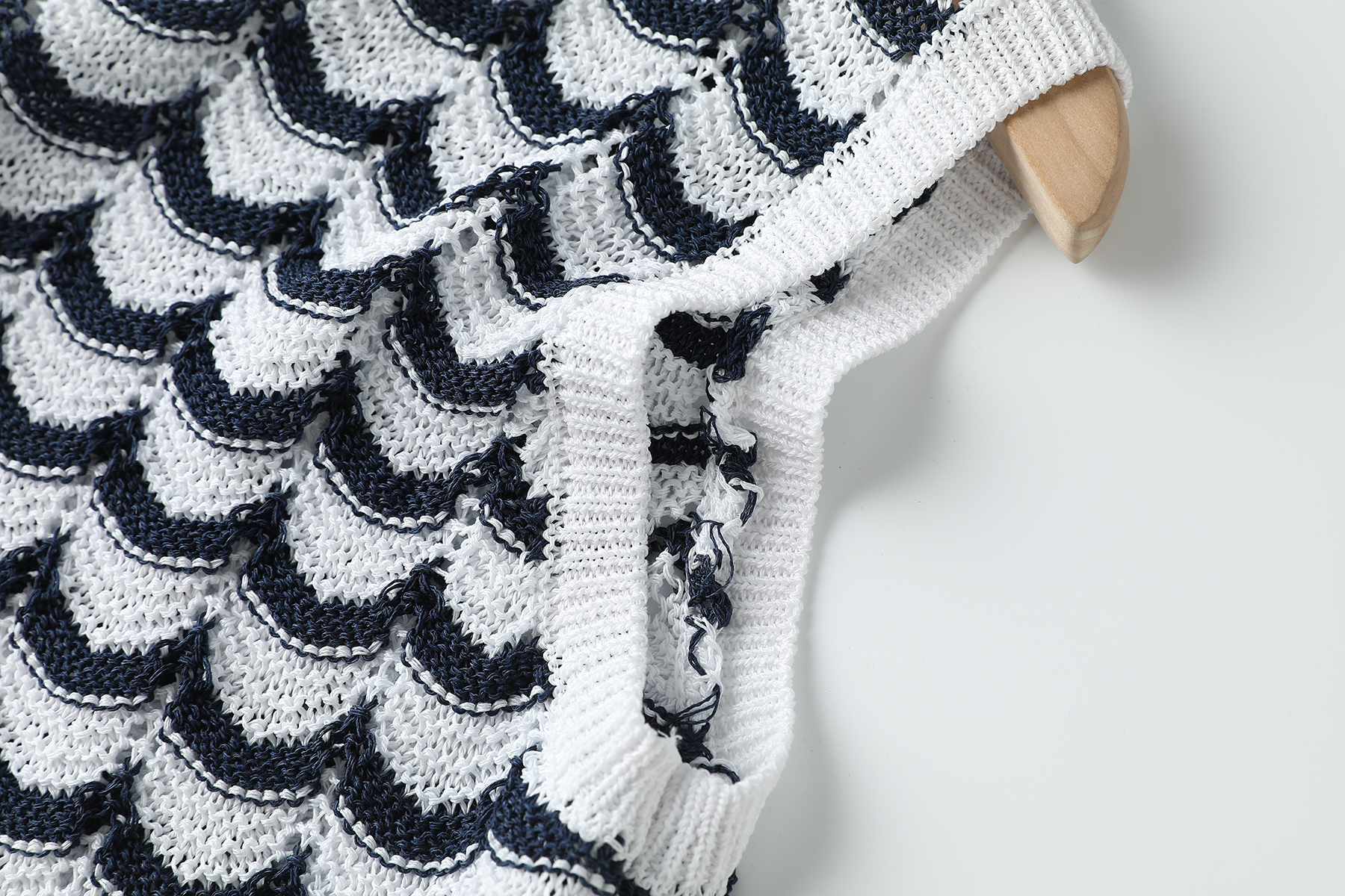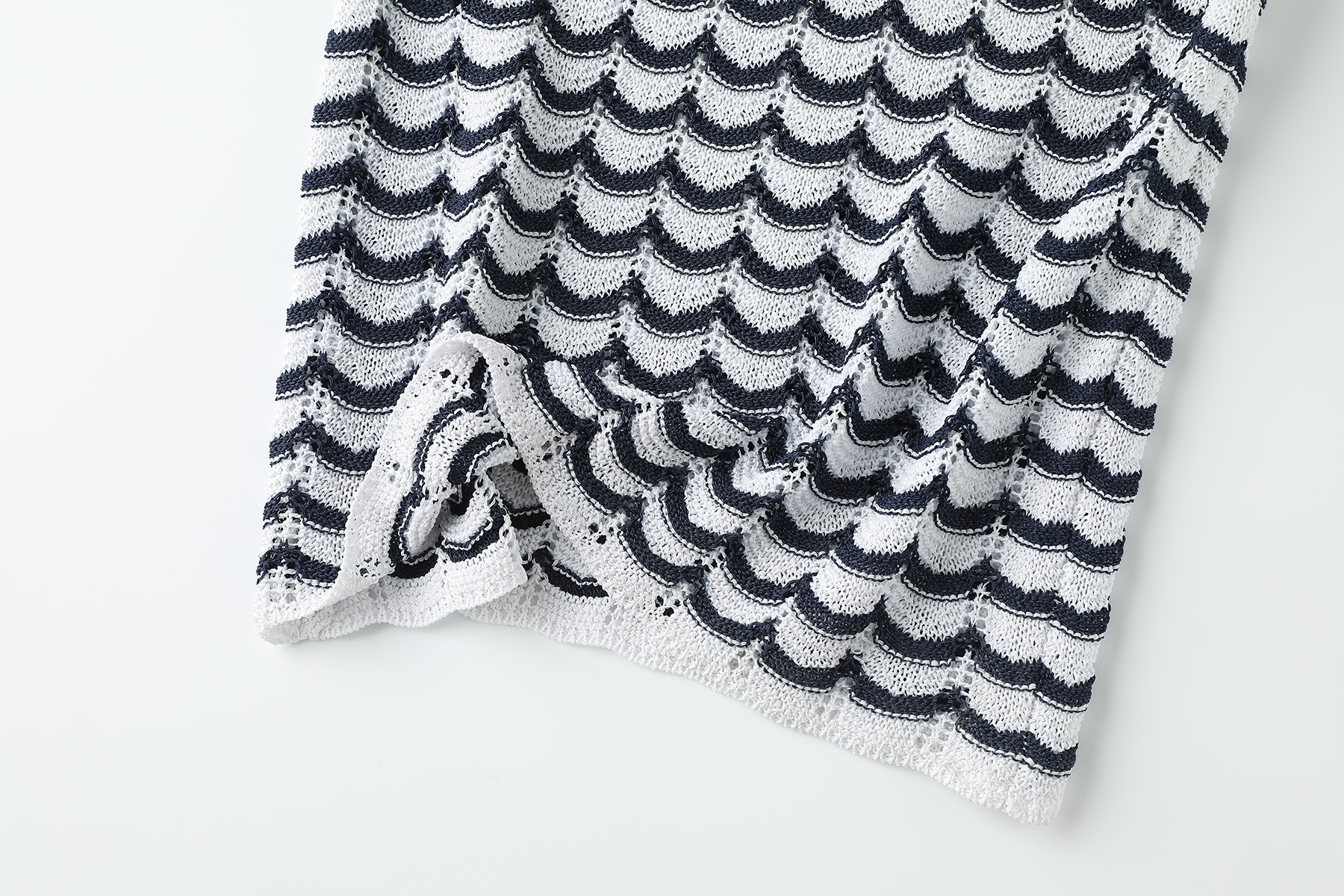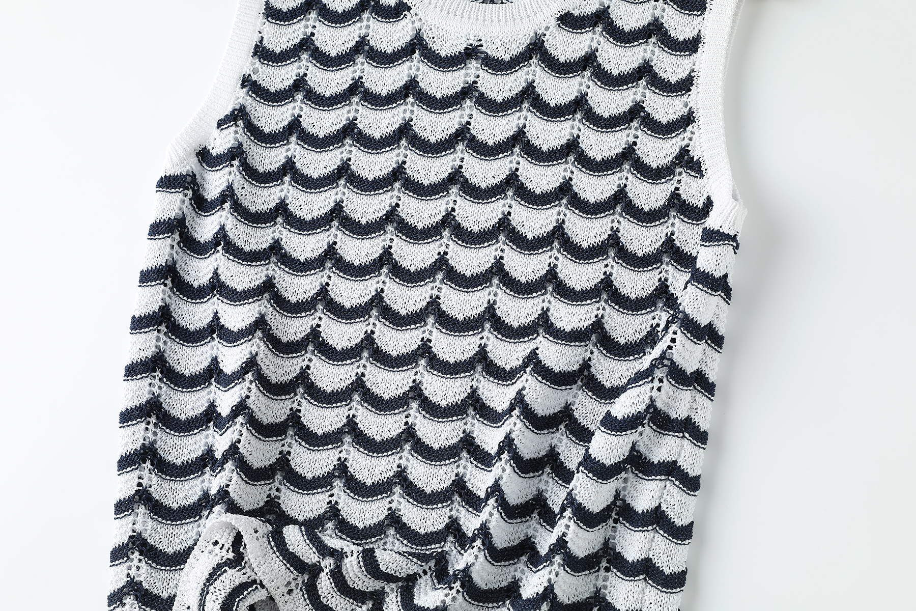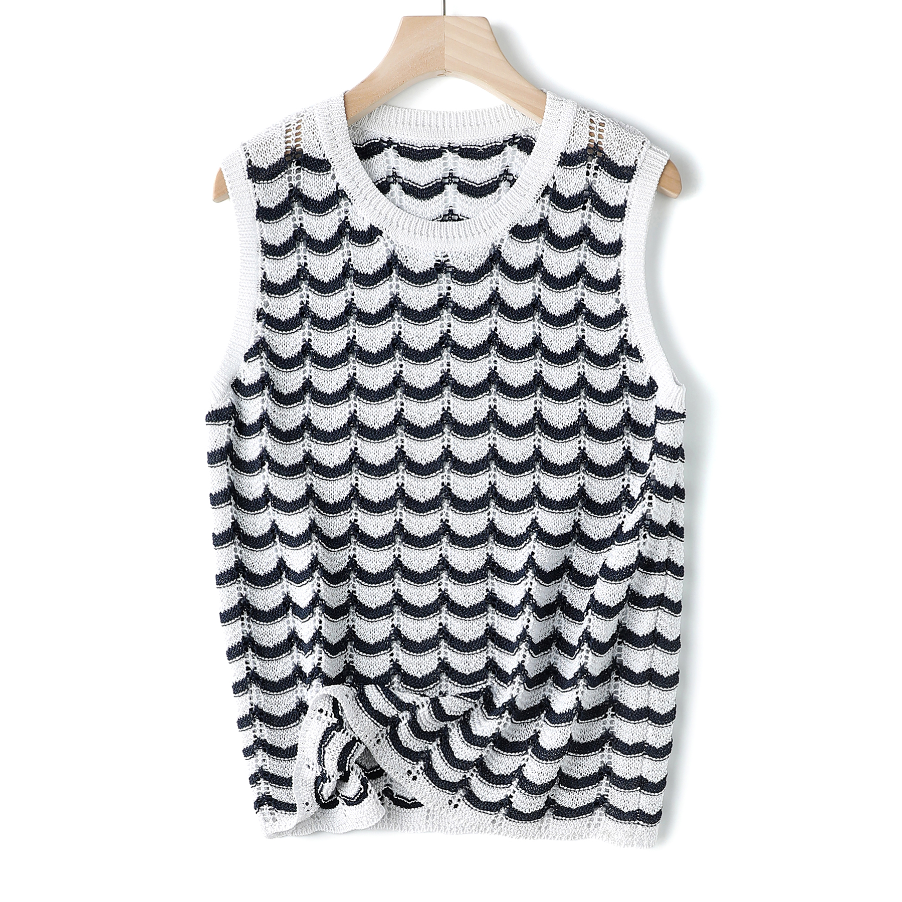 以纯净白色织底,勾勒黑色波状条纹——线条起伏如韵律乐谱,于身畔荡漾开摩登层次。这不是一件寻常背心,是穿在身上的轻灵艺术品。