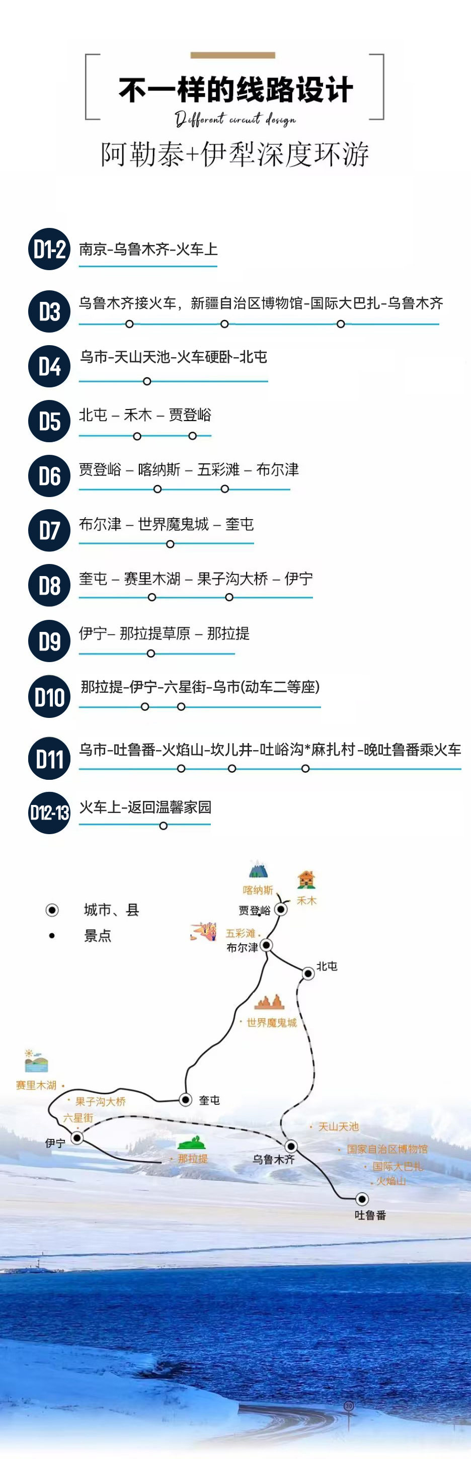 D11-D13 | 乌市-吐鲁番-火焰山-坎儿井-火车硬卧送站 | 早中 晚 | 送站 |