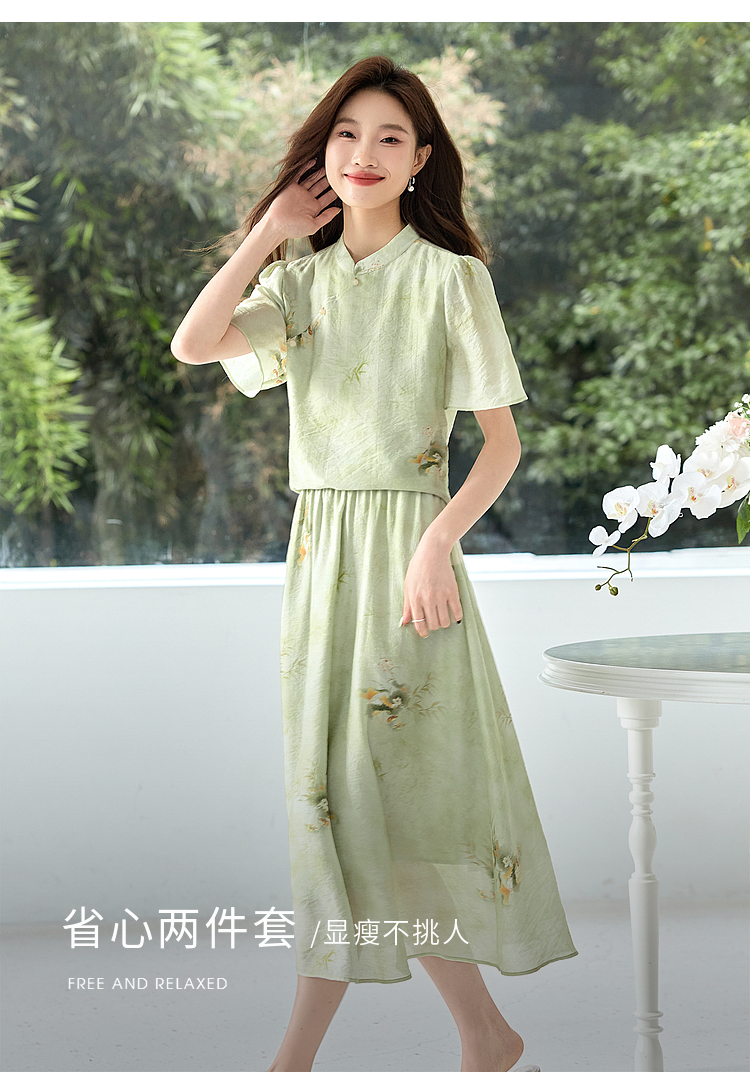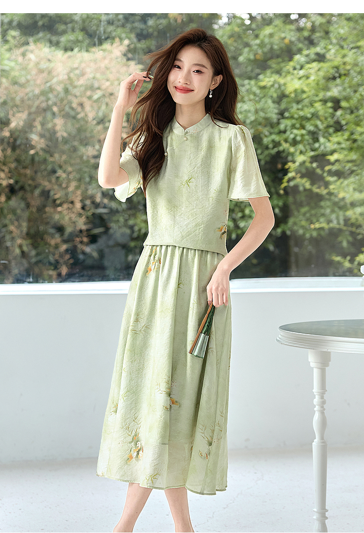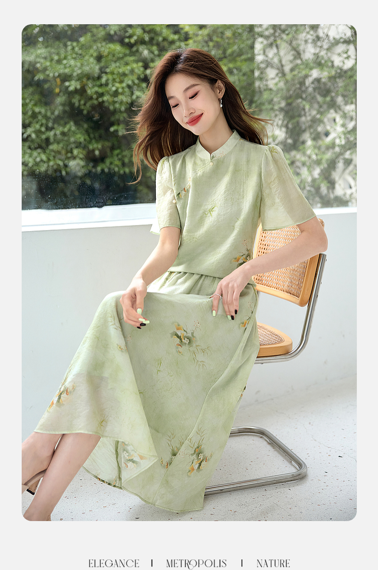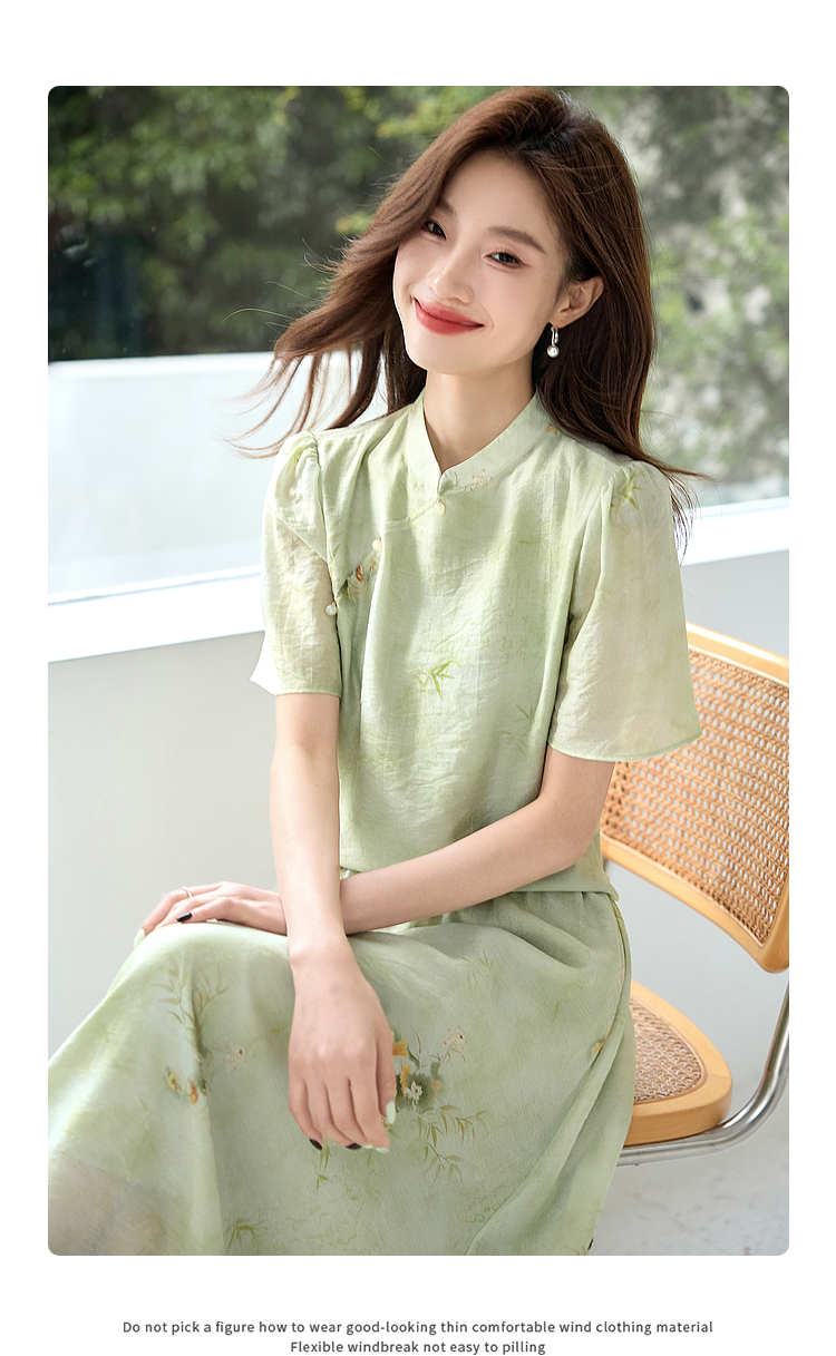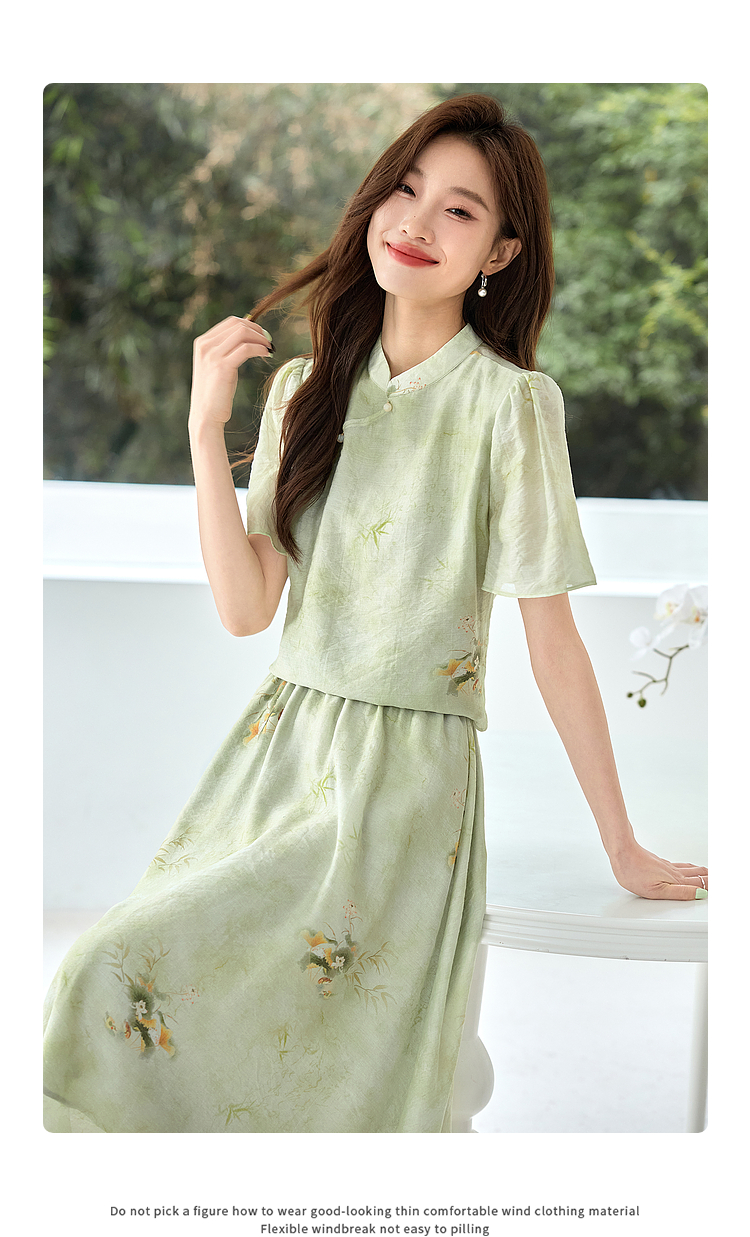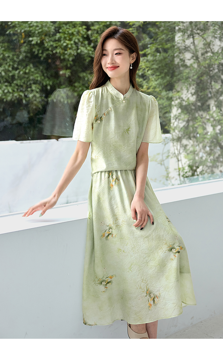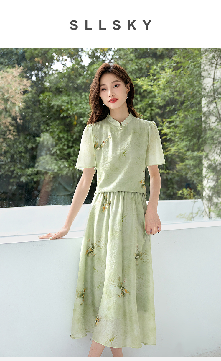 【五折购】熙世界薄荷曼波绿国风套装夏季新中式斜襟立领上衣半身裙两件套