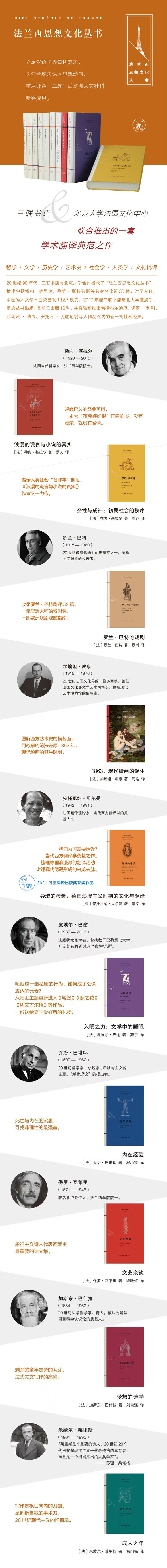 20世纪90年代,三联书店与北京大学法国文化研究中心合作出版了“法兰西思想文化丛书”。十余年间共翻译出版27种,荟萃诸多大家名著,开一时风气之先。时隔20年,中国的人文学术环境已发生极大改变,全新的视野带来了全新的需求,引介新一代的西学经典正成为学术建设的当务之急。自2014年起,北京大学法国文化中心与三联书店继续合作,重启丛书出版计划。新书系延续以思想史为主线的思路,兼及文学史、艺术史等领域,推出国内尚未出版过的人文社科名著首译,并精选当年丛书终已经绝版的佳作,修订再版。相信这场中法两国思想者间持久、深入、自由的对话,对于思考当今世界问题与共同面对人类的未来具有弥足珍贵的意义。