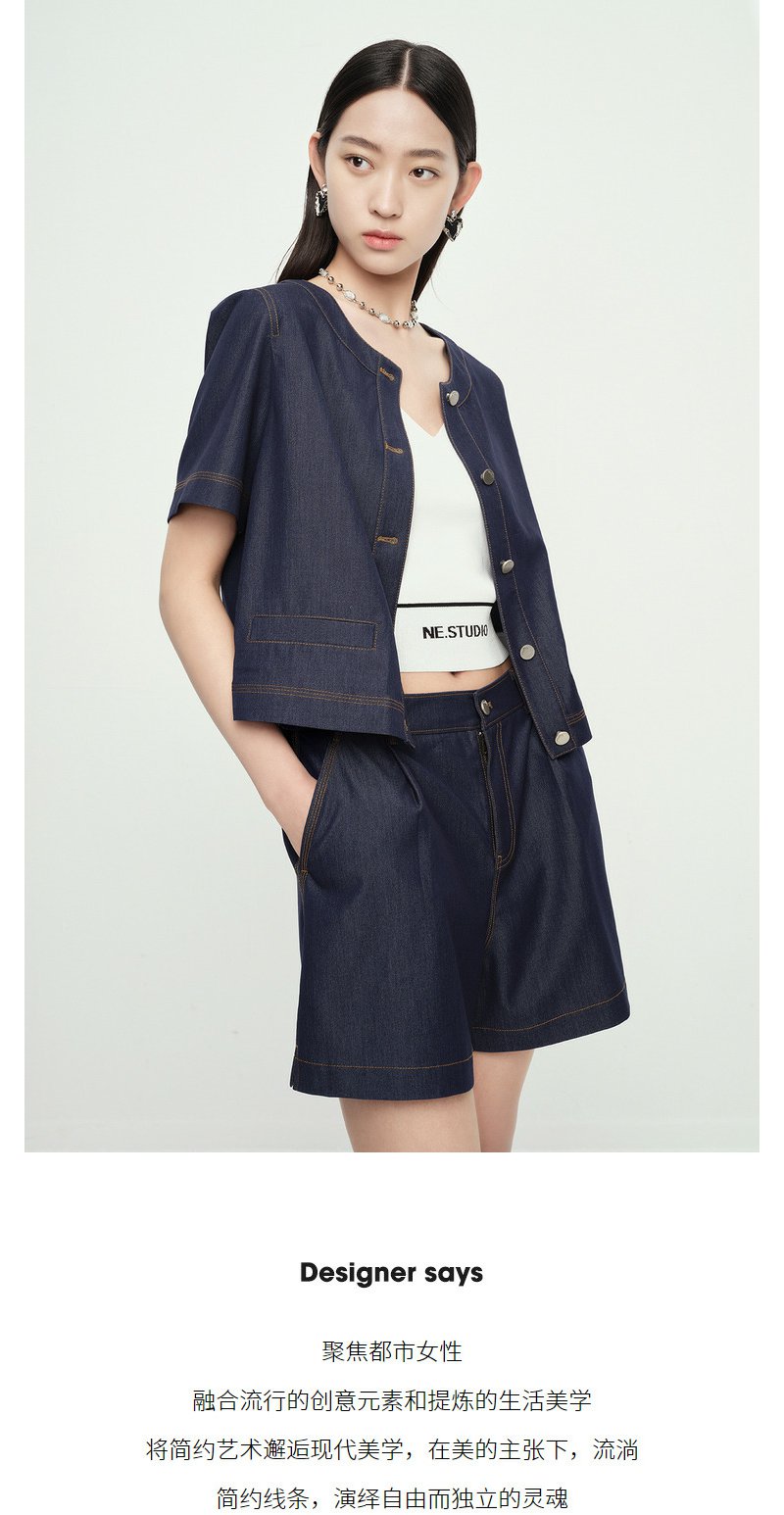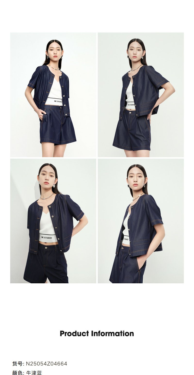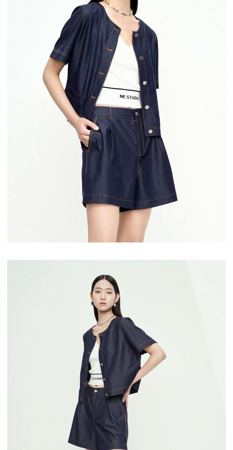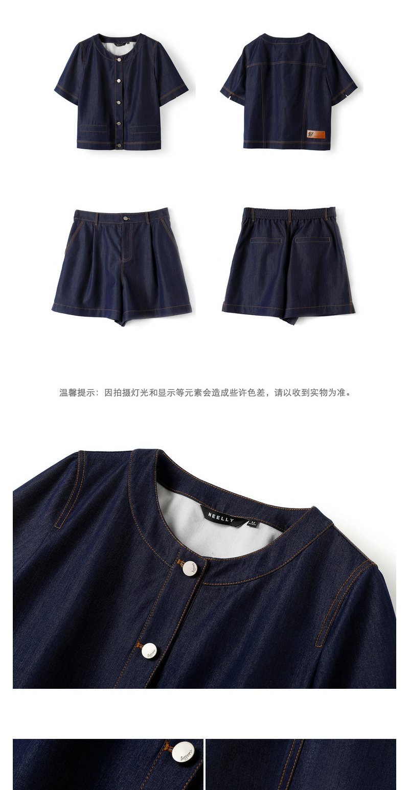 NEELLY纳俪商场同款夏新款短袖圆领牛仔上衣套装女宽松短裤两件套N25054Z04664