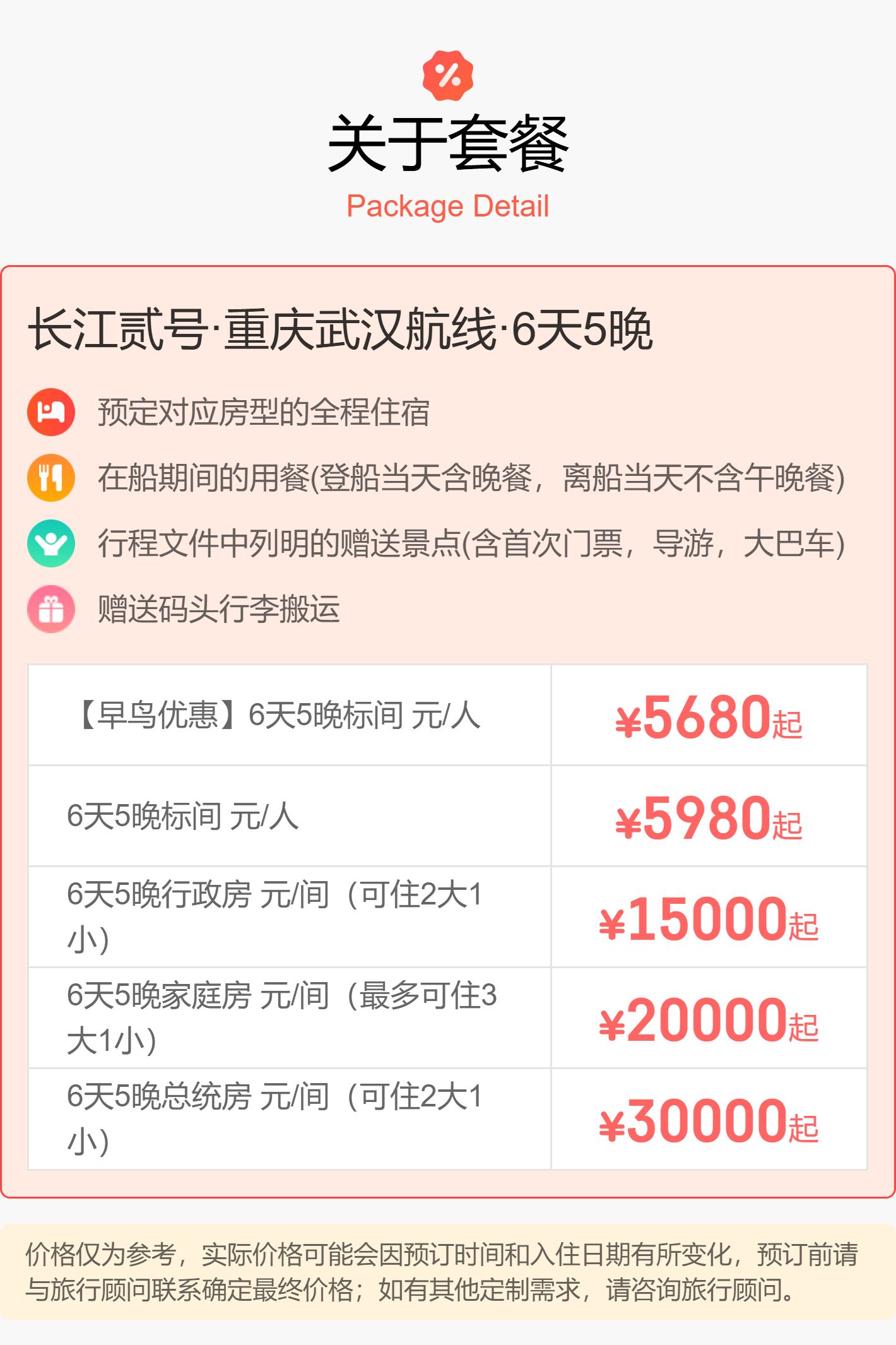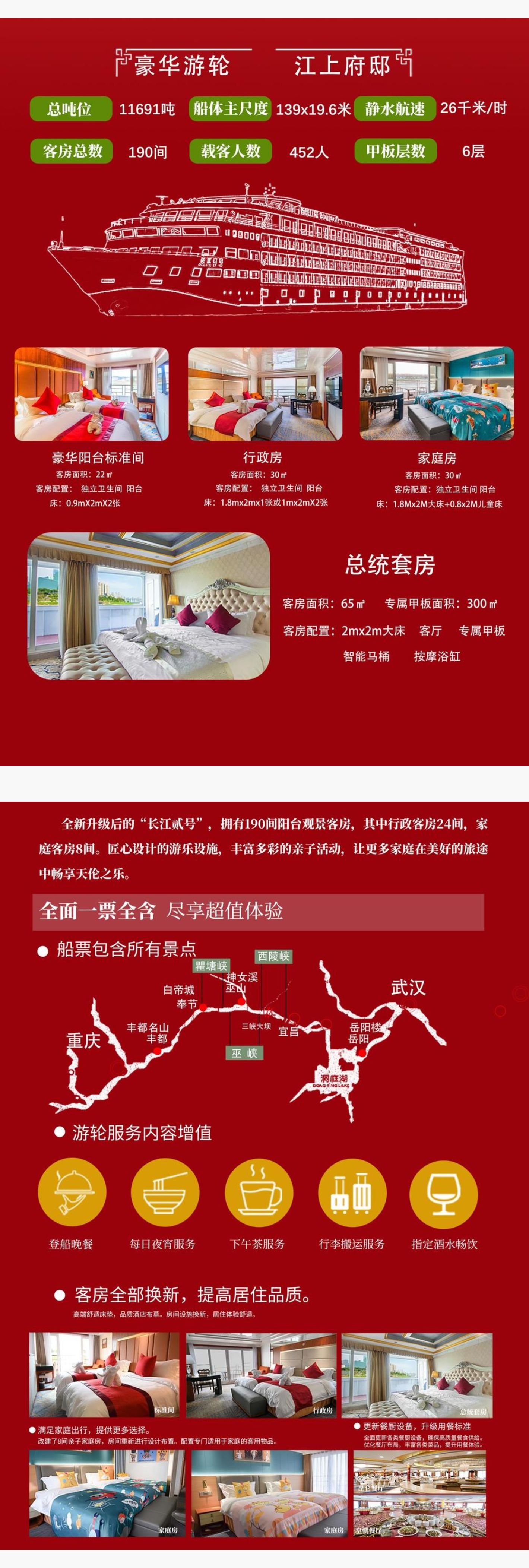 6天5晚【长航邮轮·长江贰号·重庆武汉航线】双向可选,航期丰富,各类娱乐设施一应俱全,一价全含,尽享超值体验~