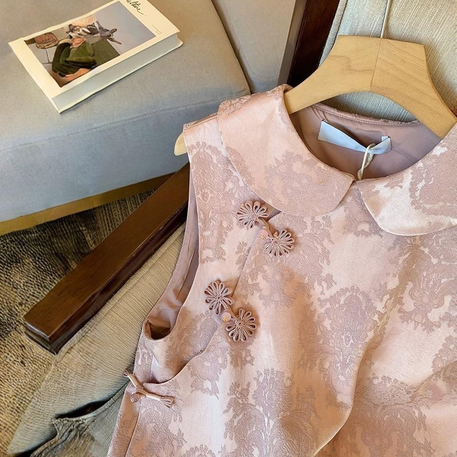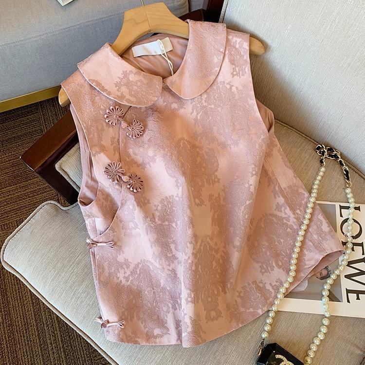 【15天内发出】新中式印花斜襟盘扣粉色国风马甲 春夏洋气复古无袖上衣