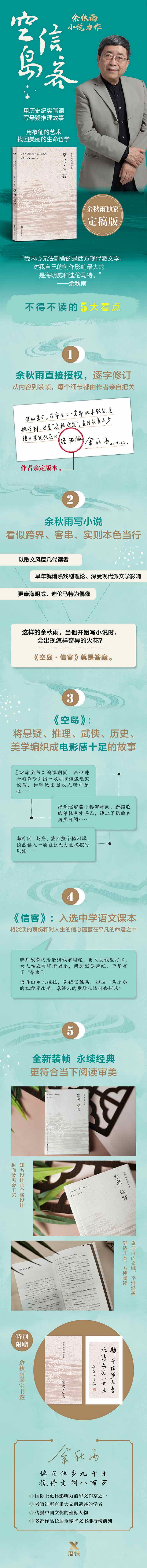 ★余秋雨独家定稿版,直接授权,逐字修订,永远的经典 余秋雨历时数年逐一修订,二十余部代表作品亲力打造,焕然一新。从内容到装帧,每个细节均亲自把关。 ★余秋雨写小说,看似跨界、客串,实则本色当行 以散文风靡几代读者,早年就谙熟戏剧理论、深受现代派文学影响,更奉海明威、迪伦马特为偶像——这样的余秋雨,当他开始写小说时,会出现怎样奇异的火花?《空岛·信客》就是答案。 ★《空岛》:将悬疑、推理、武侠、历史、美学编织成电影感十足的故事 《四库全书》编撰期间,两位进士的争吵引出一段明末海盗遗宝秘闻,和珅派出黑衣人暗中追查……扬州赵府藏书楼海叶阁,新招收的年轻秀才岑乙,迷上了昆曲名角吴可闻……海叶阁、赵府,甚至整个扬州城,悄然卷入一场被巨大力量操控的风波…… ★《信客》:入选中学语文课本,将淡淡的哀伤和对人生的信心蕴藏在平凡的命运之中 鸦片战争之后沿海城市崛起,男人去城里打工,女人在农村守着老小,两边需要牵线,于是有了“信客”。信客由乡人担任,凭信任维系,却被一条小小的红缎带改变,牵线人的步履应该何去何从?