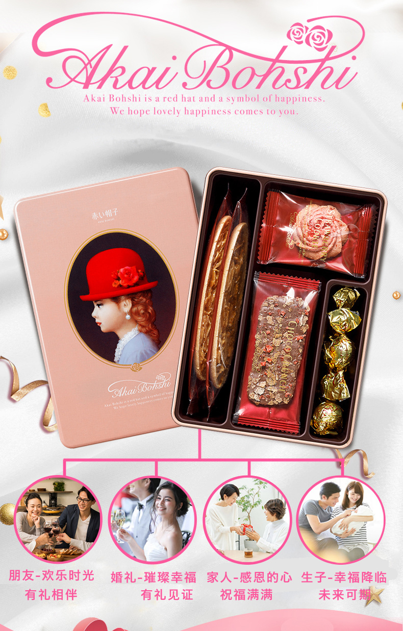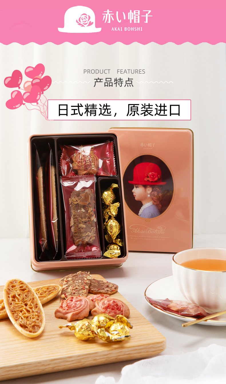 日本红帽巧克力什锦饼干嫩粉色礼盒67.1g/058207 每一份造型精美4种口味12枚