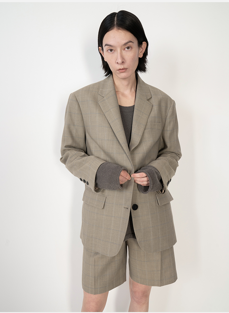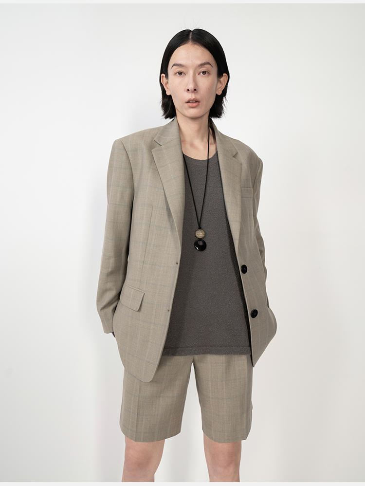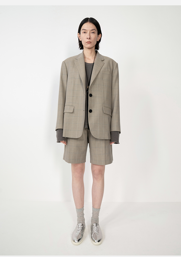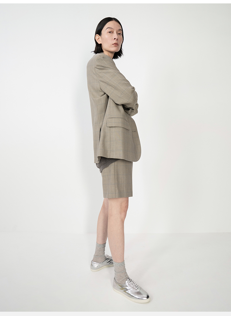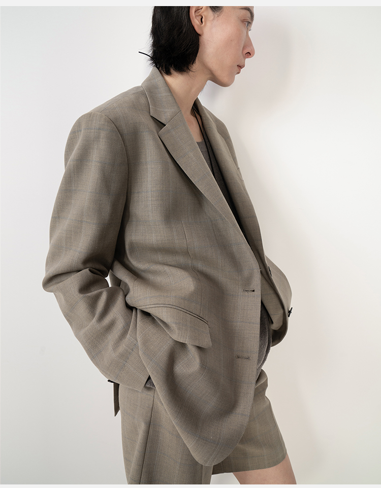HIDEMI羊毛经典简约翻领色织格纹西装/压褶中裤