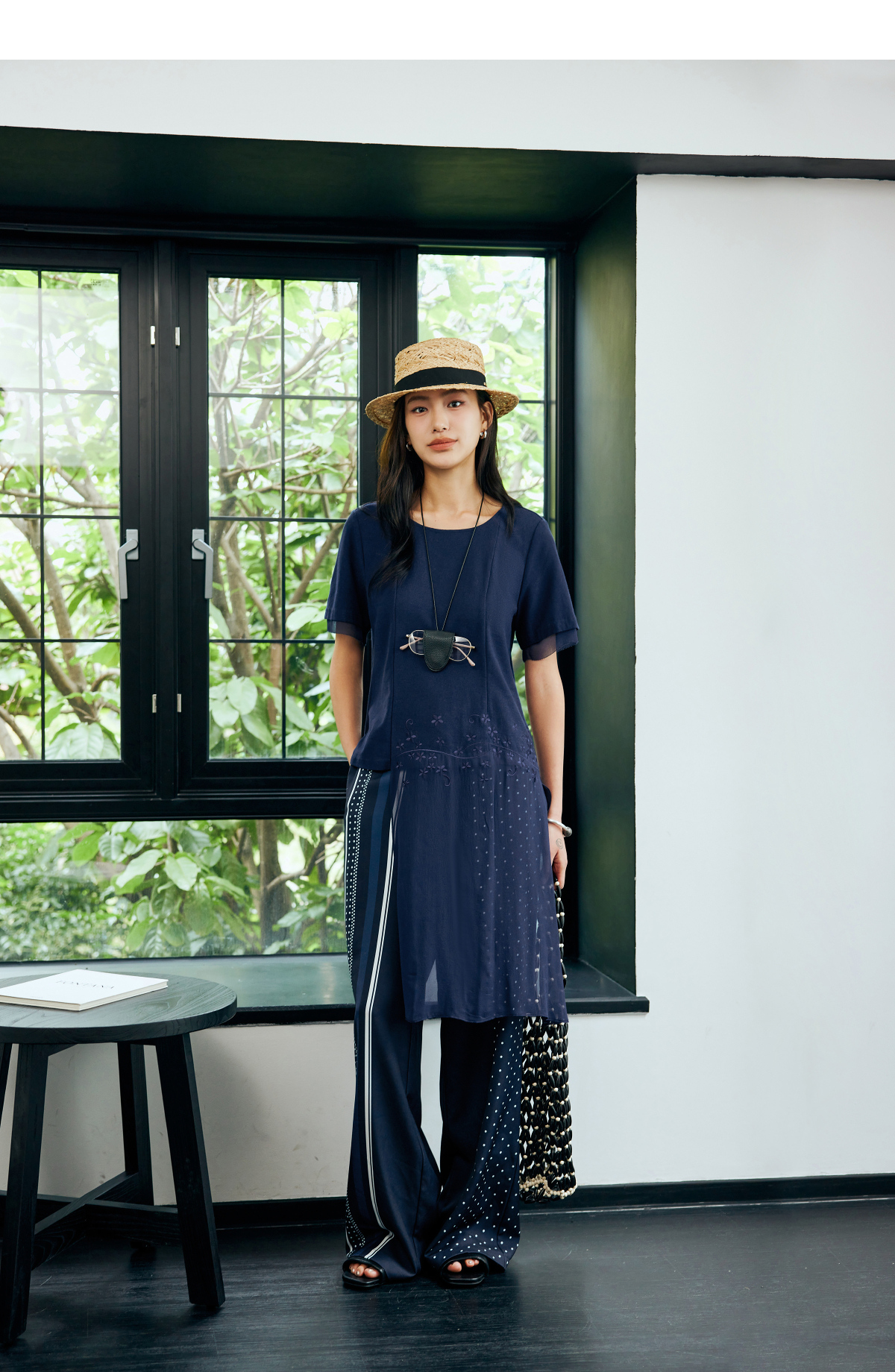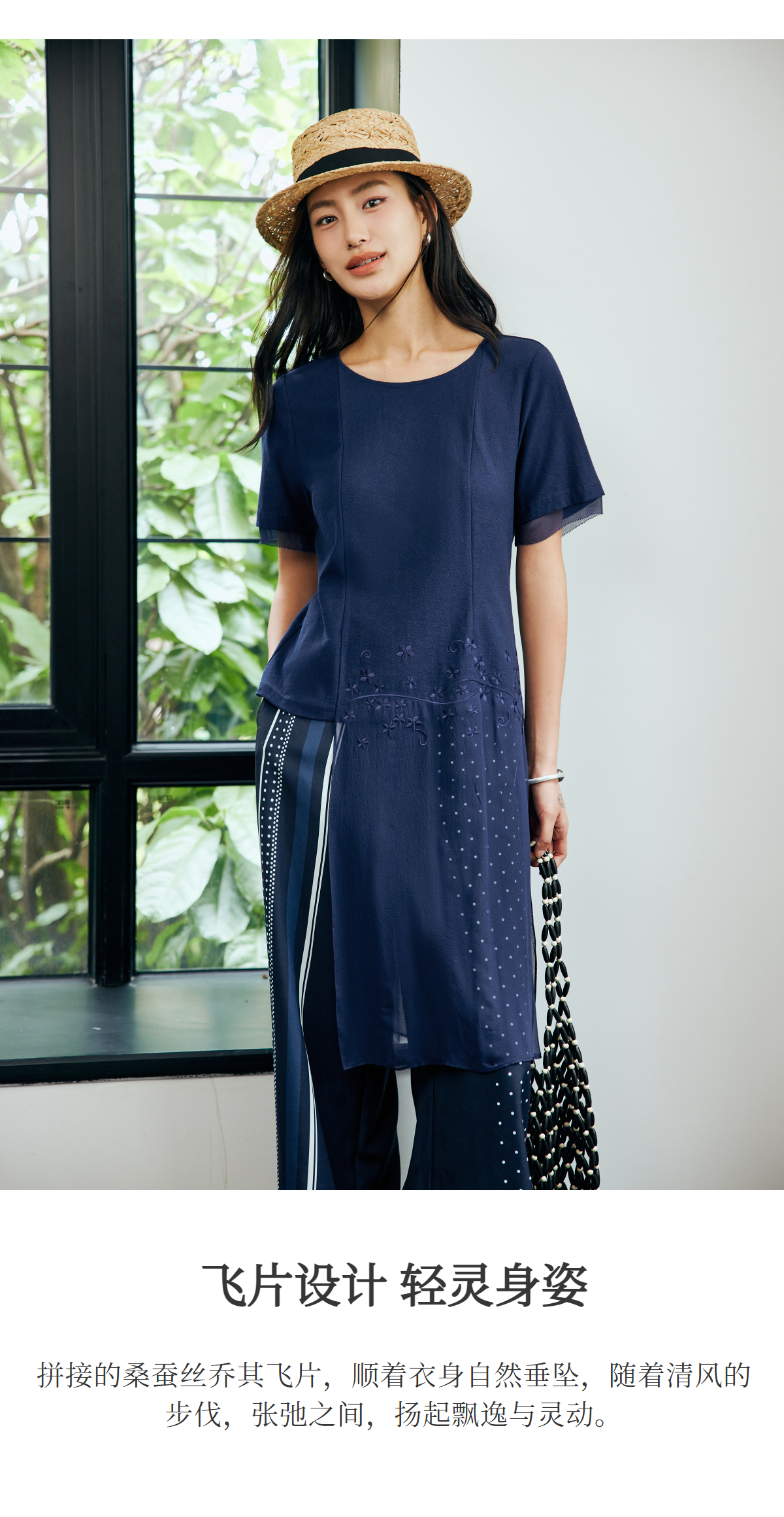 【林栖设计小店】棉混纺T恤绣花拼真丝飞片气质2024春夏新品短袖上衣女1942362