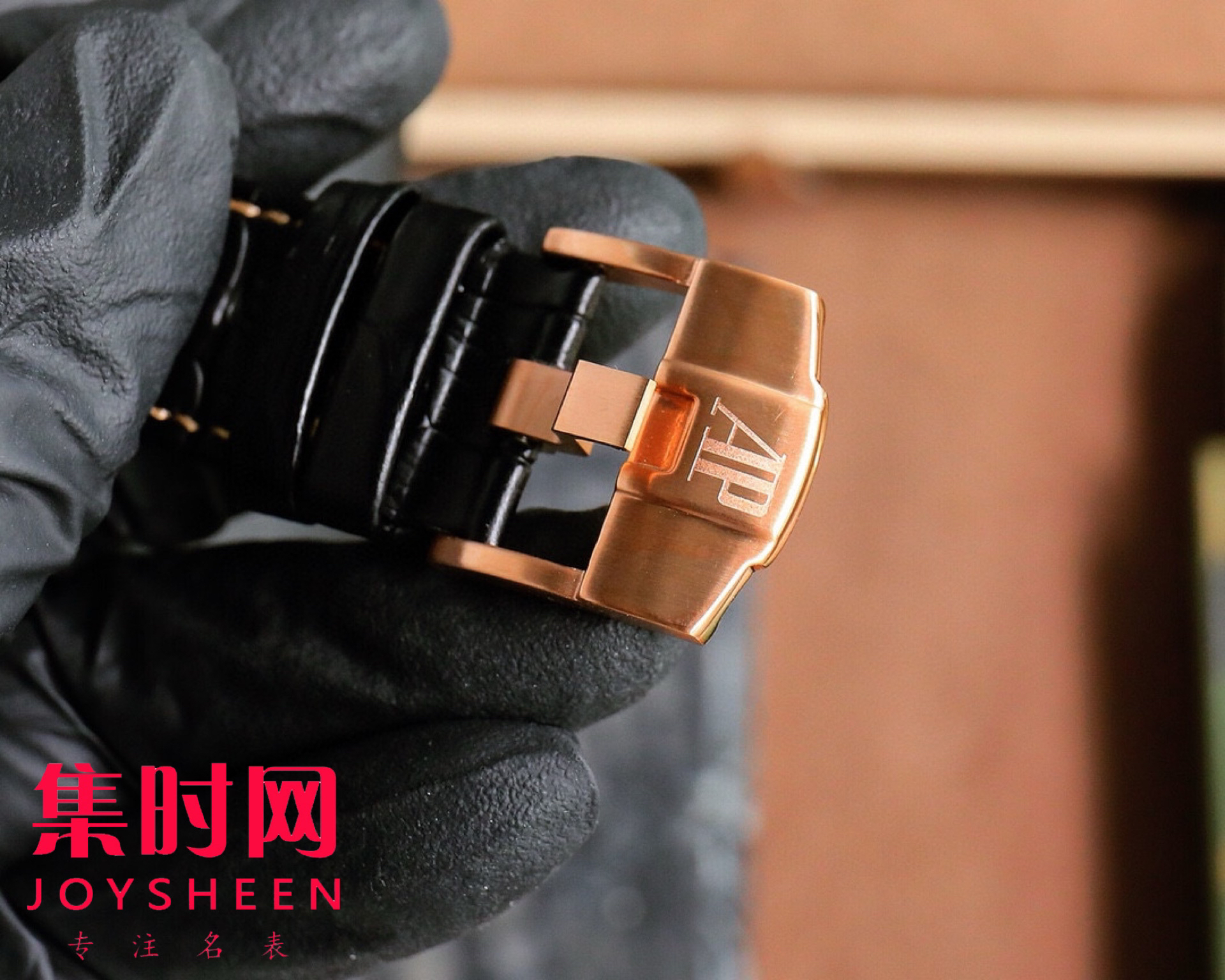 表盘以爱彼经典的大格纹为背景,层次分明的方格排列,经过打磨,将匠人的工艺体现的淋漓尽致