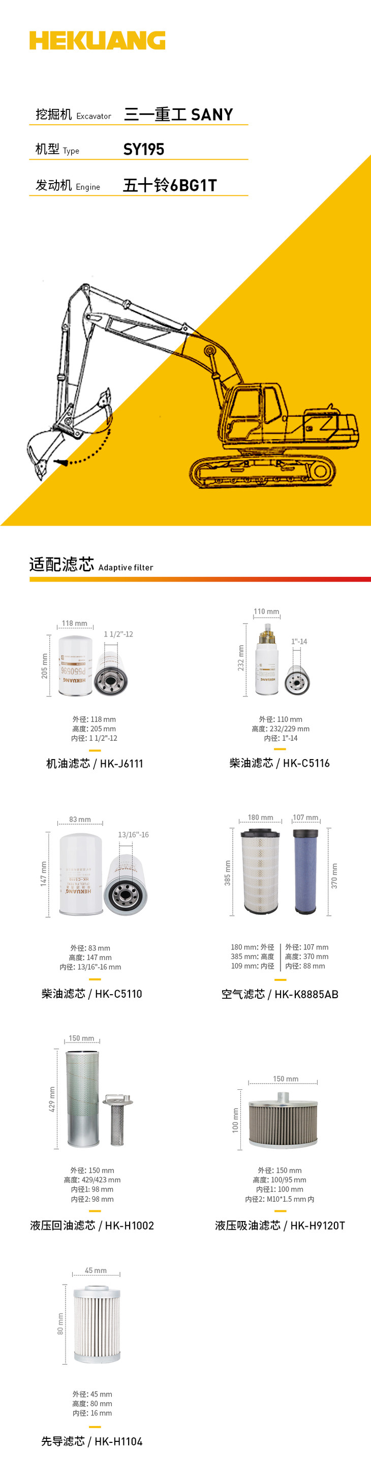 三一重工SY195(五十铃6BG1T)发动机)机油滤芯 柴油滤芯 液压油滤芯 先导滤芯