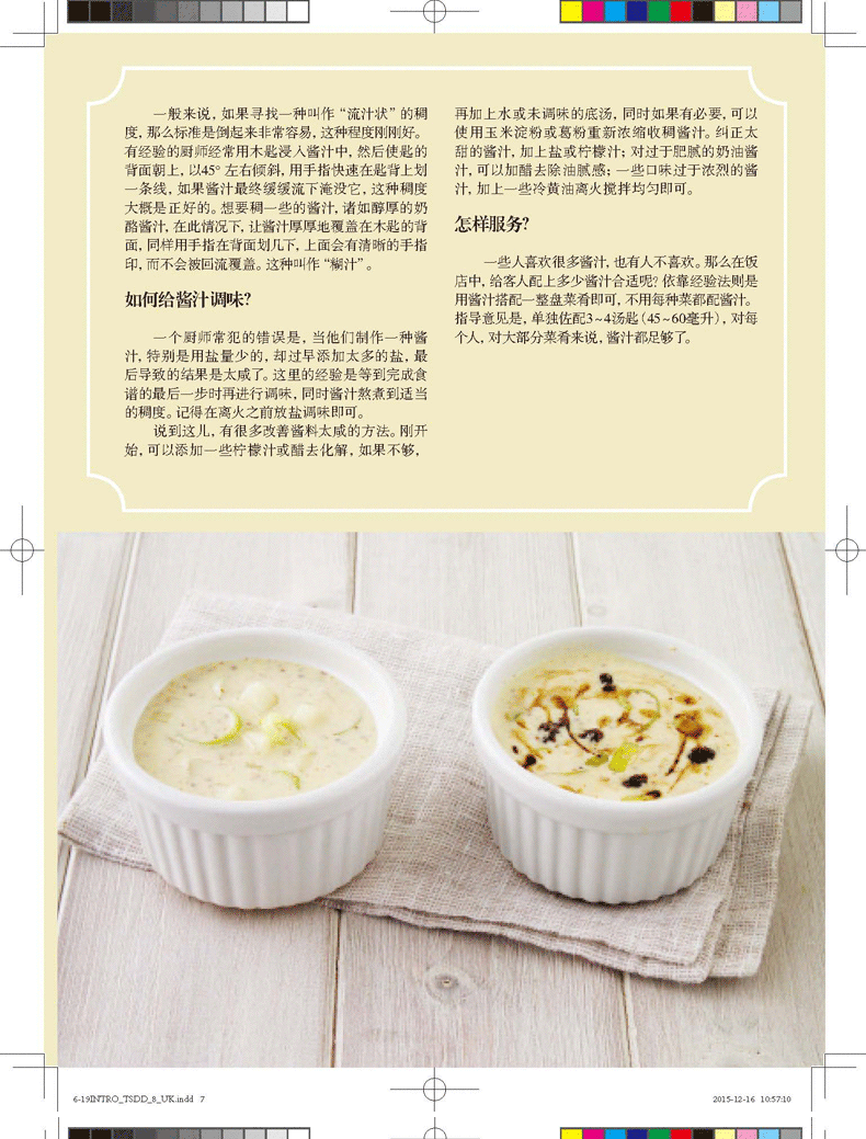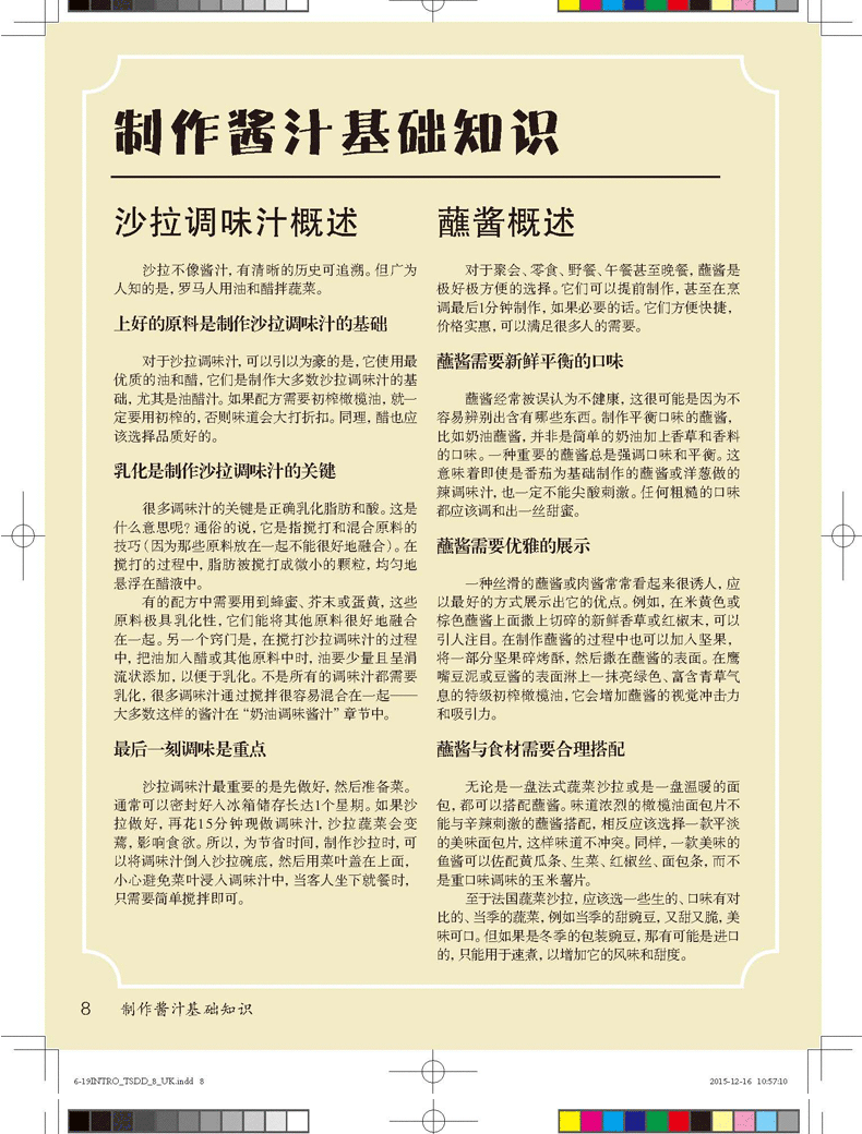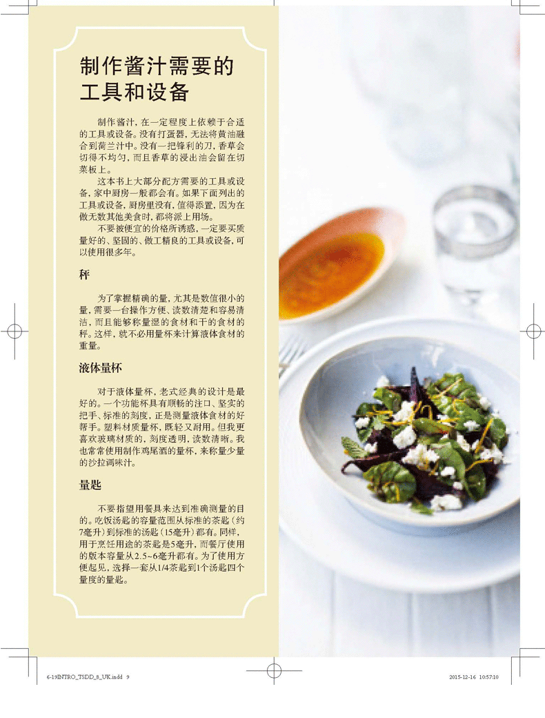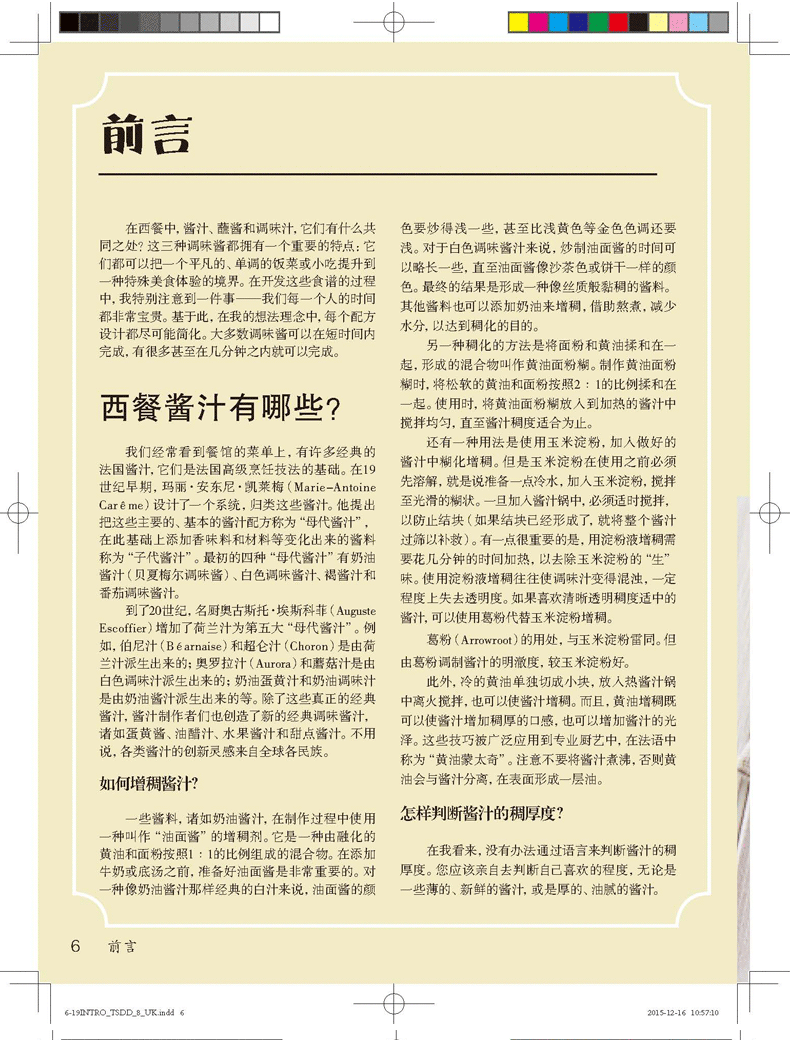西式酱料·酱汁1000例一书中,包含1000种珍贵的西餐酱料酱汁配方,包含乳化酱汁、奶油干酪酱汁、番茄酱汁、亚洲酱汁、萨尔萨蘸酱、肉类海鲜蘸酱、奶油奶酪豆类蘸酱、油醋汁、甜品酱汁等大的类别,每类酱汁都有基础配方和适合搭配不同食材的各种衍生配方,是西餐大厨的绝佳帮手。