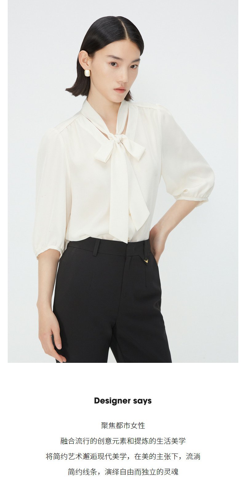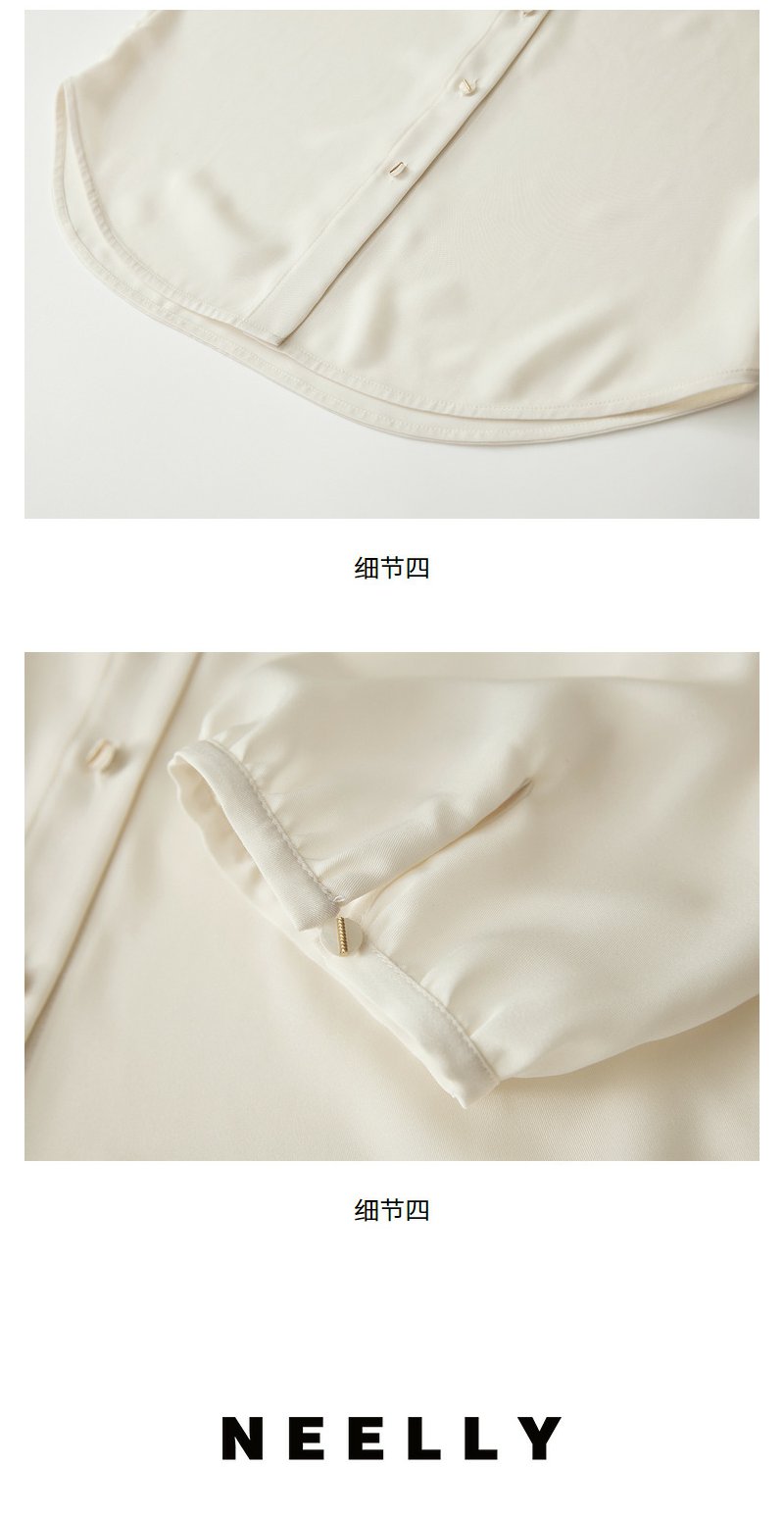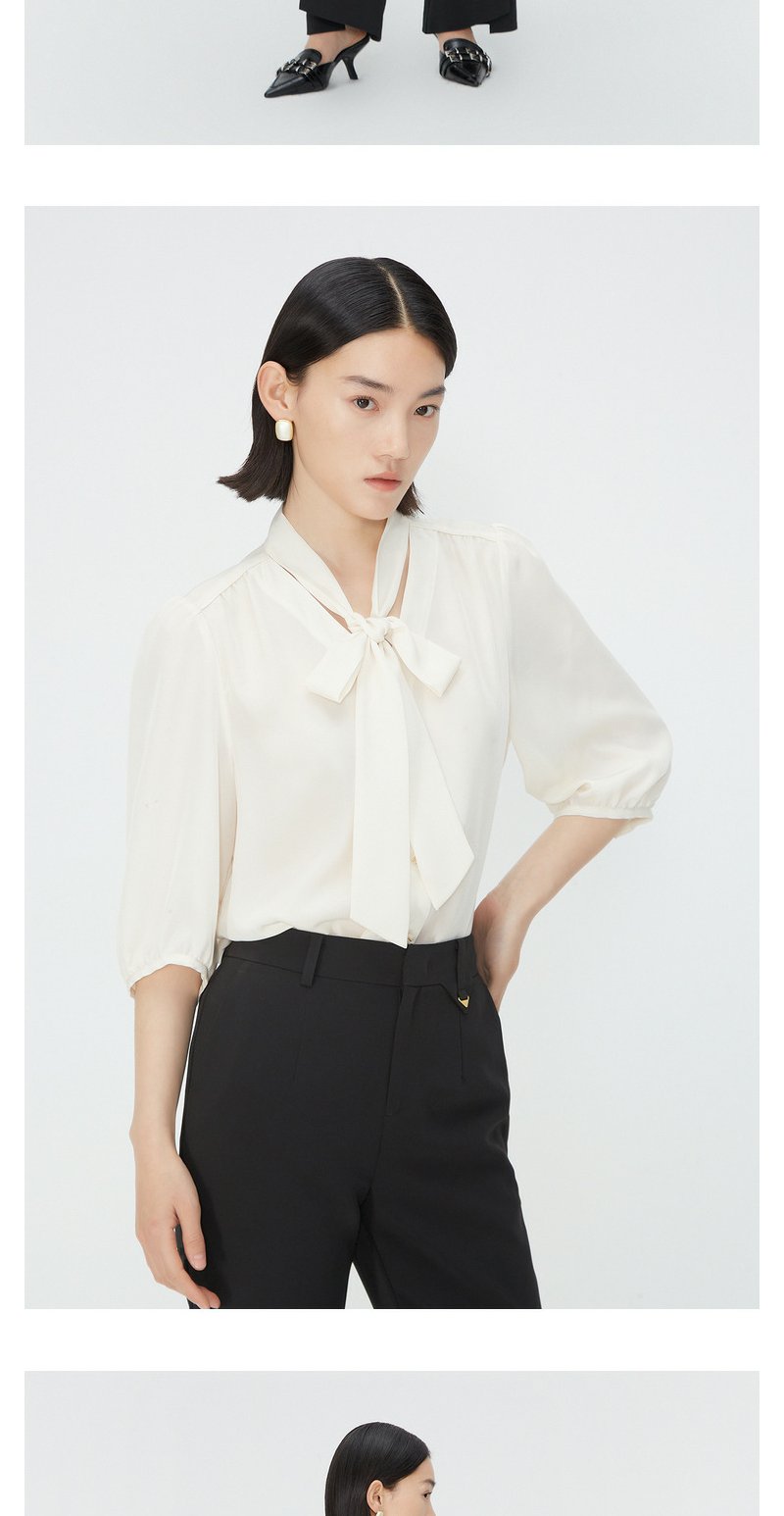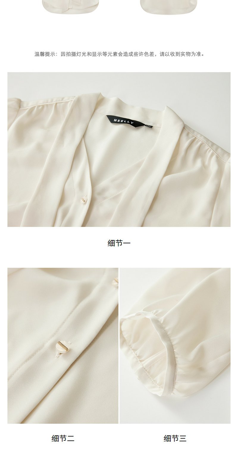 NEELLY纳俪商场同款优雅飘带领衬衫女通勤五分袖宽松别致雪纺上衣 N24041B01011
