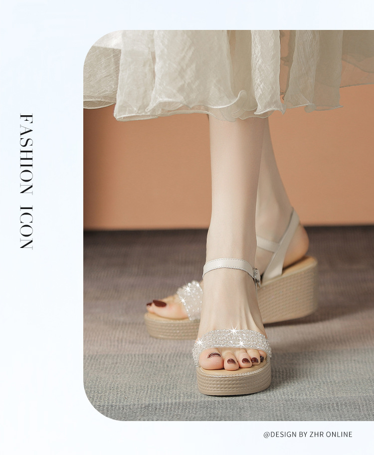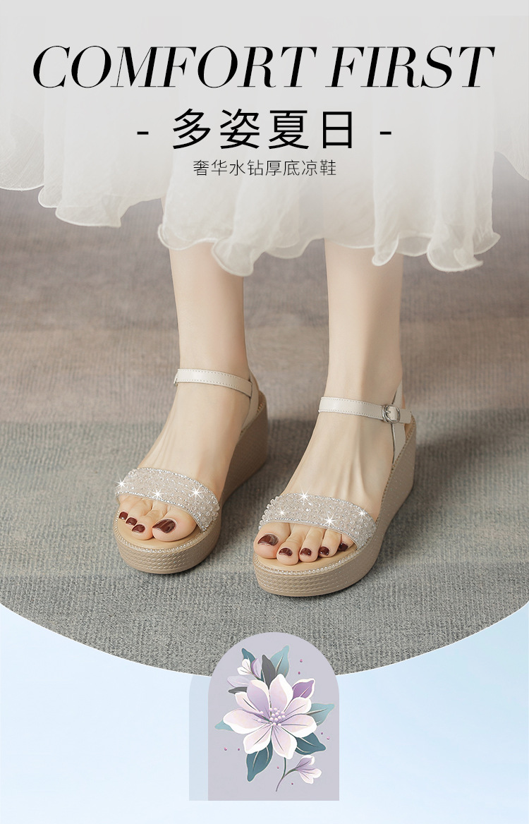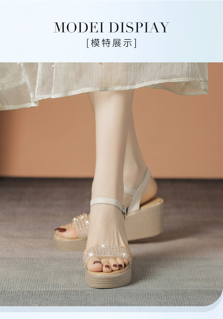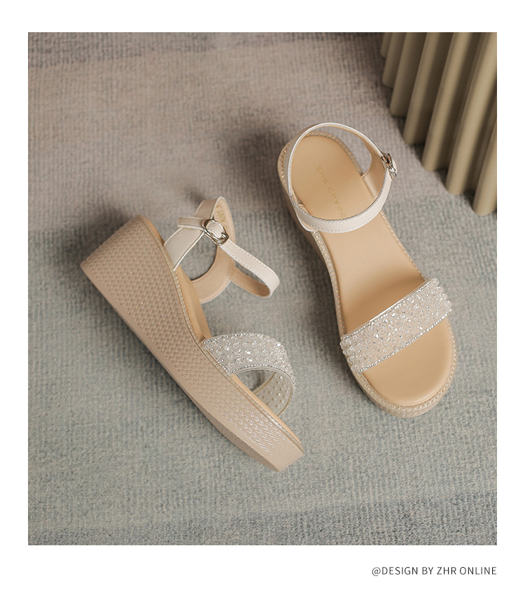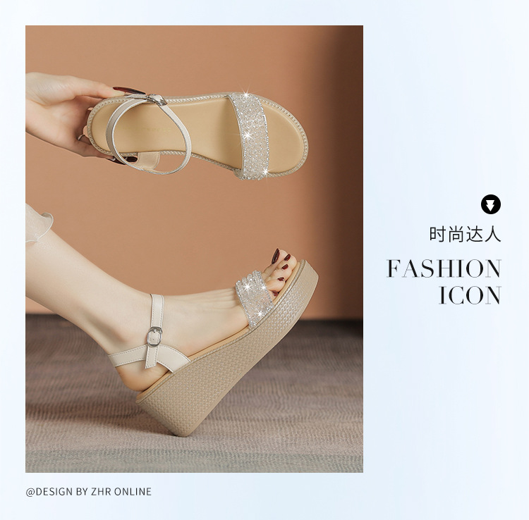 ZHR坡跟带水钻高跟鞋2024夏季新款外穿厚底小个子增高女鞋配裙子