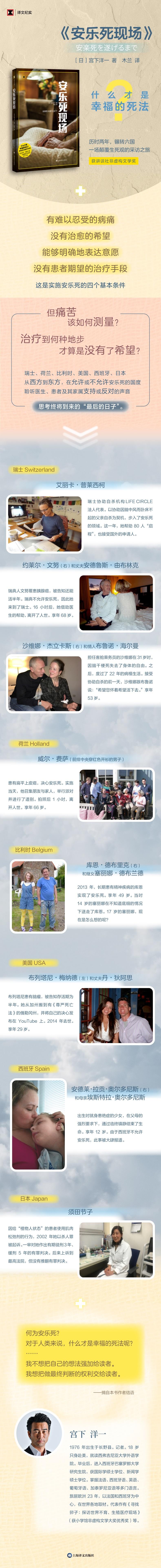 《安乐死现场》正是一部直面死亡的纪实作品。宫下洋一前往瑞士、荷兰、比利时、美国部分州等安乐死合法化的国家和地区,亲临安乐死的现场,通过对选择安乐死的患者、他们的医生和亲人进行采访,详细介绍了包括患者和家属的心里状态、安乐死分类、实施细节等安乐死合法化后的现状。西方注重个人的自由意志,日本更注重家族观念,这种东西方的思维差异在安乐死的问题上表现得尤为明显,作者在此基础上思考安乐死的道德界限,在试图理解安乐死存在意义和方式的同时,也保持着对安乐死是不是人的基本权利、合法化是否具有正当性的疑惑。