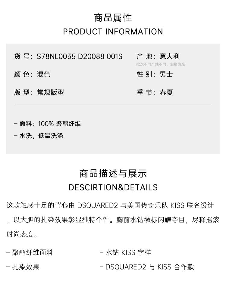 DSQUARED2 男士水钻 KISS 徽标无袖背心 混色 S78NL0035 D20088 001S