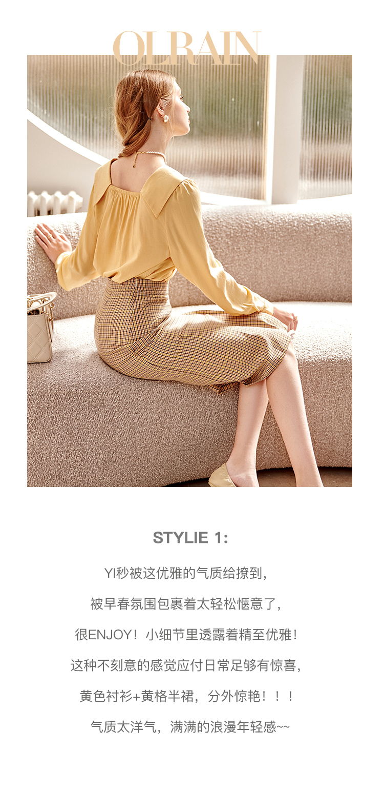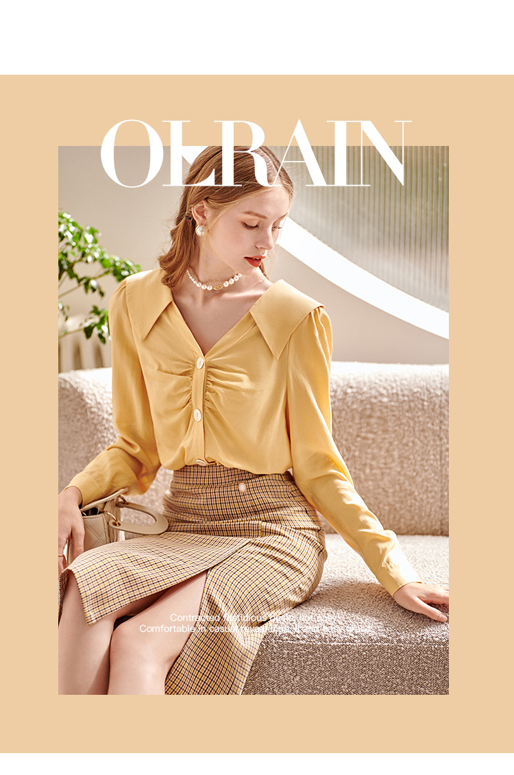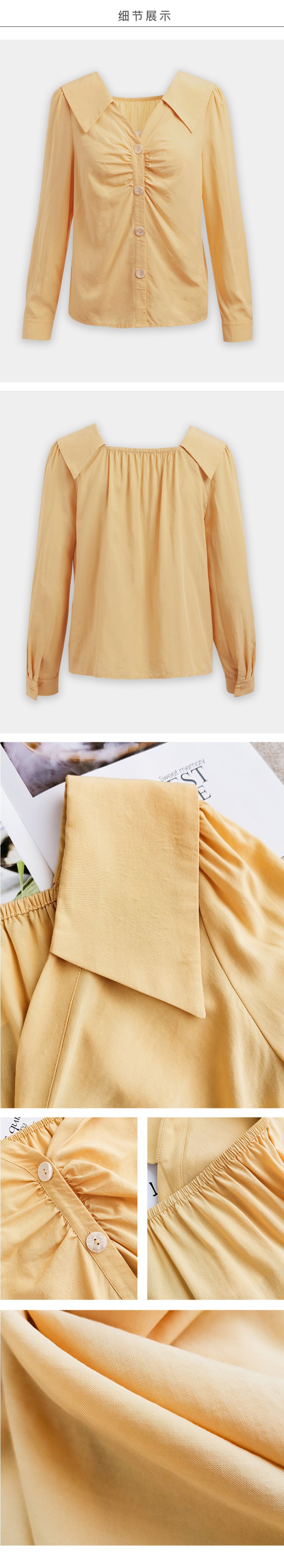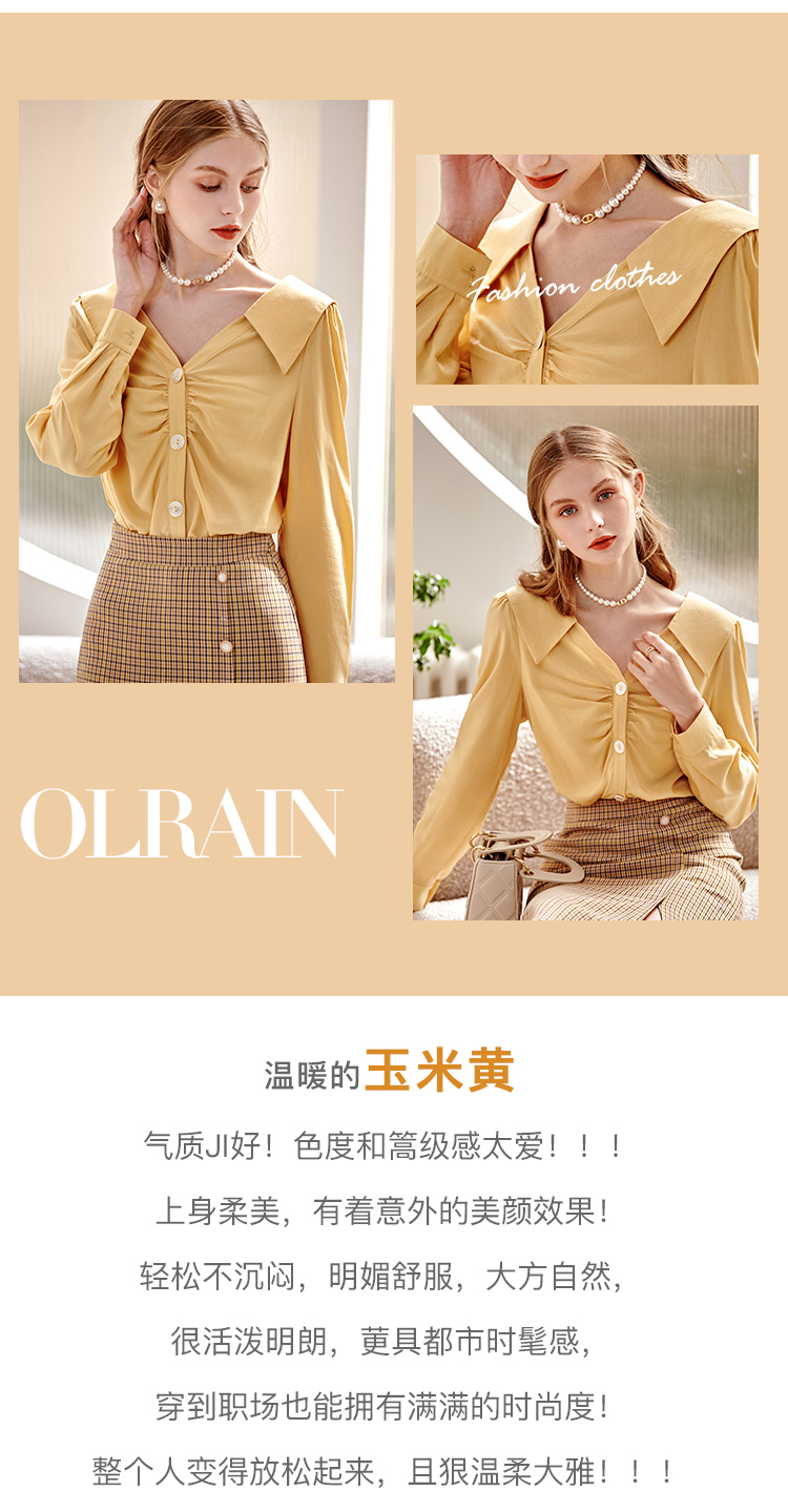 欧芮儿黄色长袖衬衫女春新款娃娃领气质显瘦优雅通勤职场抽褶衬衣