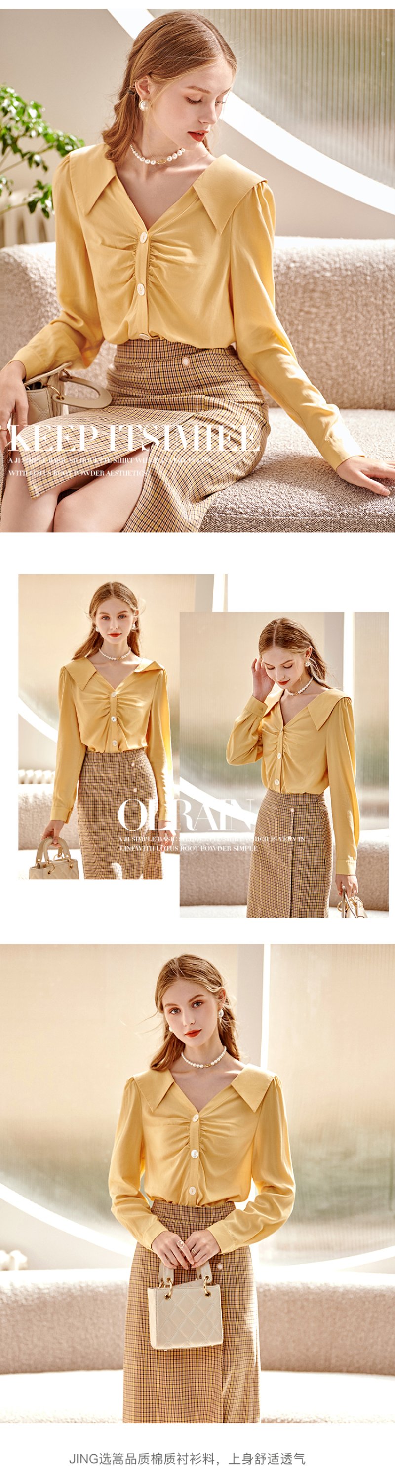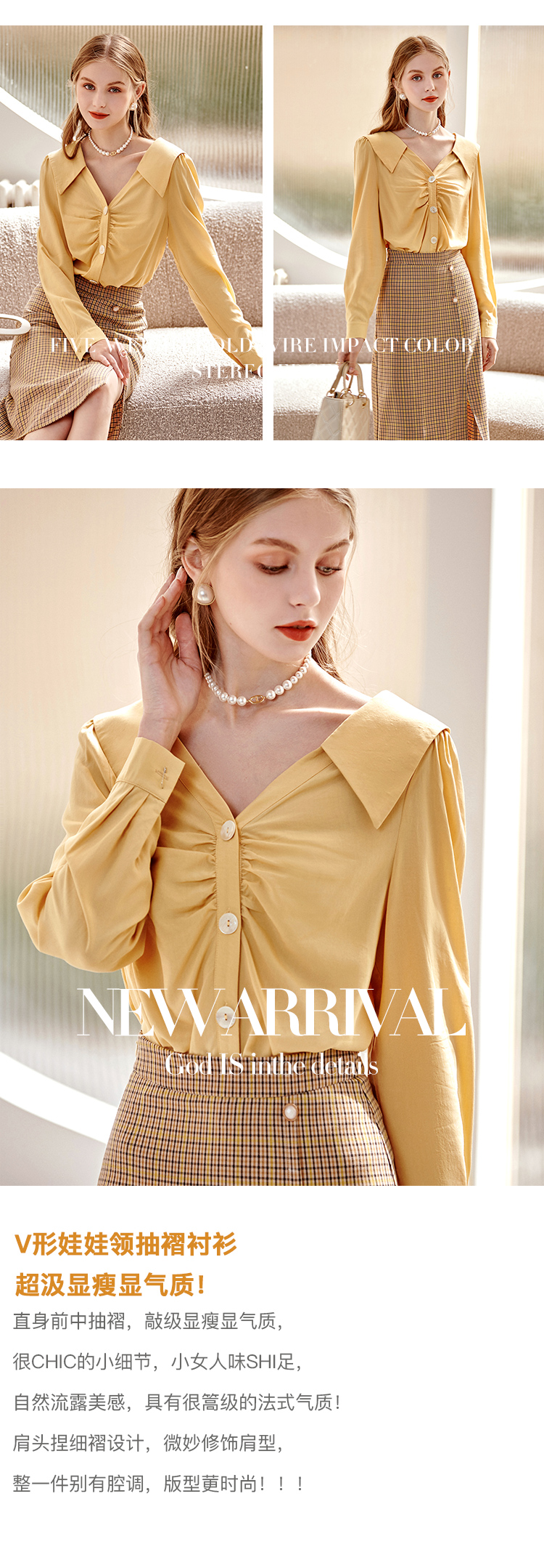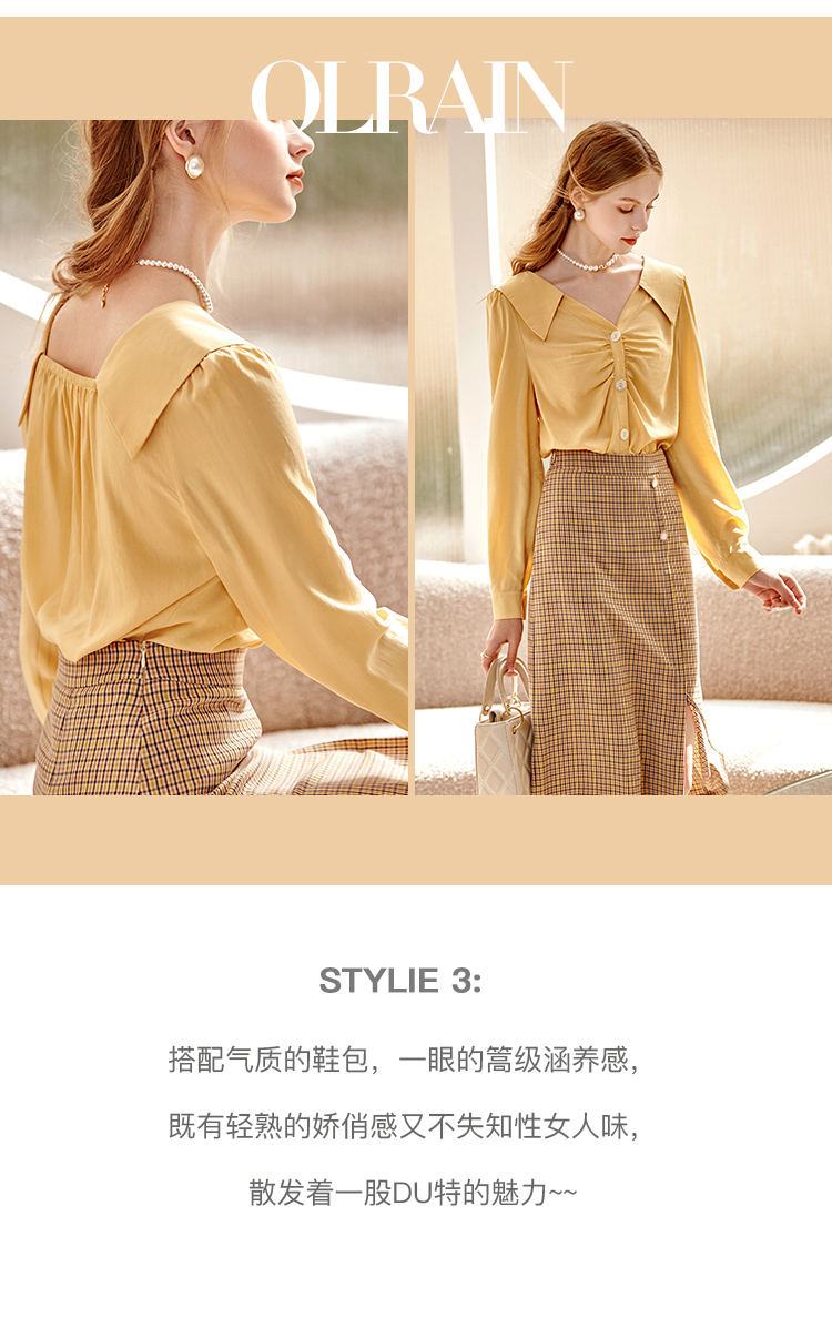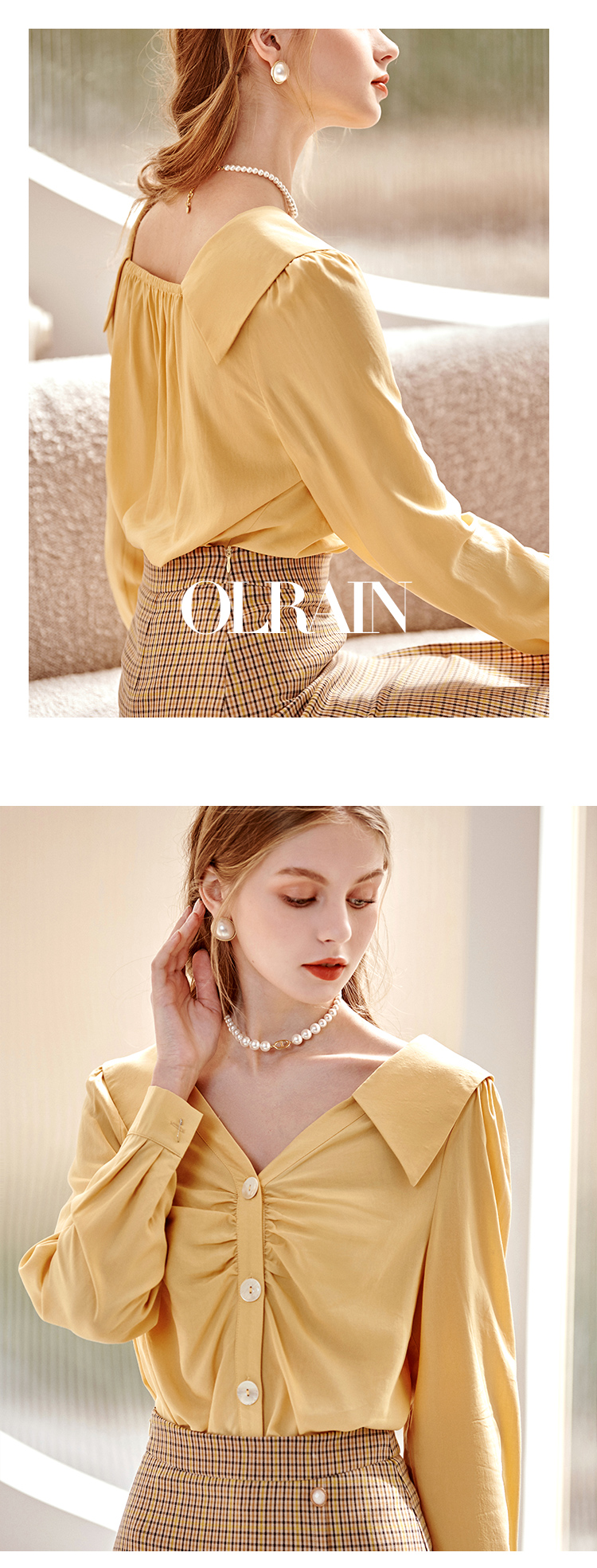 欧芮儿黄色长袖衬衫女春新款娃娃领气质显瘦优雅通勤职场抽褶衬衣