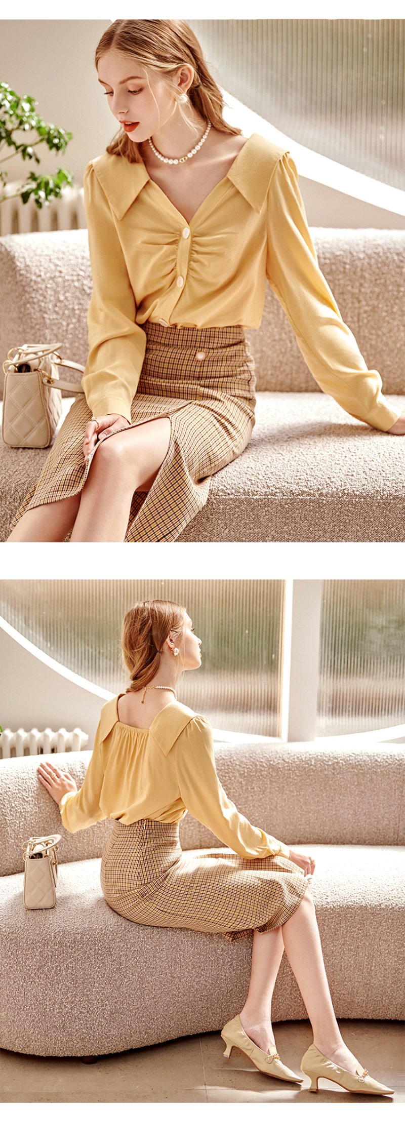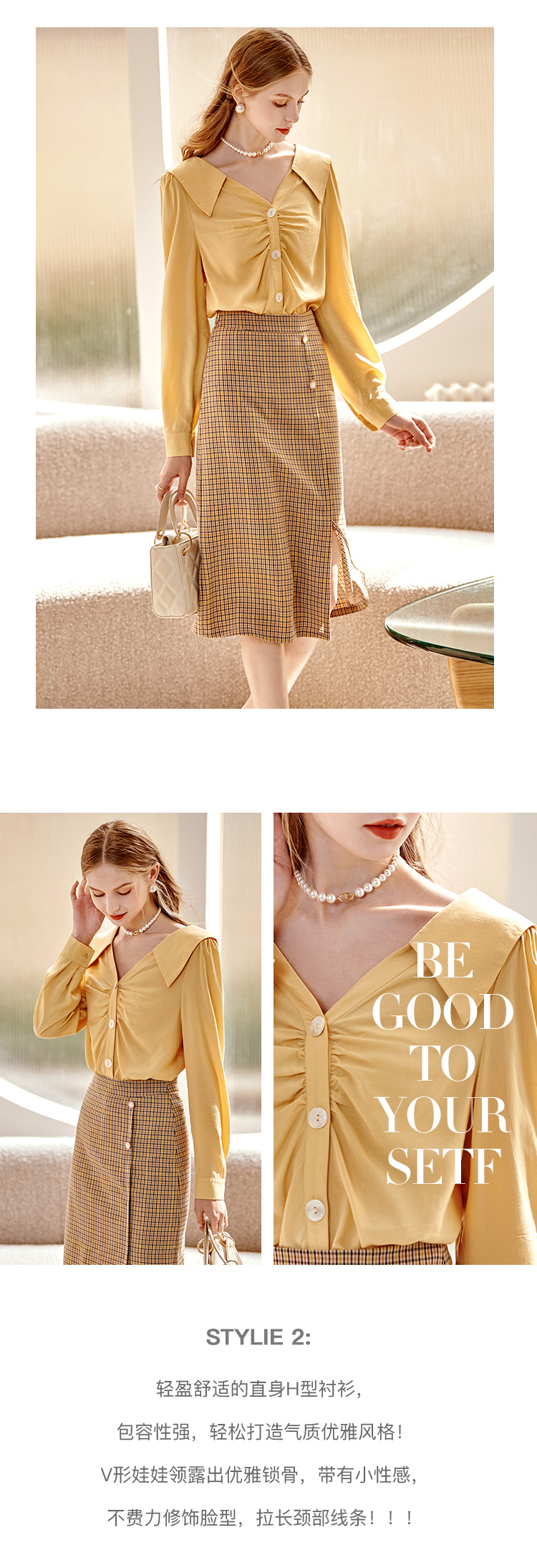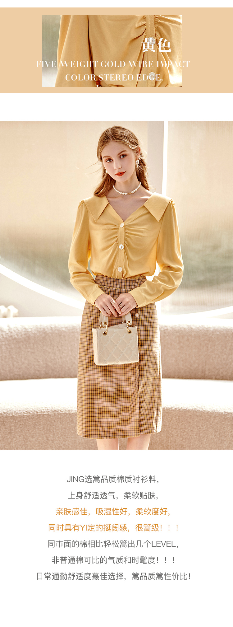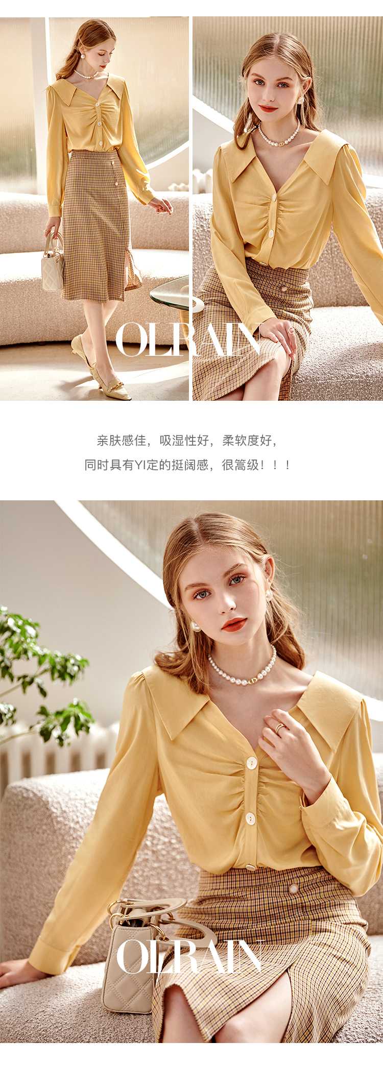 欧芮儿黄色长袖衬衫女春新款娃娃领气质显瘦优雅通勤职场抽褶衬衣