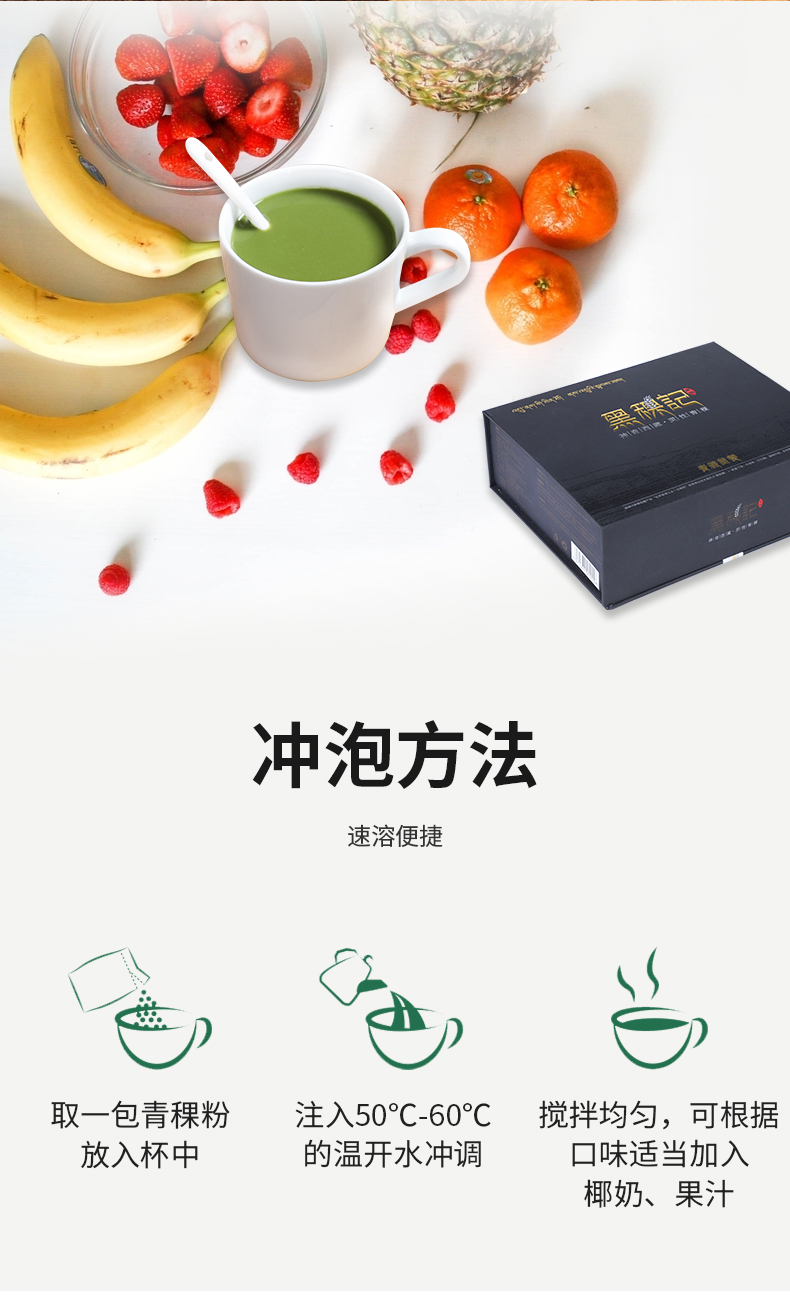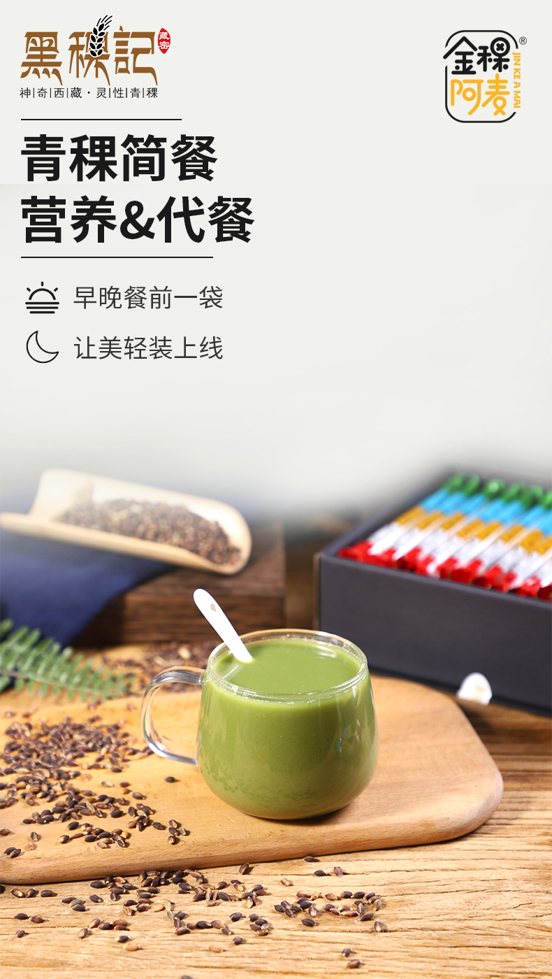 黑稞记简餐粉选自大麦苗和黑青稞精心加工而成,有浓郁的青稞香味,和牛奶搅拌均匀后口感爽滑,麦苗清香和奶香混合出非凡的风味,每一口下去都有满足感。