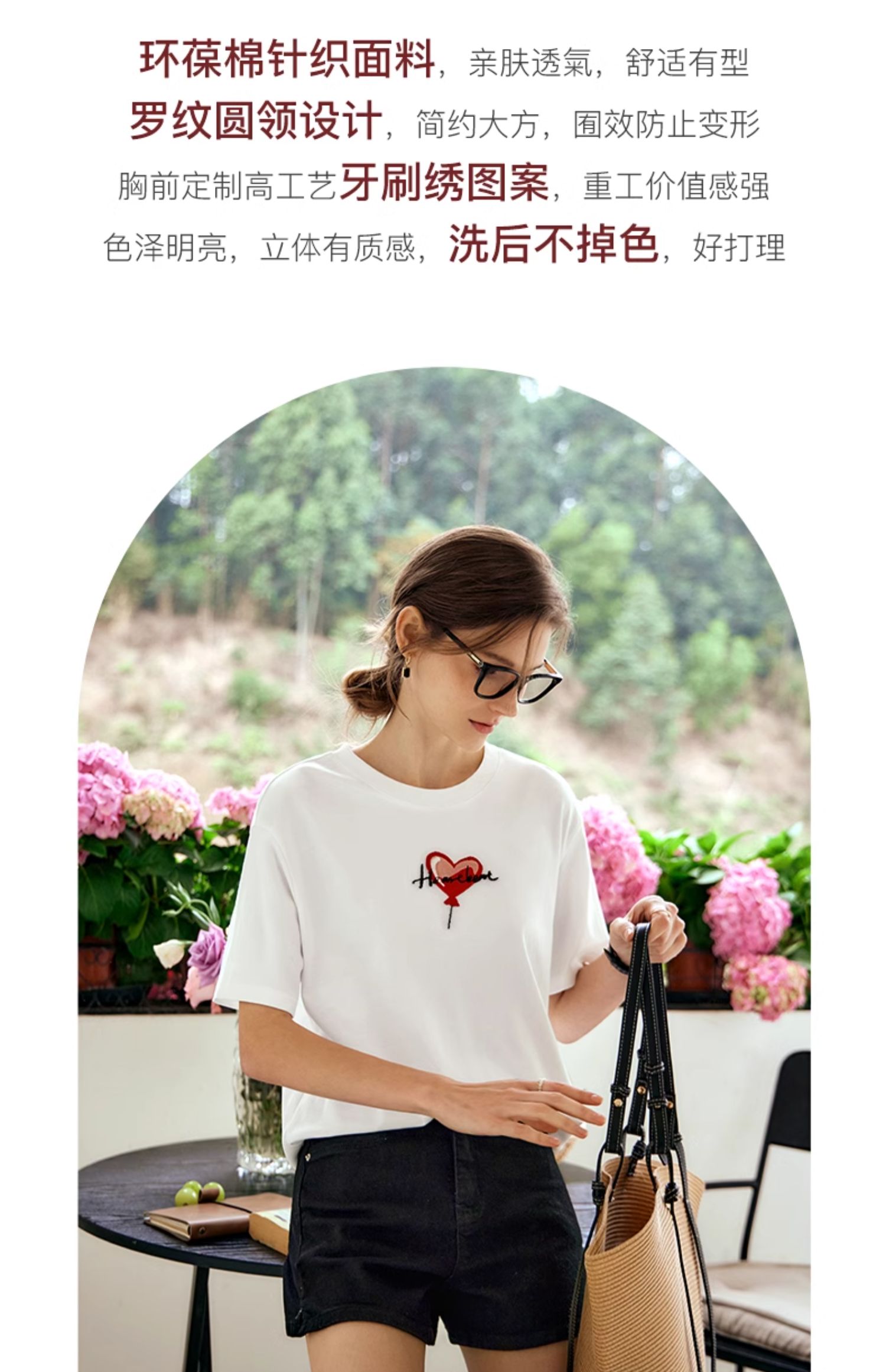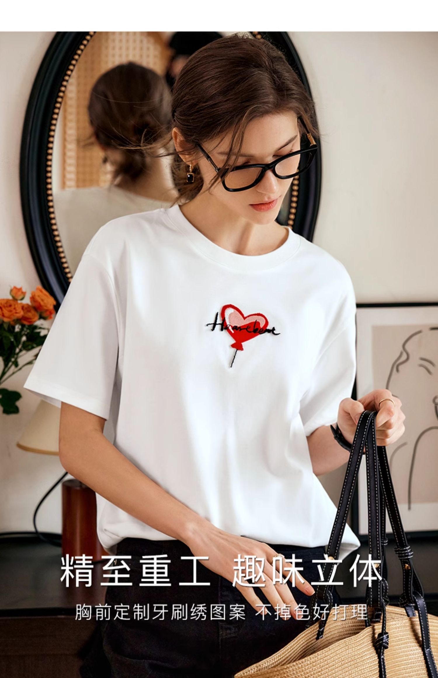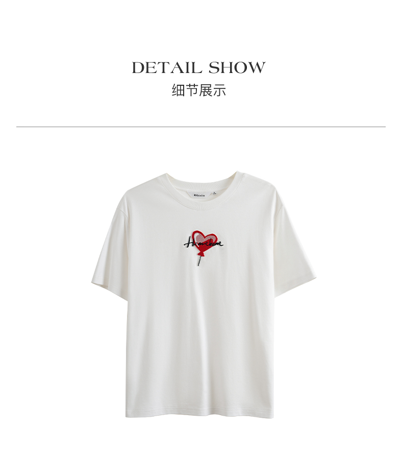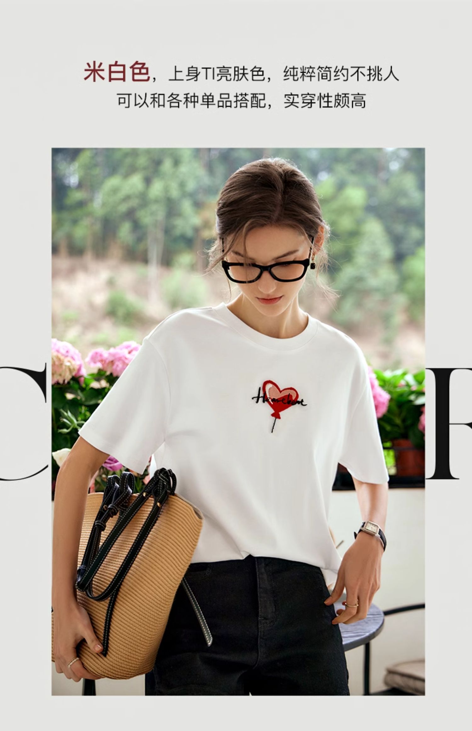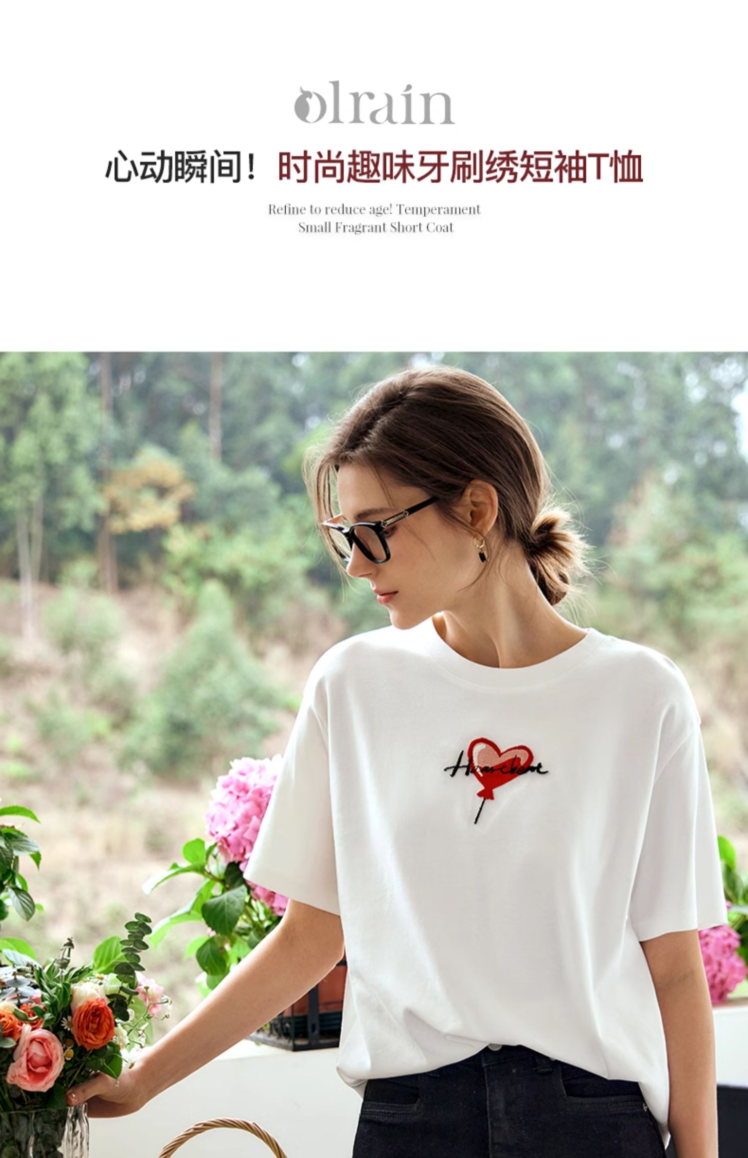 OLrain欧芮儿米白色短袖T恤女夏季2024新款时尚趣味刺绣圆领上衣