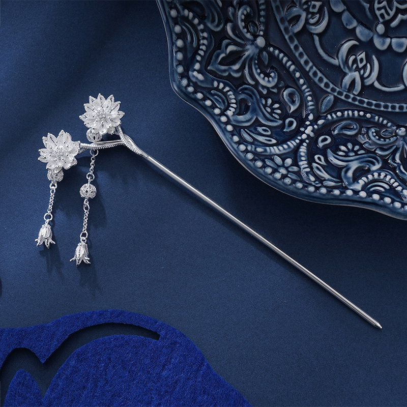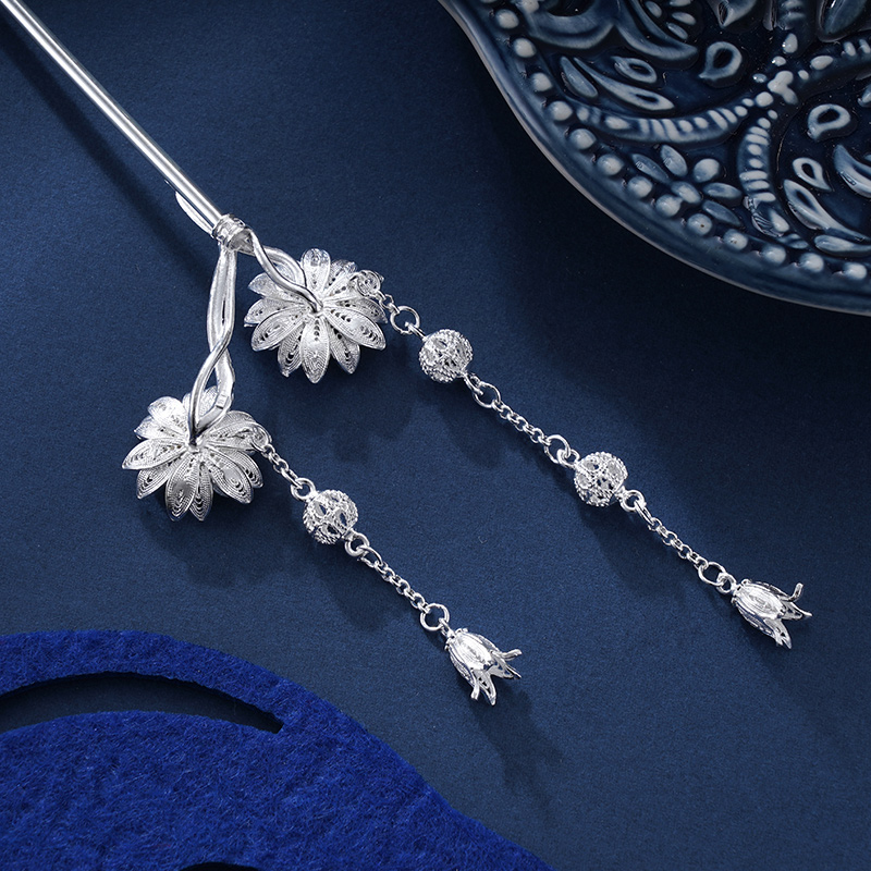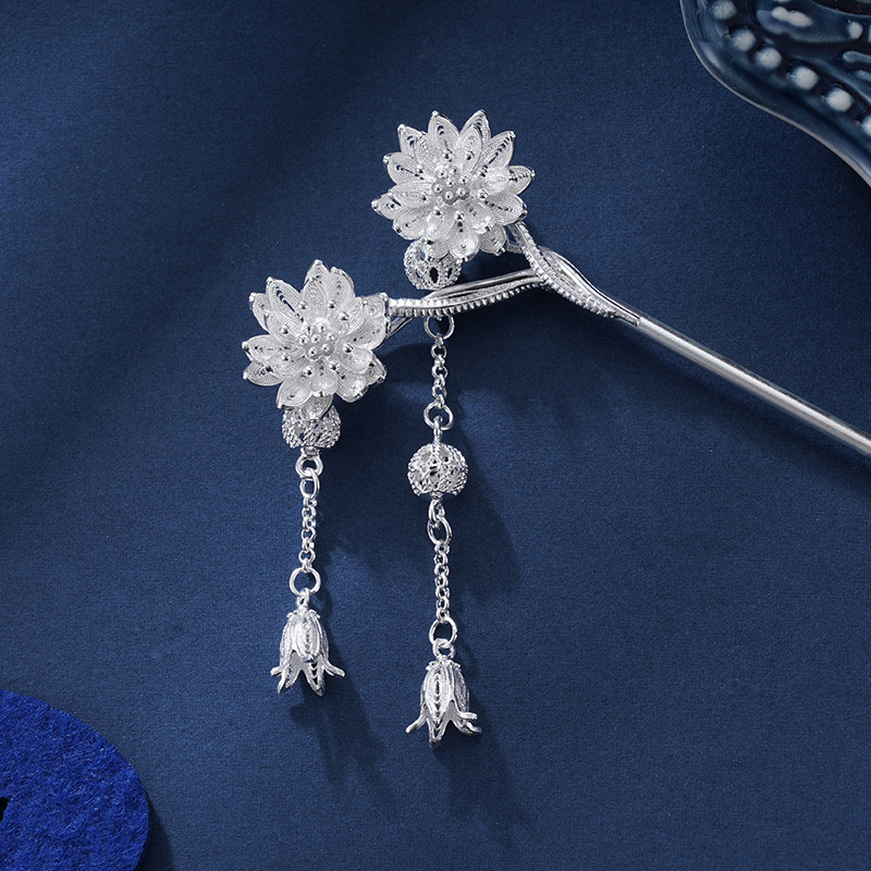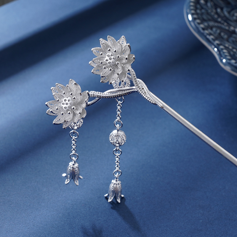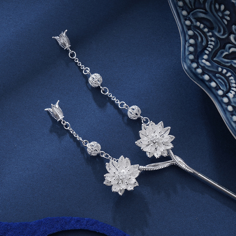 【寓意】:幽莲凌波绽放,细嗅清风入怀。发簪采用银花丝工艺编织勾勒,莲花层层优雅绽放,搭配流苏设计,恰似好运“连连”流动,尽显灵动之姿。
