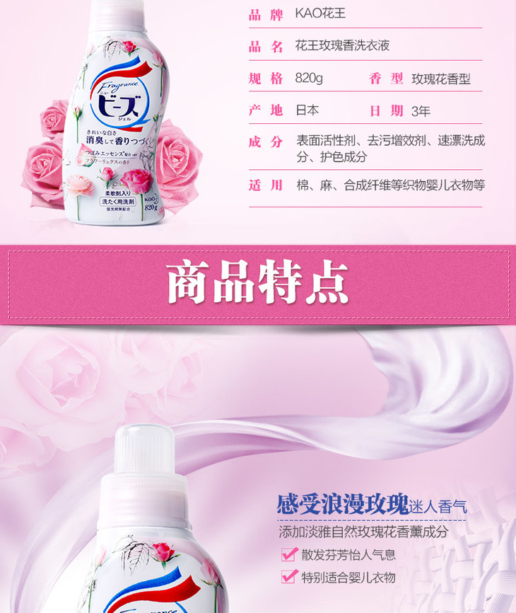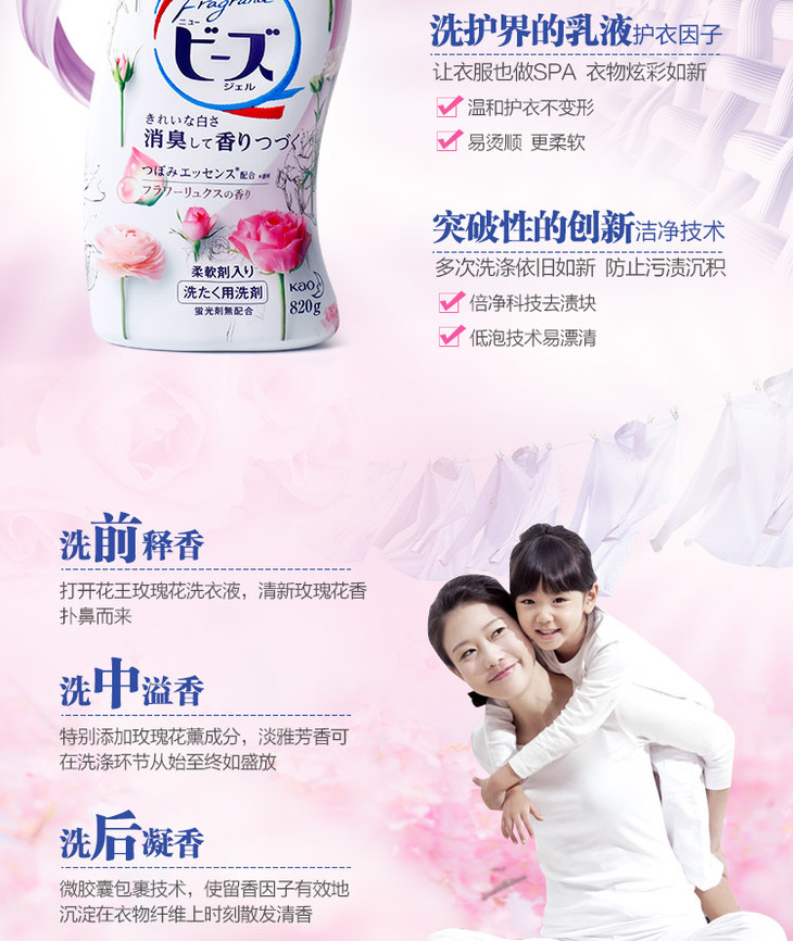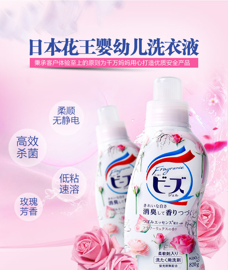 日本花王-天然柔顺剂洗衣液-宝宝衣物可用-玫瑰果香-新款780g/旧款820g-会员6折