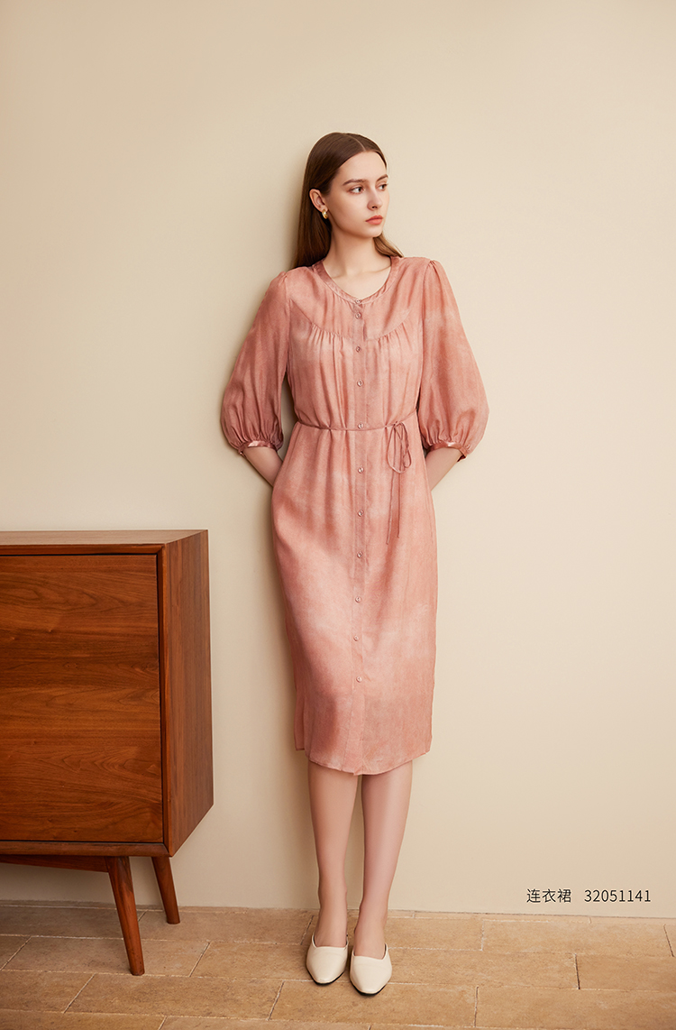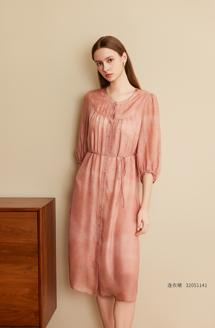 【圆领真丝衬衫裙】25年夏季新品女士100%桑蚕丝时尚七分袖系带收腰裙子