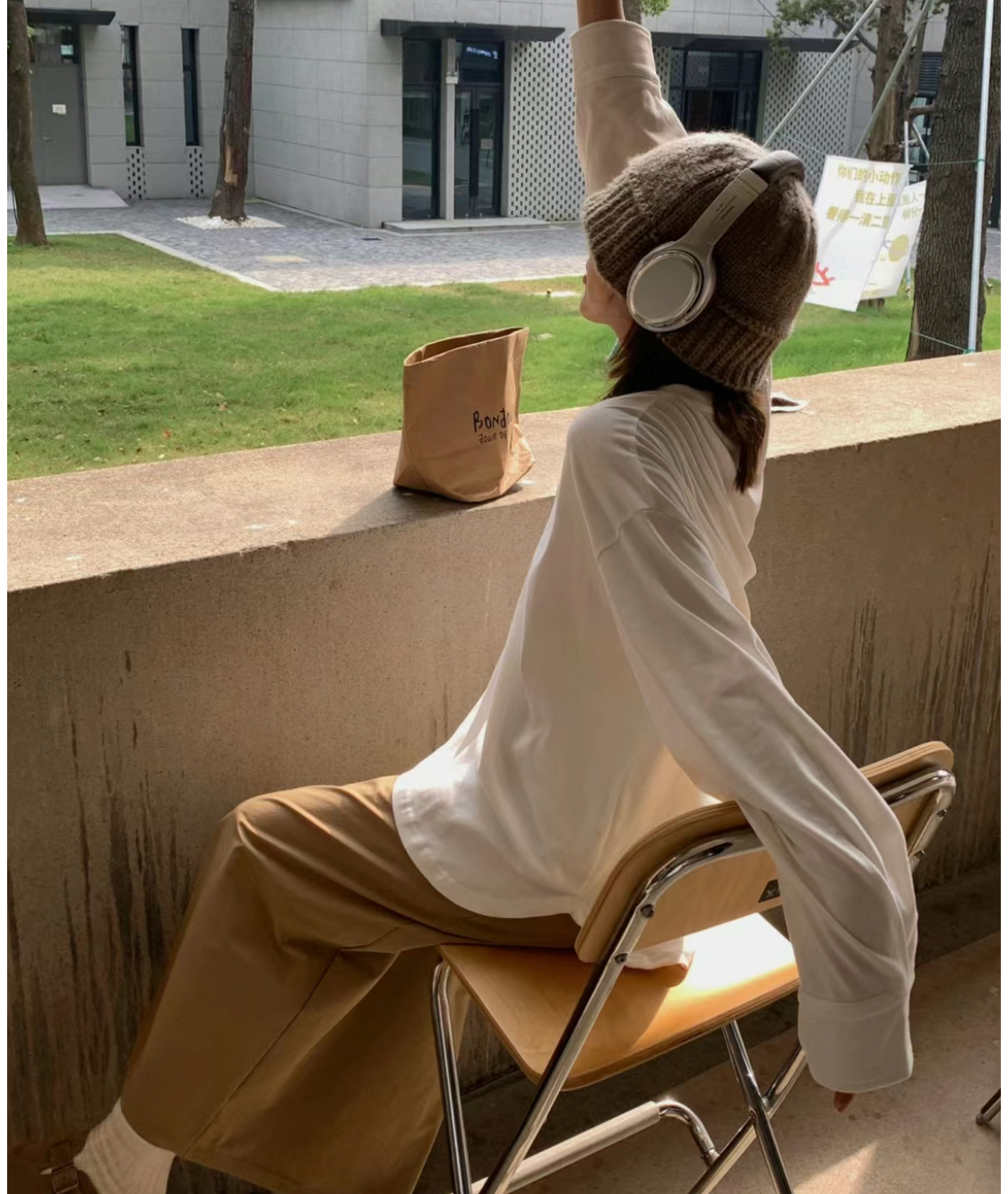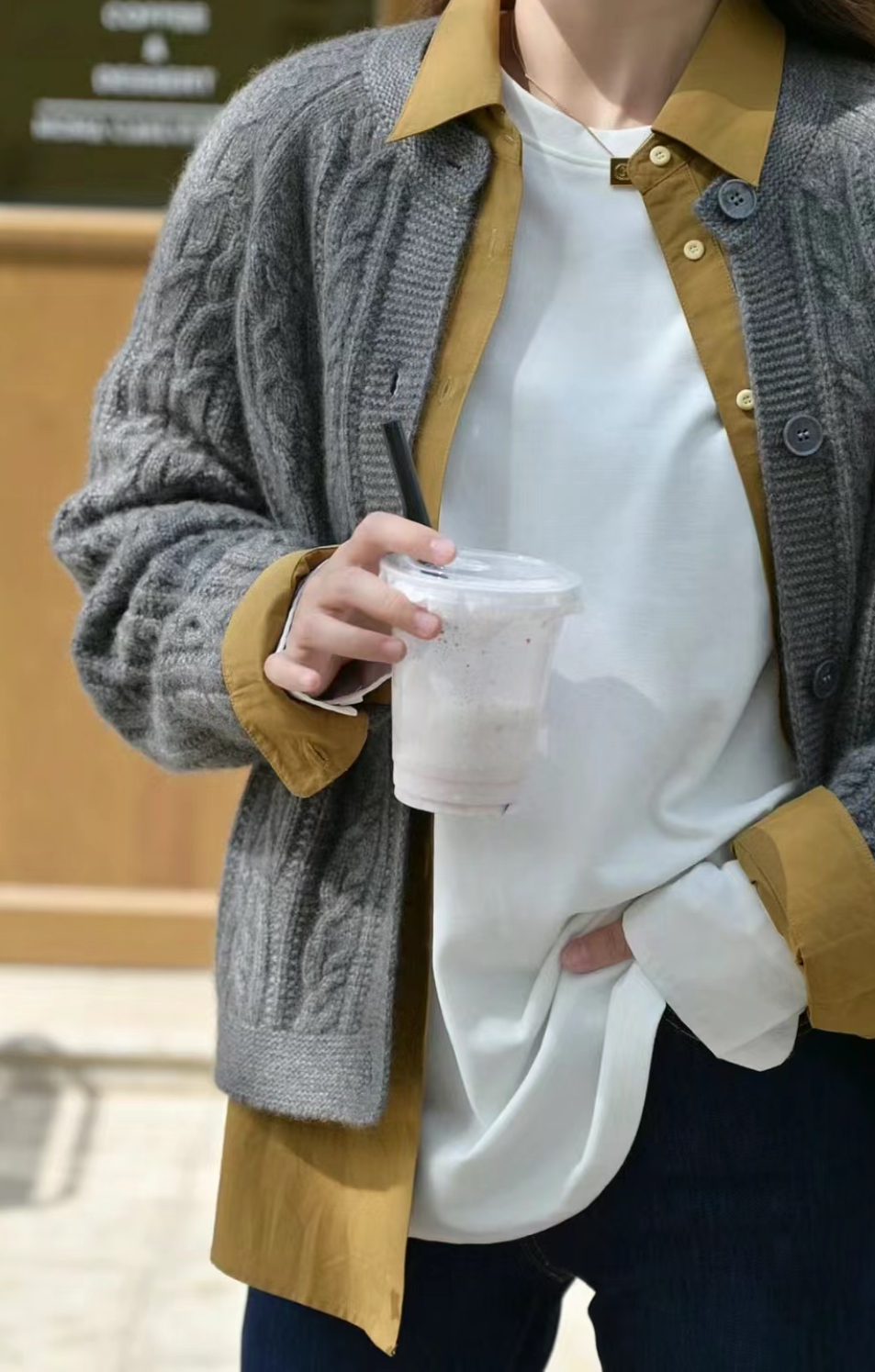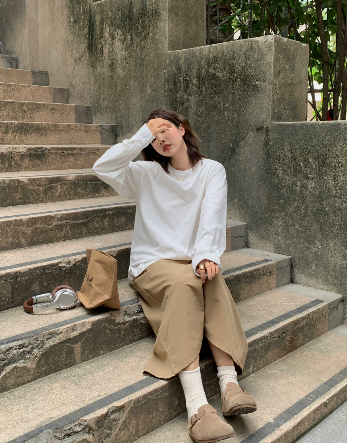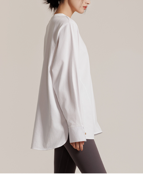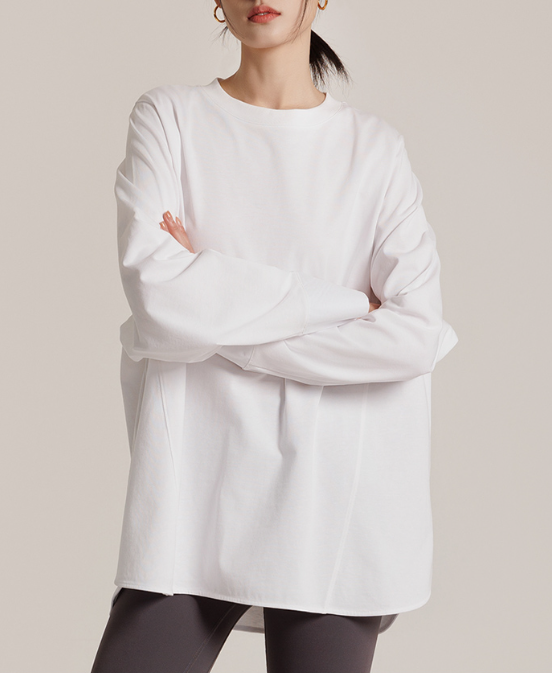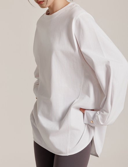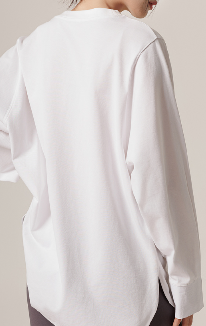 整体设计很简约,圆领,微微落肩袖,宽松的袖型袖口是衬衫袖克夫拼接,有点小亮点。圆弧下摆修饰腿型,从侧边看也更有造型感。这件带点小文艺风,单穿搭配都很实穿。也不挑身材。