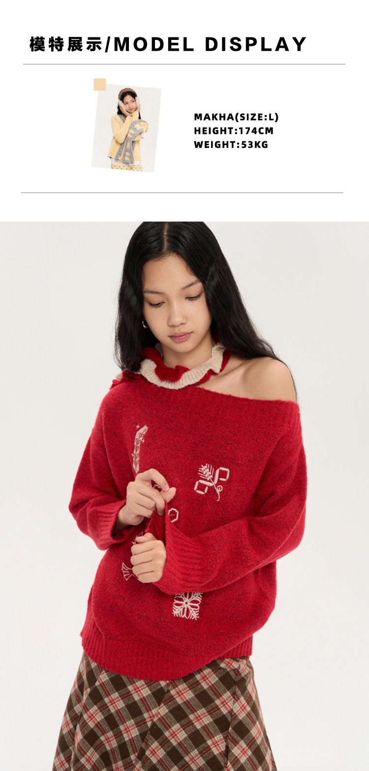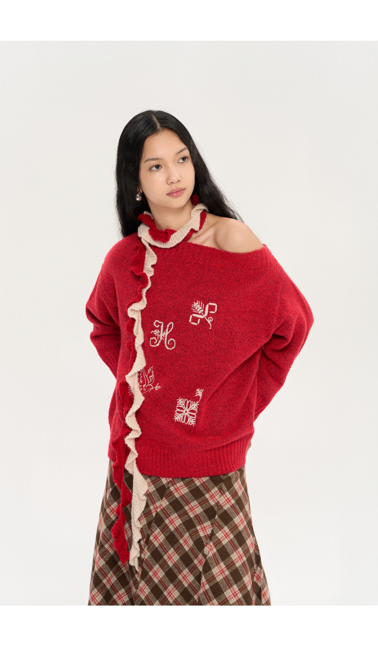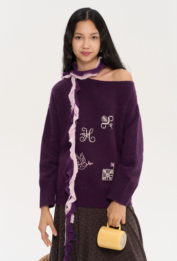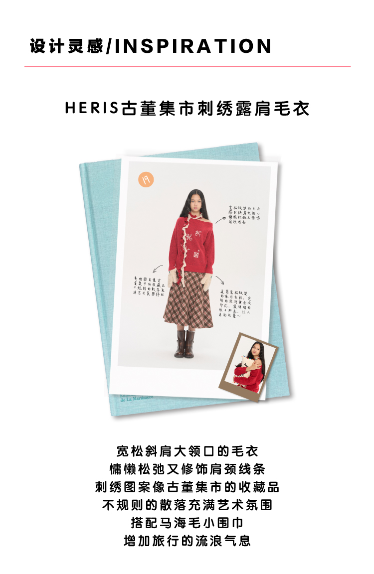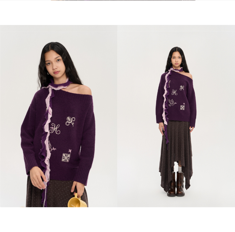 heris/H53104/流苏窄围巾搭配 古董集市刺绣 慵懒宽松露肩毛衣