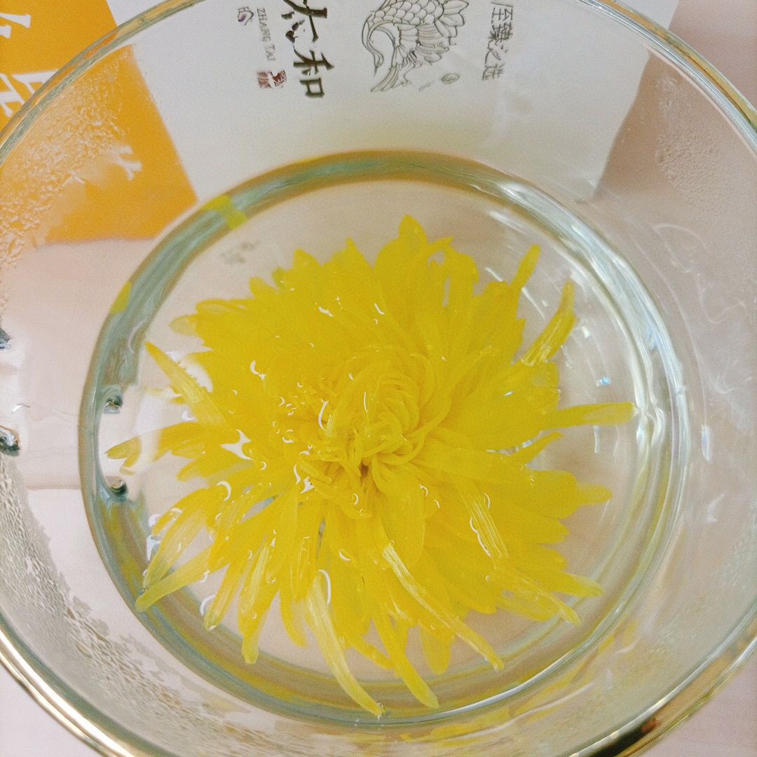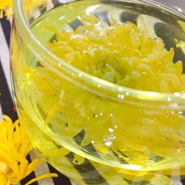 金丝皇菊需用100度的沸水冲泡,菊瓣入水,亮黄顷刻间弥漫开来,花瓣就会慢慢展开变得晶莹剔透。非常好看!