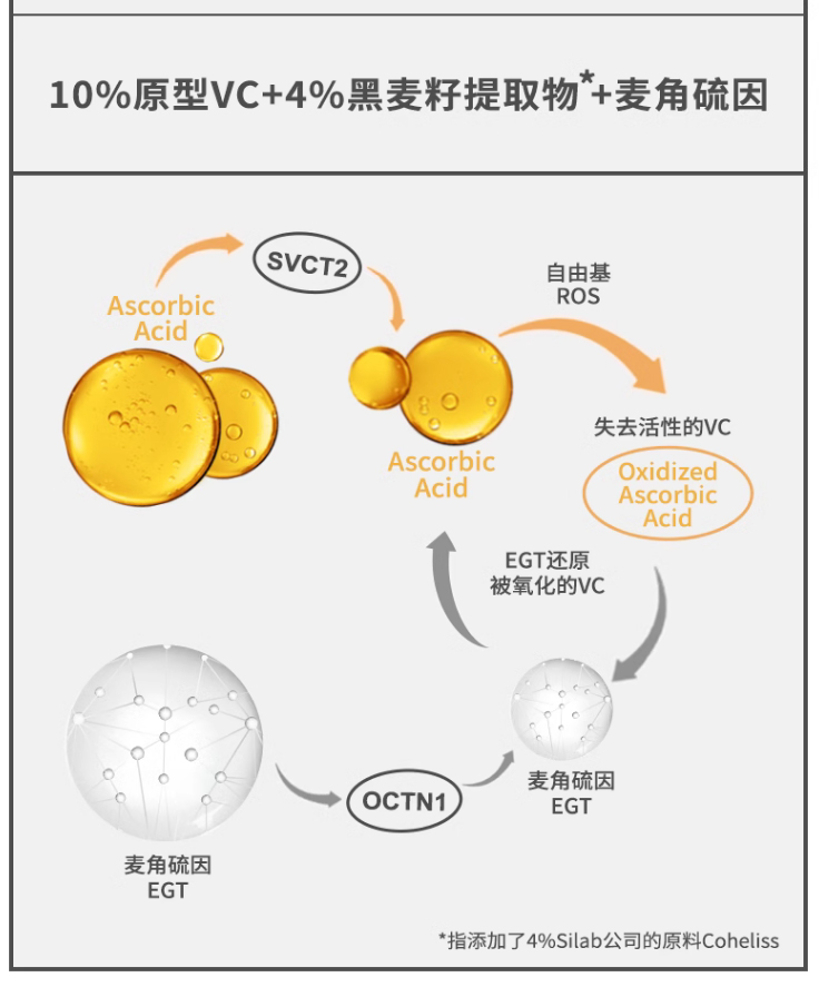 10%的VC浓度,还搭载了缓释技术,在低PH增强透皮效果的基础上复配了黑麦籽和麦角硫因来强化VC亢氧亢衰的效果,