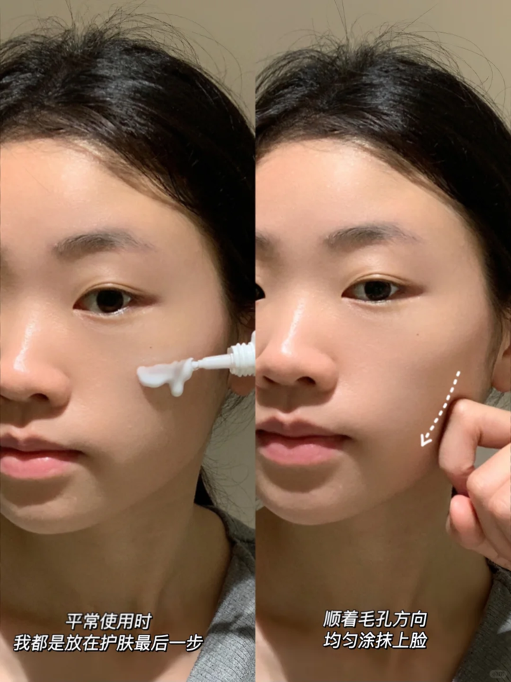取适量面霜顺着毛孔方向均匀涂抹上脸