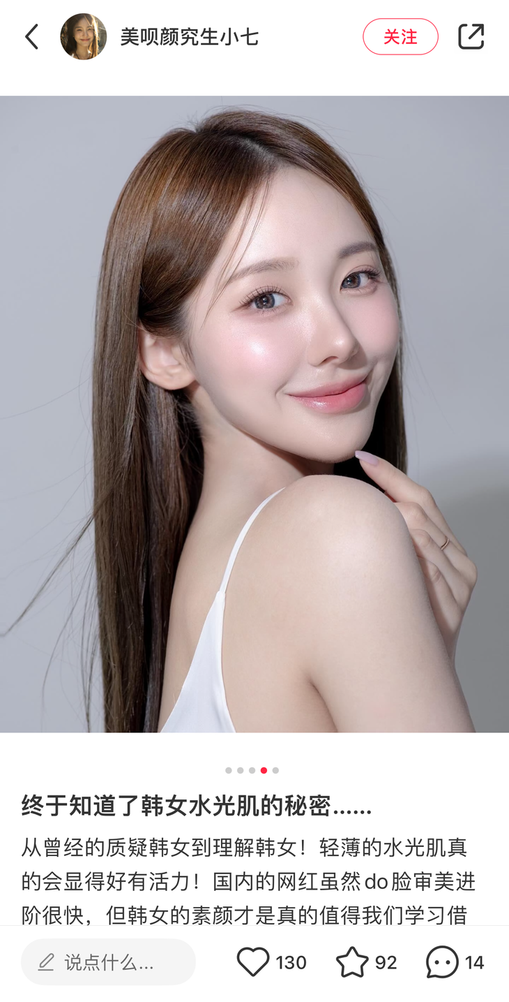 水光感是从皮肤深处透出来的通透光泽 就是皮肤超级好超级水润的那种