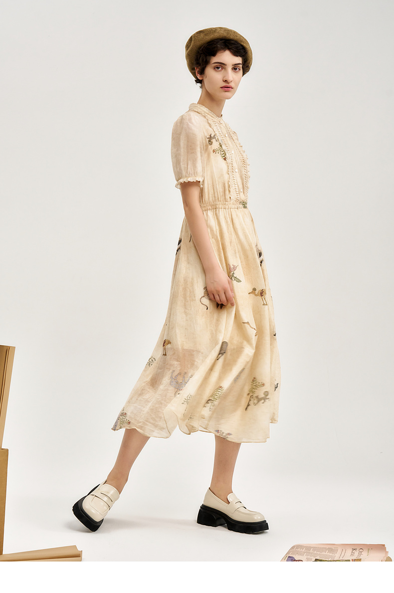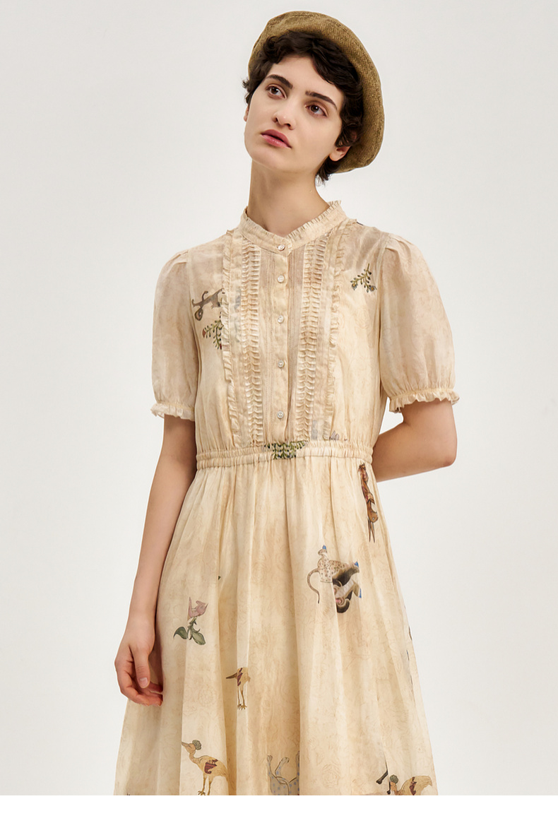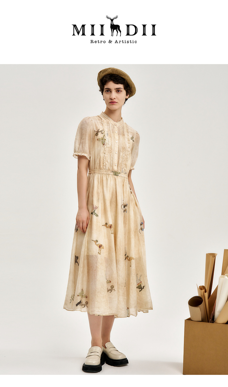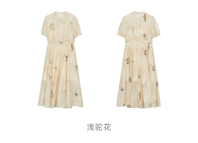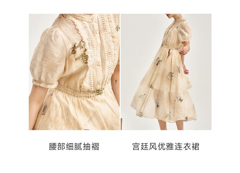 谜底印花连衣裙短袖2024秋季新品优雅气质小立领长裙243ML1080