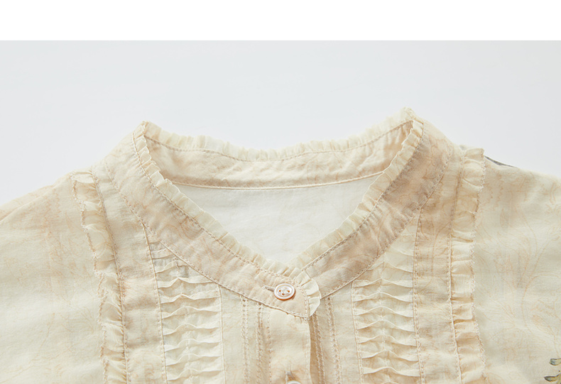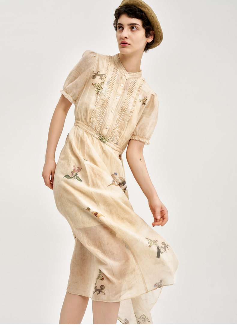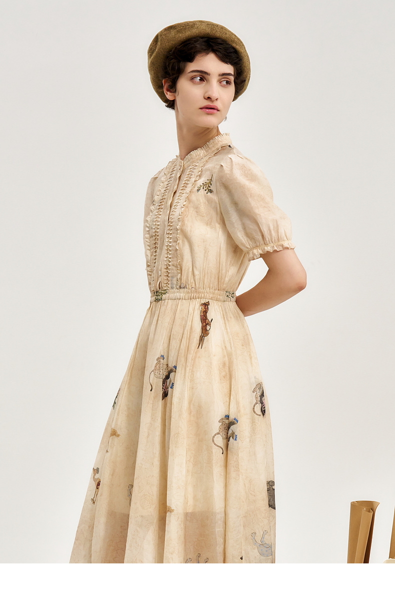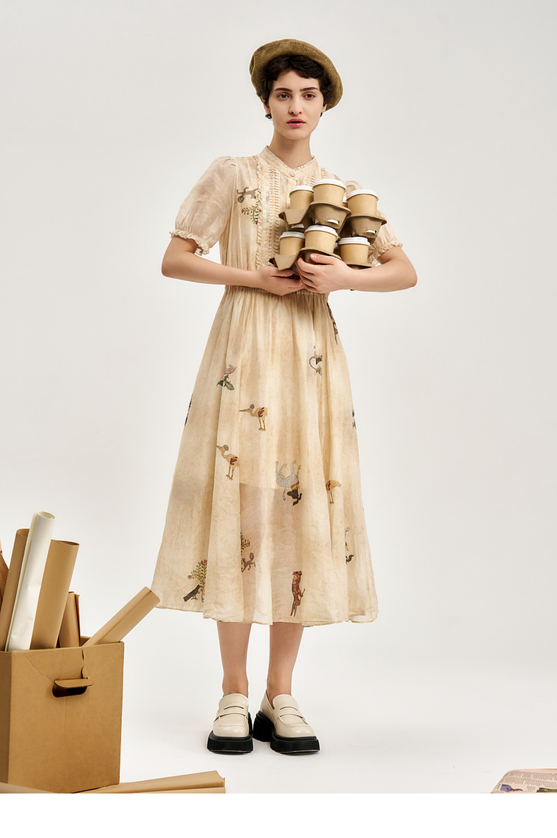 谜底印花连衣裙短袖2024秋季新品优雅气质小立领长裙243ML1080