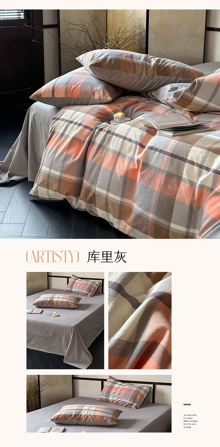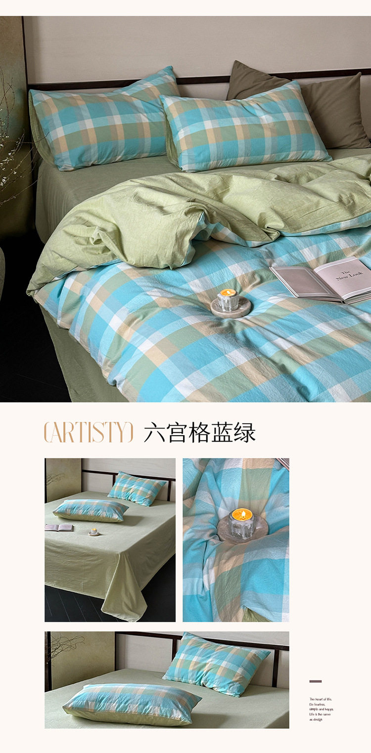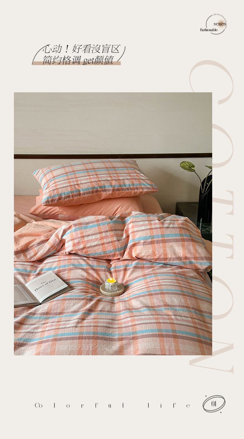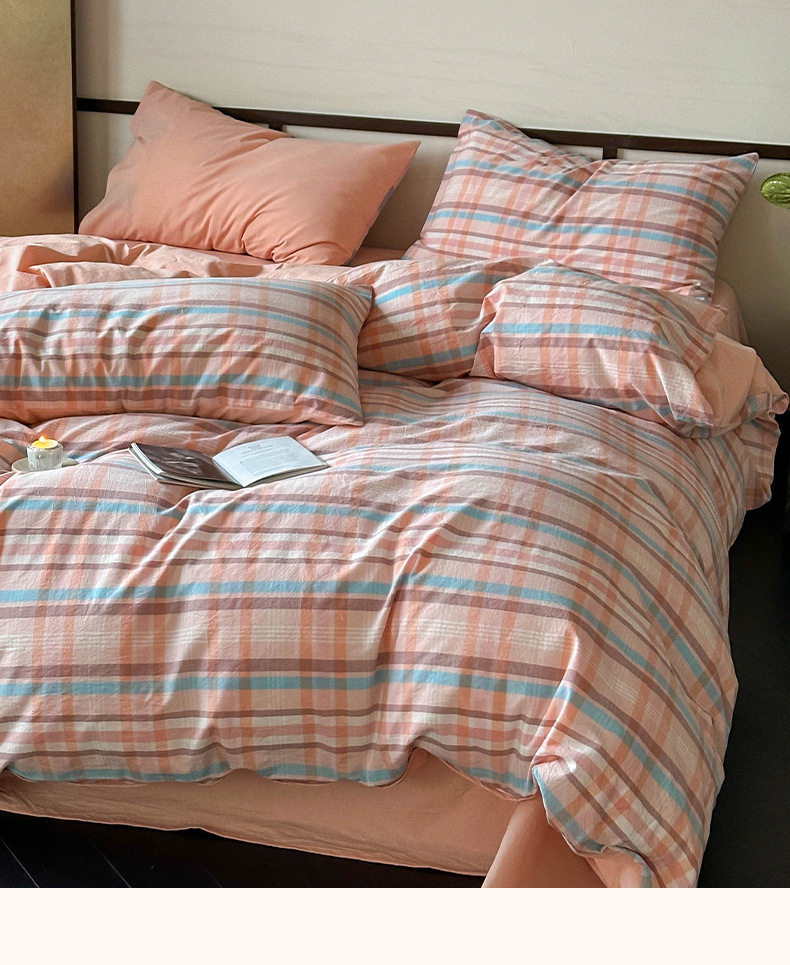 日式无印全棉水洗棉四件套良品格纹床品套件简约民宿酒店4件套