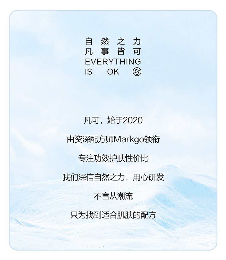 - 凡可是由从事化妆品研发15年的专业配方师-Markgo创立的新锐护肤品牌,以敏肌为核心提供敏肌进阶多方位功效护肤方案。