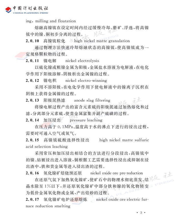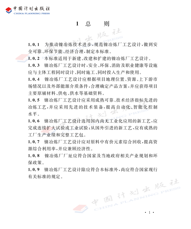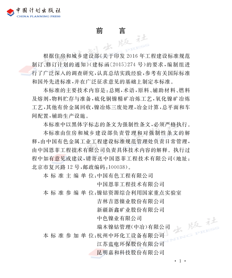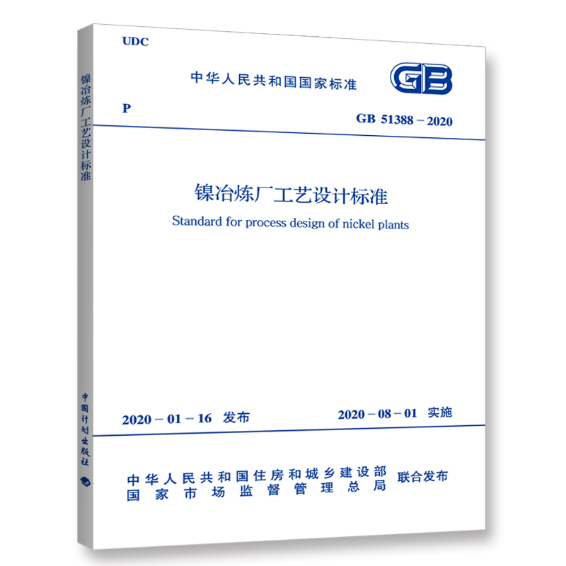 现批准《镍冶炼厂工艺设计标准》为国家标准,编号为GB51388—2020,自2020 年8 月1 日起实施。其中,第5.1.2(12)、5.1.3(11、12、13、14)、5.2.1(7)、5.2.2(3)、5.5.2(3)、6.1.2(3)、6.2.7(4)、10.1.8、10.1.9、10.3.2(3)条为强制性条文,必须严格执行。
