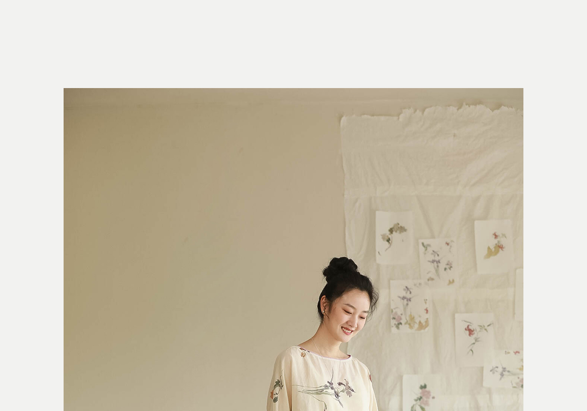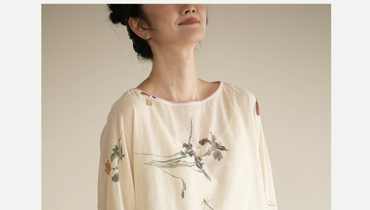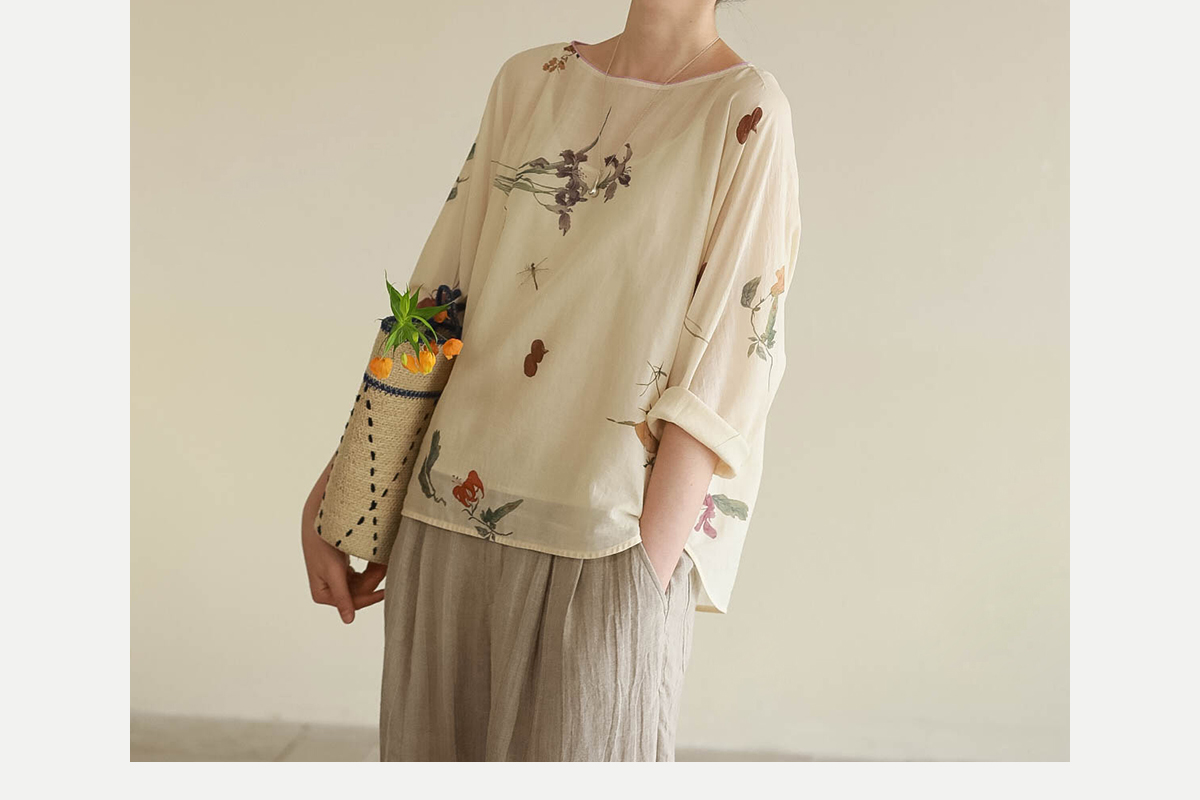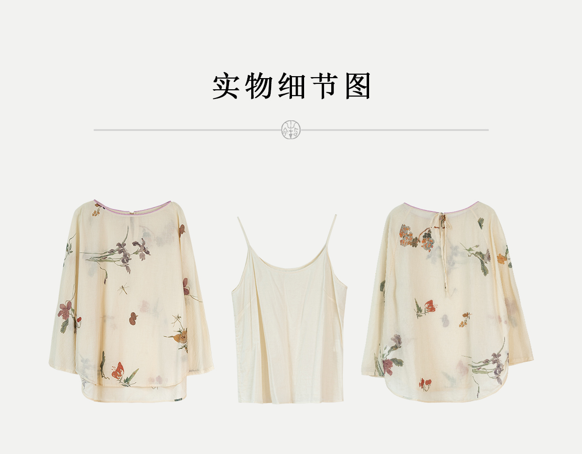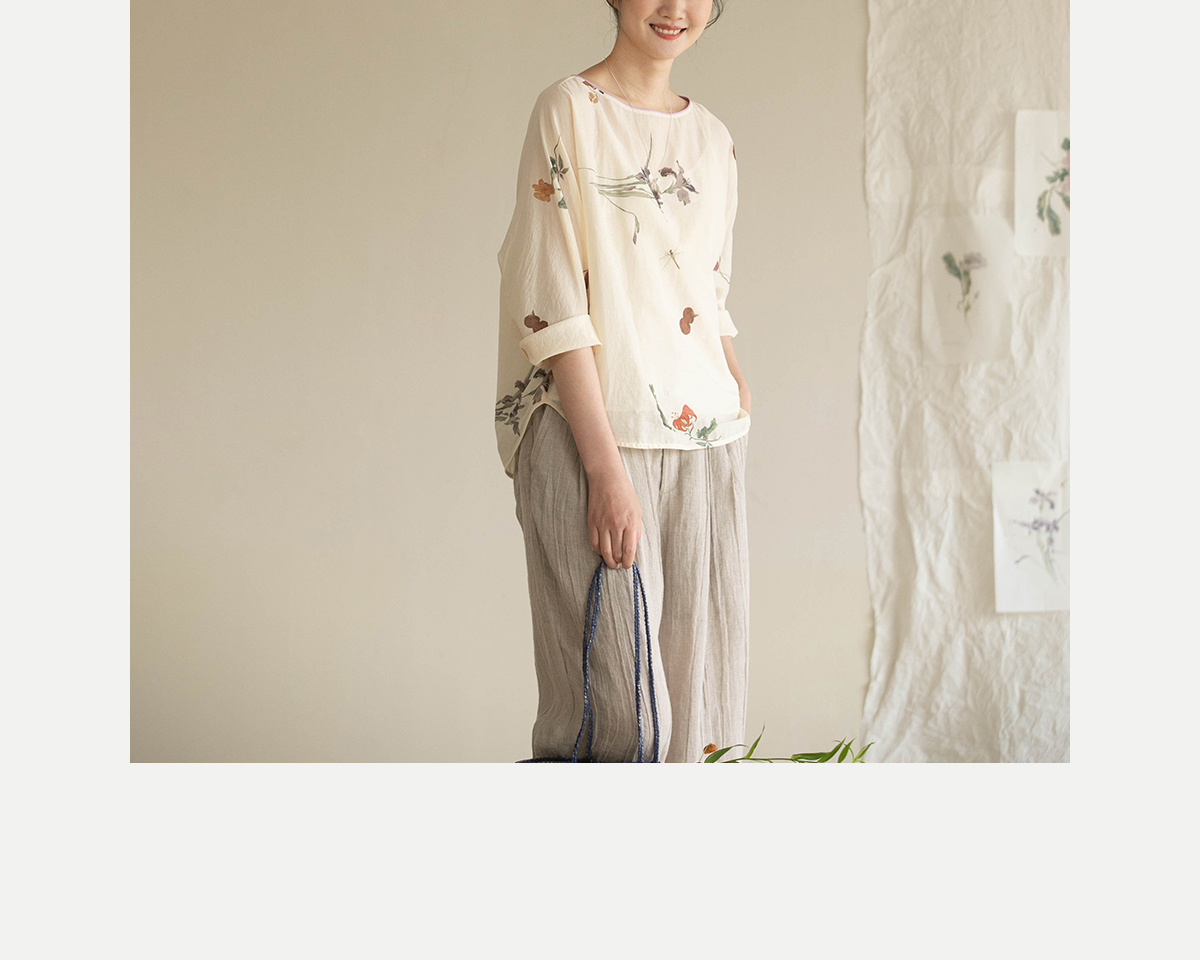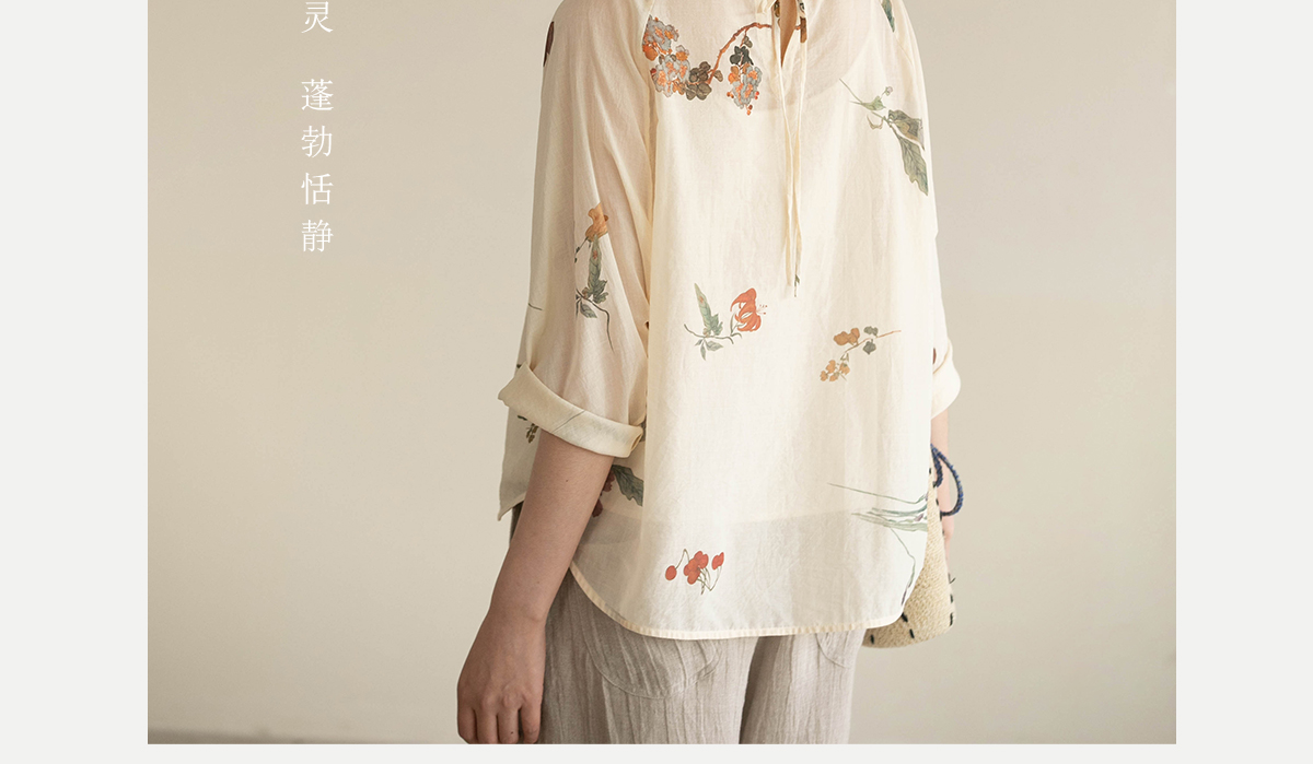 牧衣游原创 新疆棉印花套头衫轻薄国画七分袖圆领文艺上衣 清规