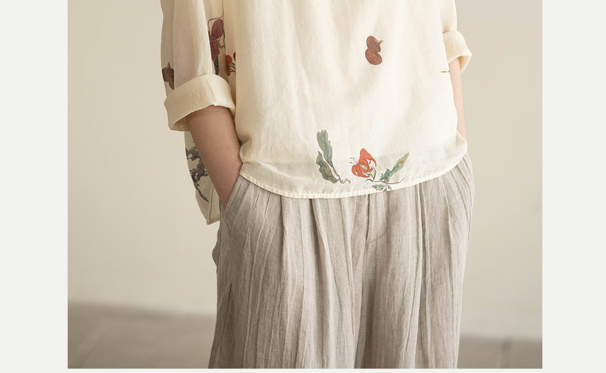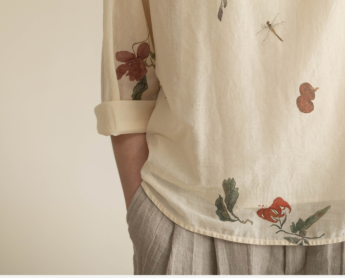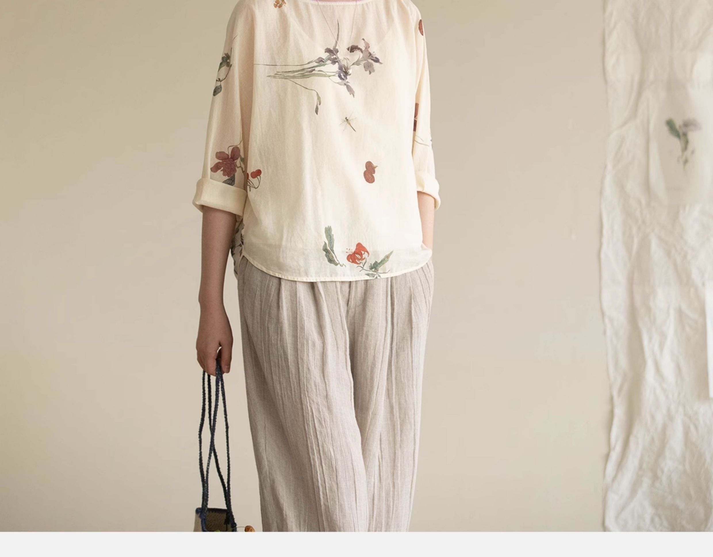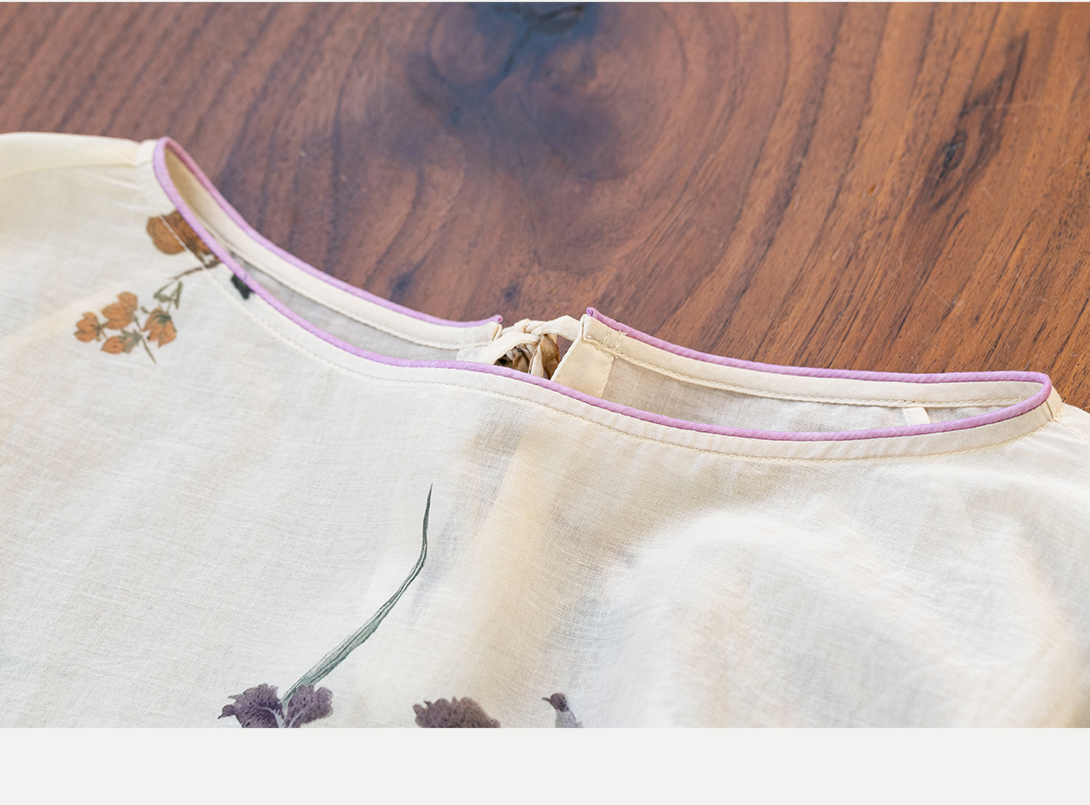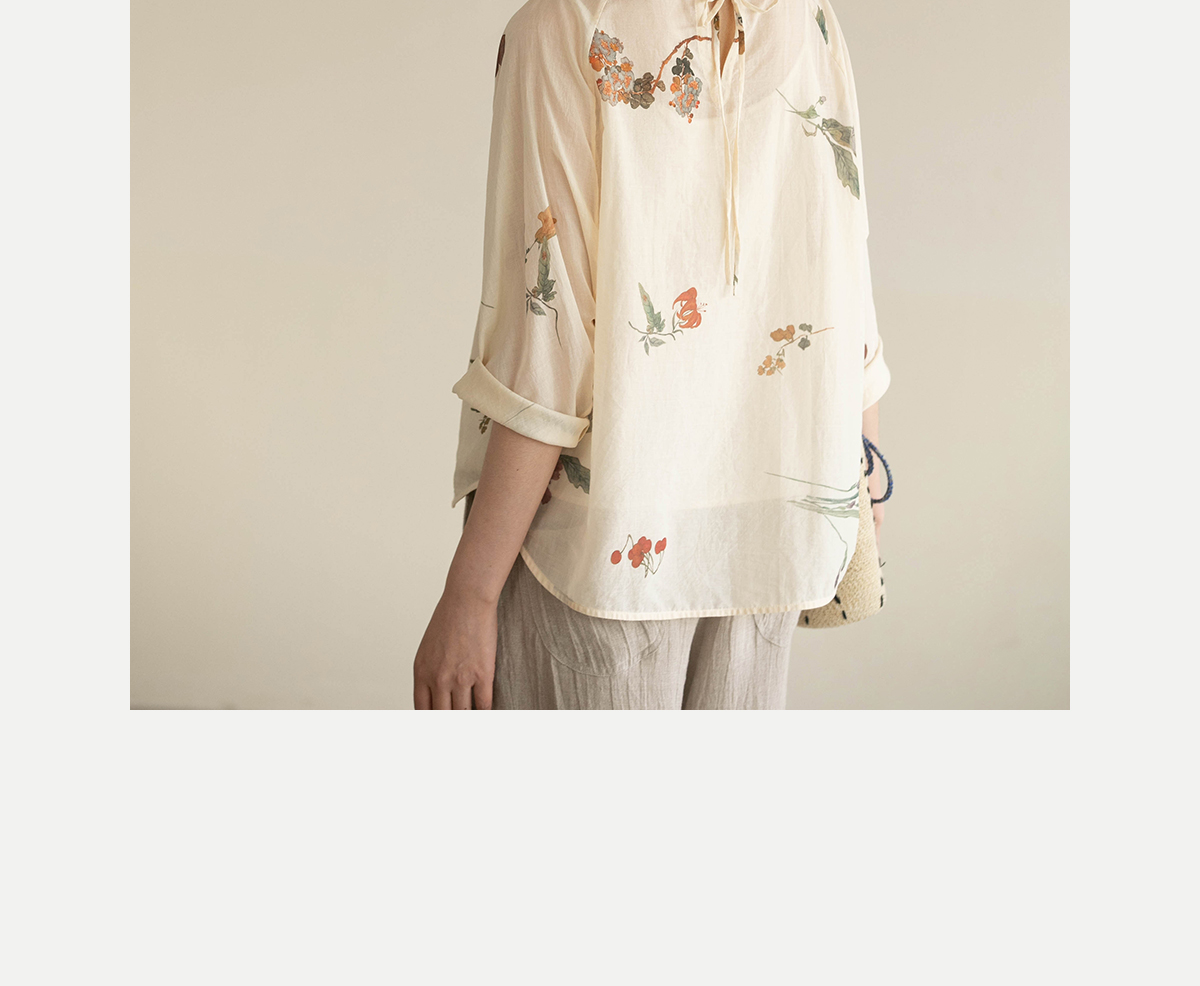 牧衣游原创 新疆棉印花套头衫轻薄国画七分袖圆领文艺上衣 清规